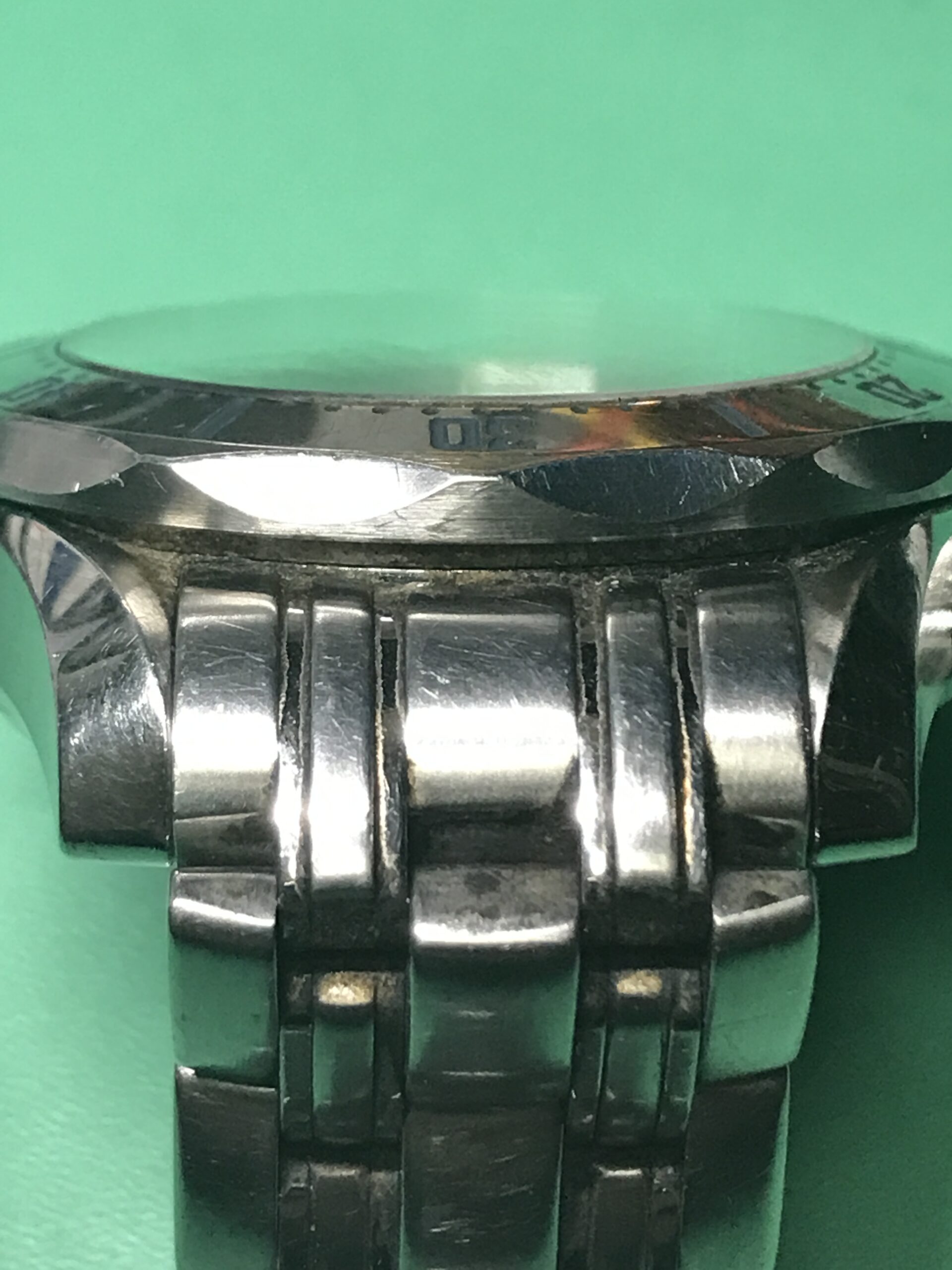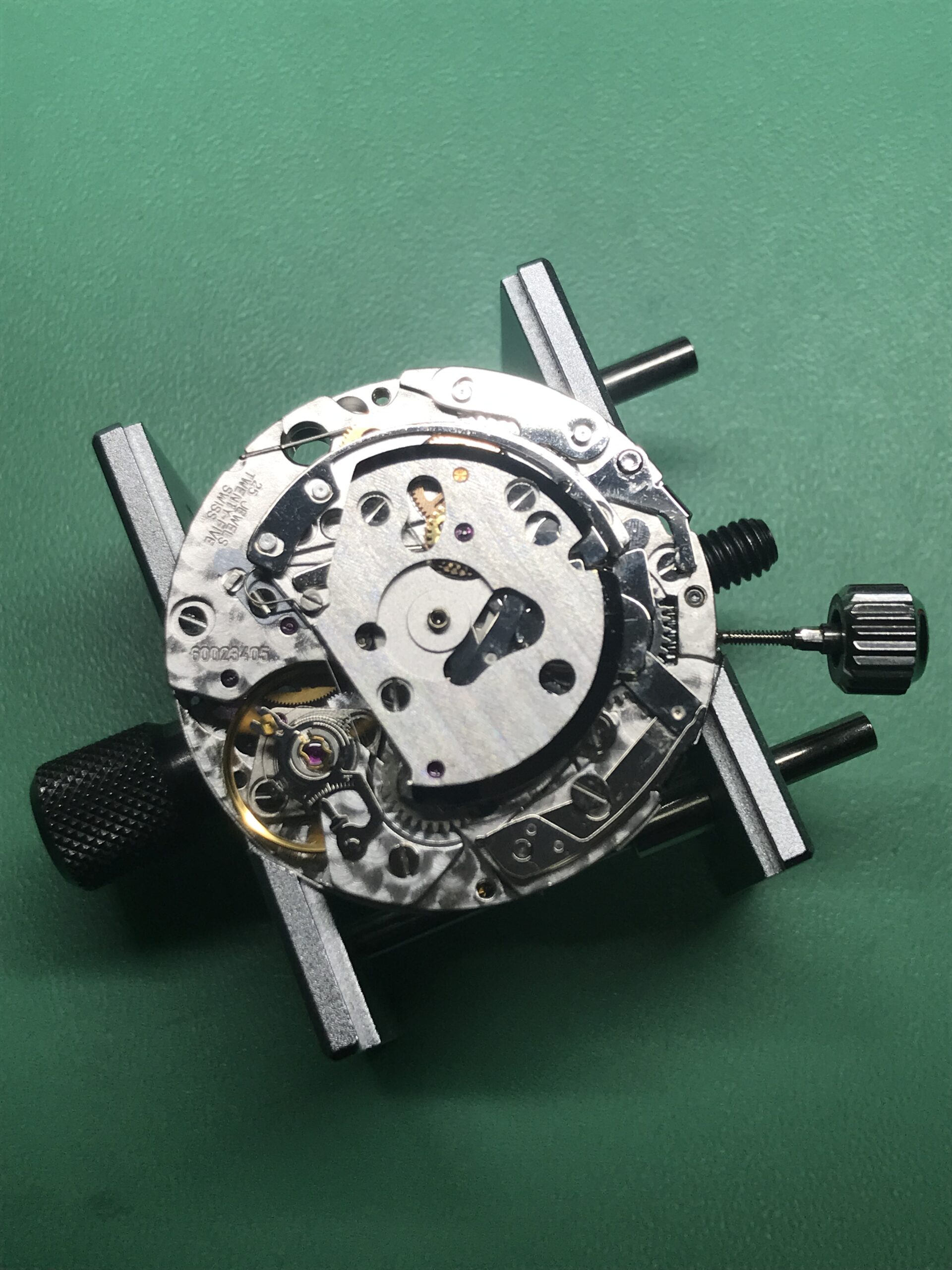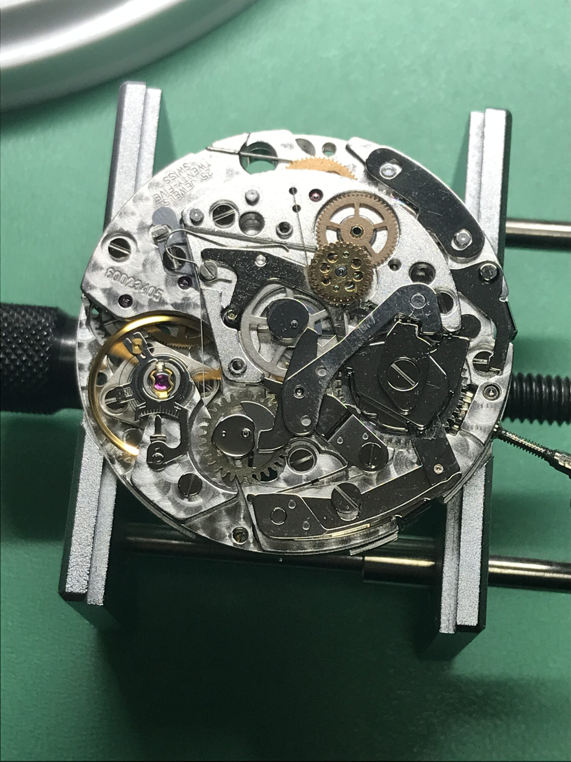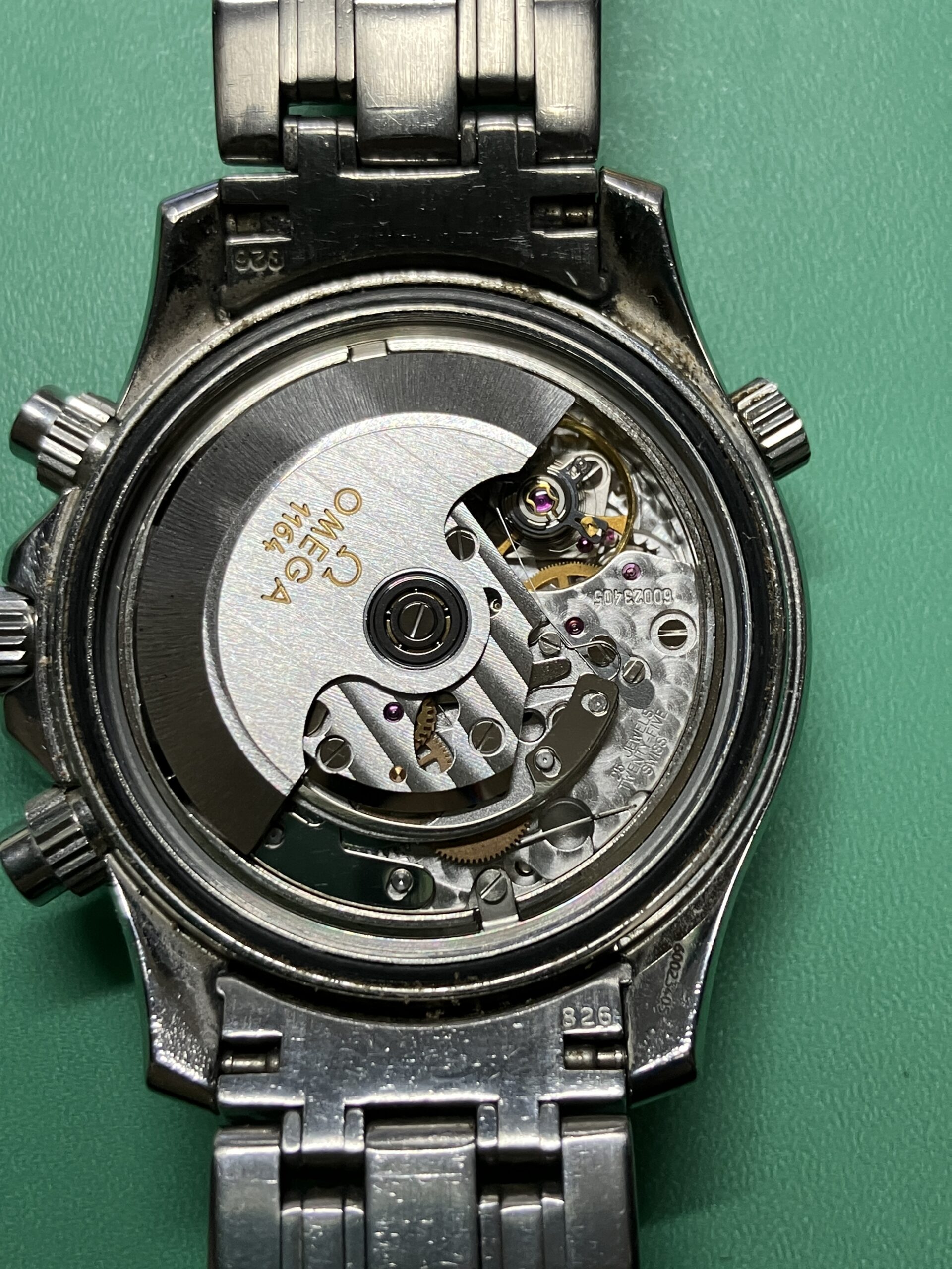 長い間メンテナンスがされていない状態でしたので、ブレスレットの12時側のバネ棒は固着して取り外しができませんでした。(これにより、シリアルナンバーが確認できませんでした。)また稼働はするものの、タイムグラファーの測定では3分〜10分/日に遅れ、また機械式時計の健康状態の目安となるテンプの動きも、振り角が130°前後というかなり悪い状態でした。ムーブメントに何か問題があるかと心配でしたが、幸い部品の不良もなく、分解、洗浄、注油、組立のオーバーホールでかなり良い精度に戻すことができました。