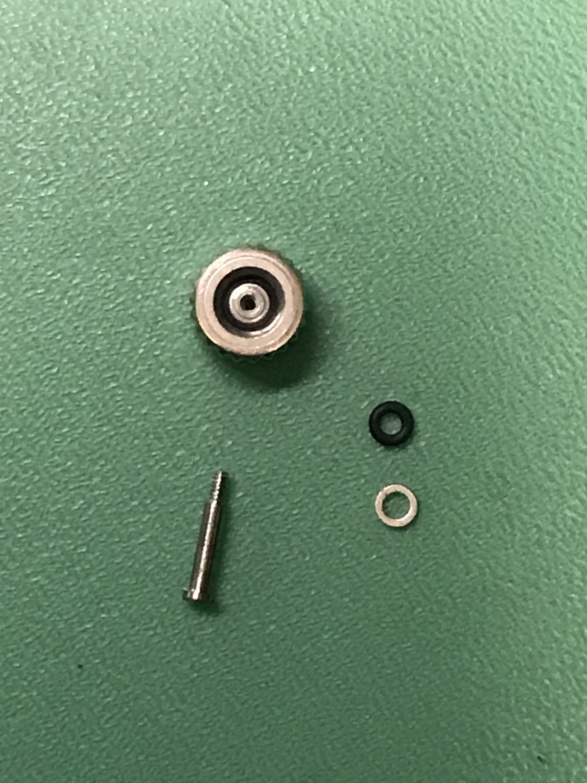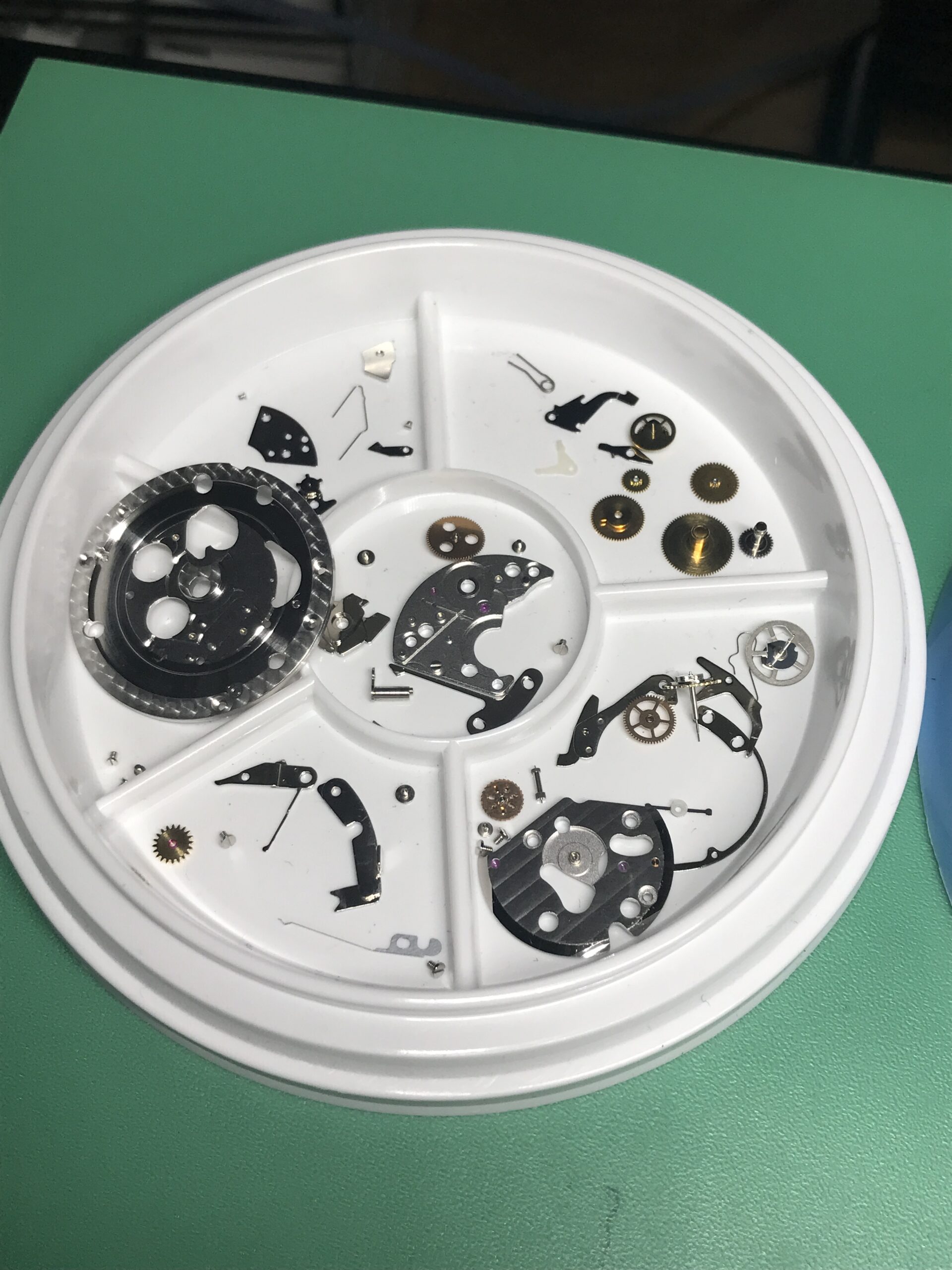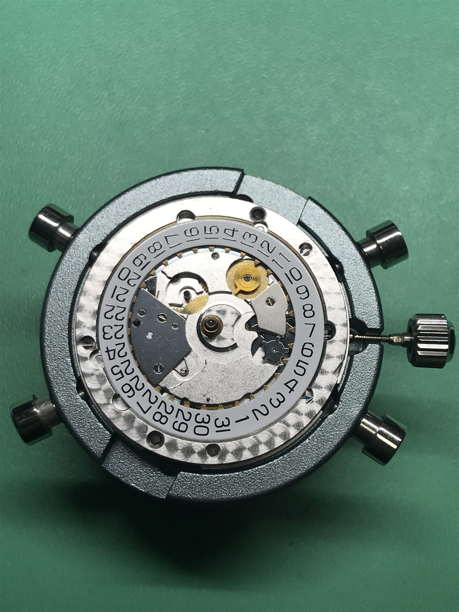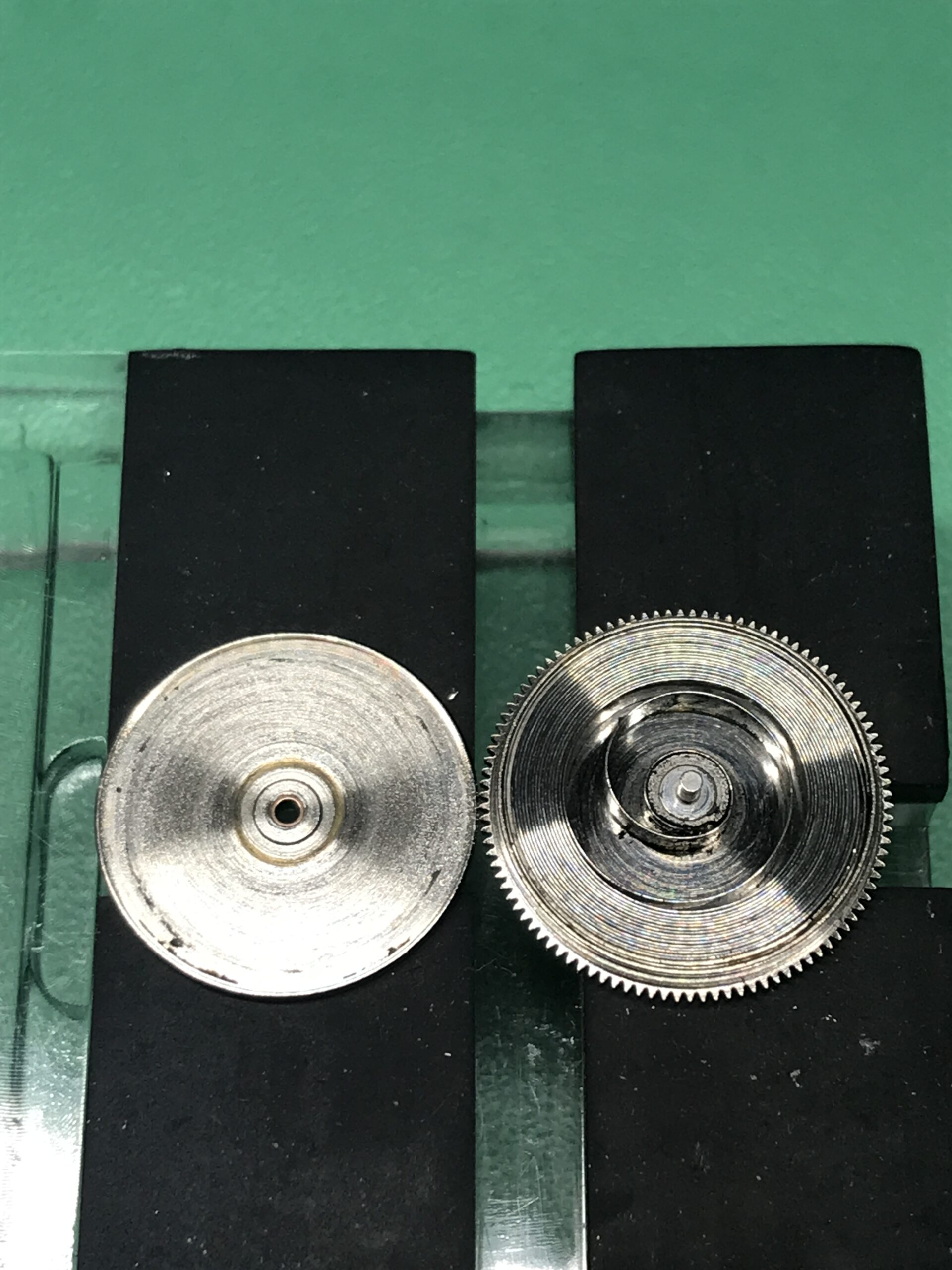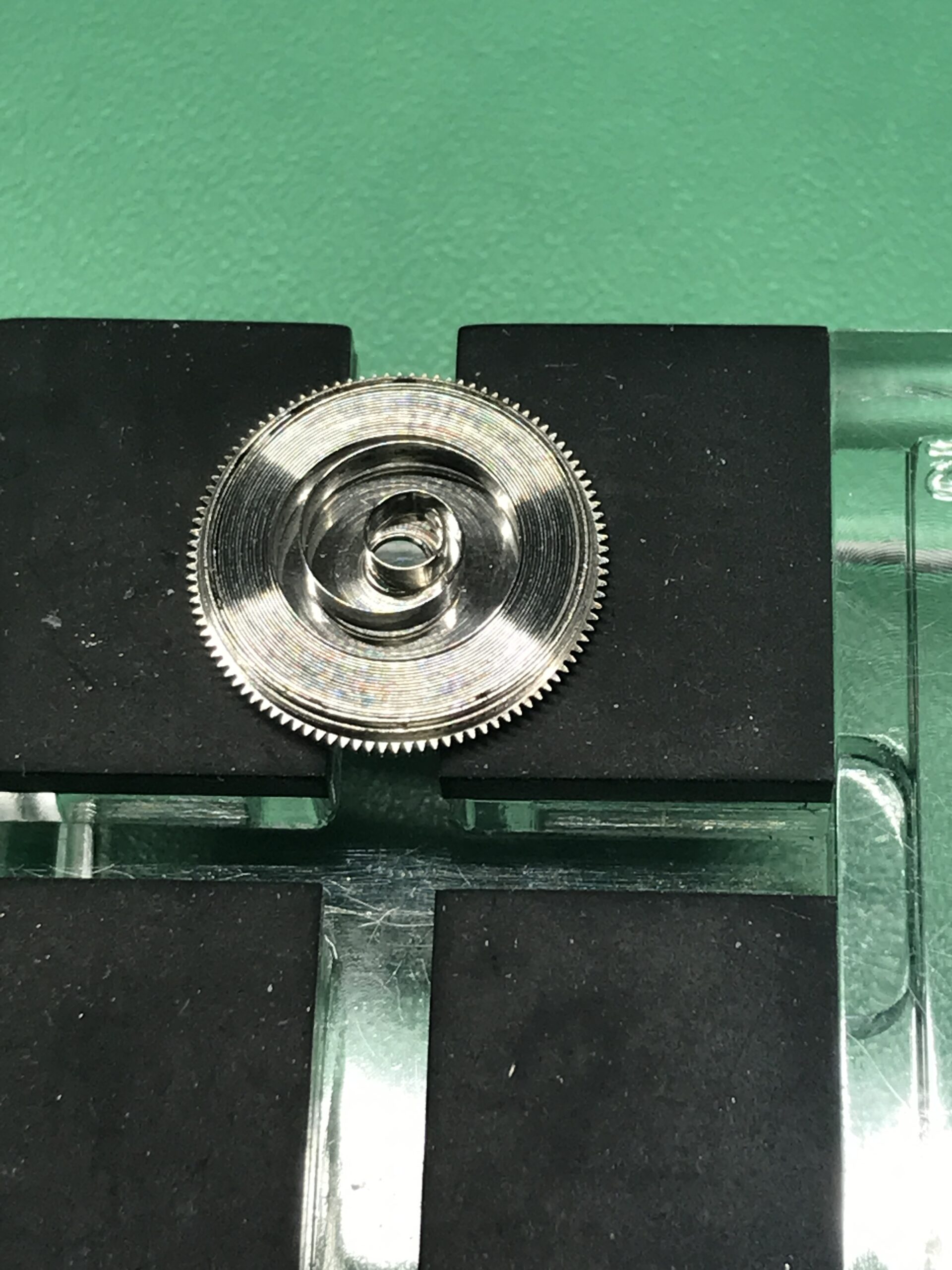 長い間メンテナンスがされていない状態でしたので、ブレスレットの12時側のバネ棒は固着して取り外しができませんでした。(これにより、シリアルナンバーが確認できませんでした。)また稼働はするものの、タイムグラファーの測定では3分〜10分/日に遅れ、また機械式時計の健康状態の目安となるテンプの動きも、振り角が130°前後というかなり悪い状態でした。ムーブメントに何か問題があるかと心配でしたが、幸い部品の不良もなく、分解、洗浄、注油、組立のオーバーホールでかなり良い精度に戻すことができました。