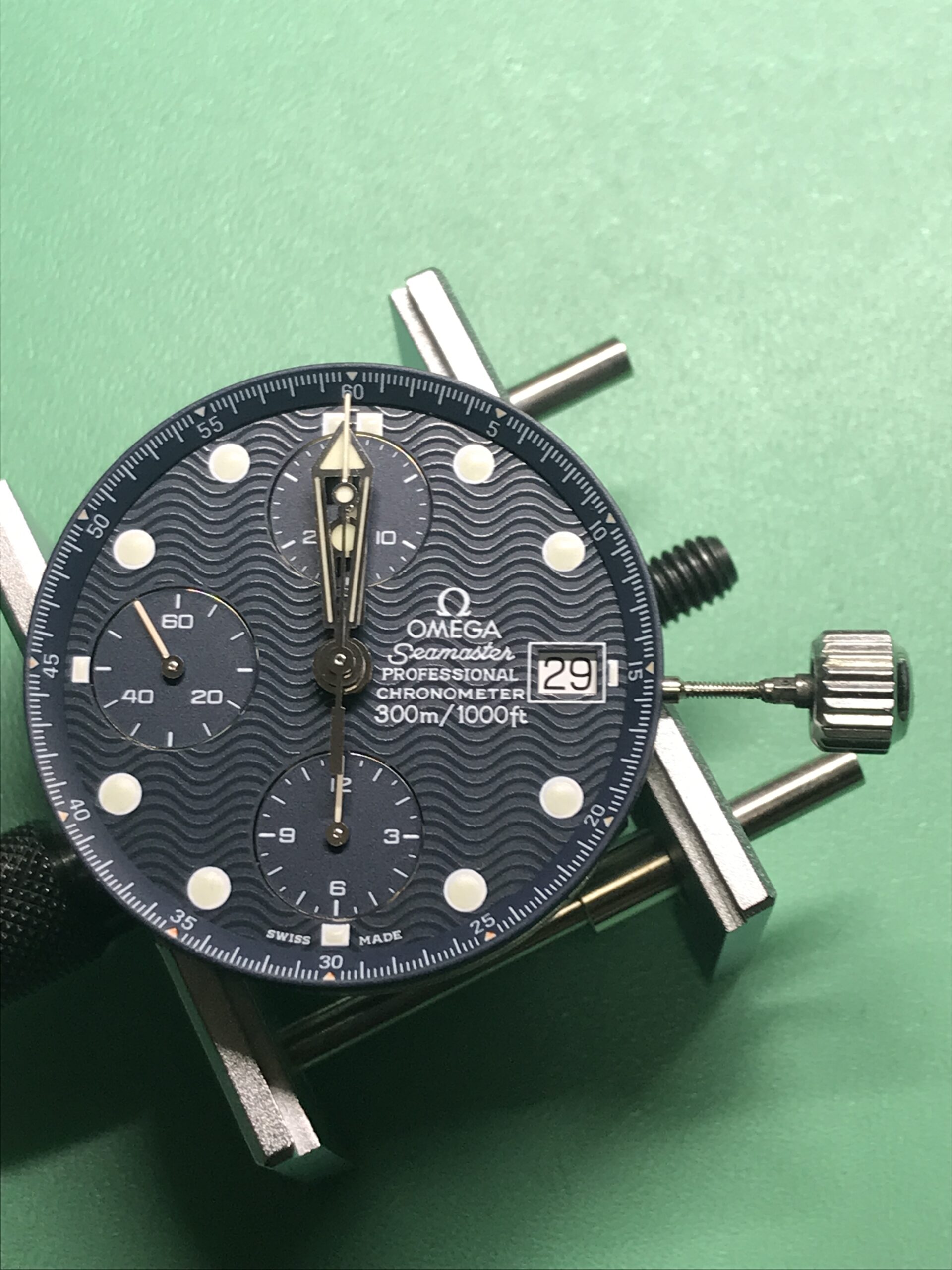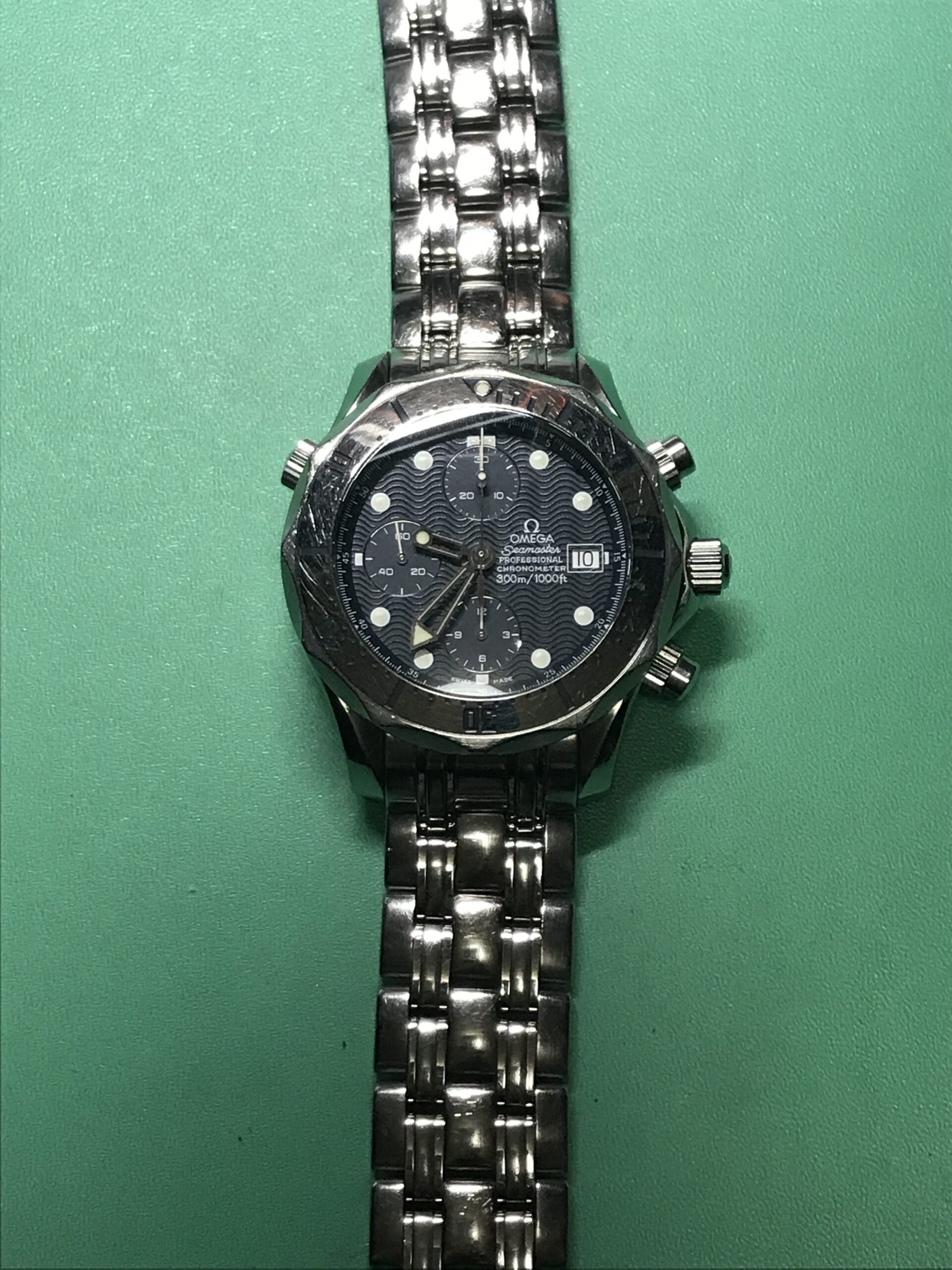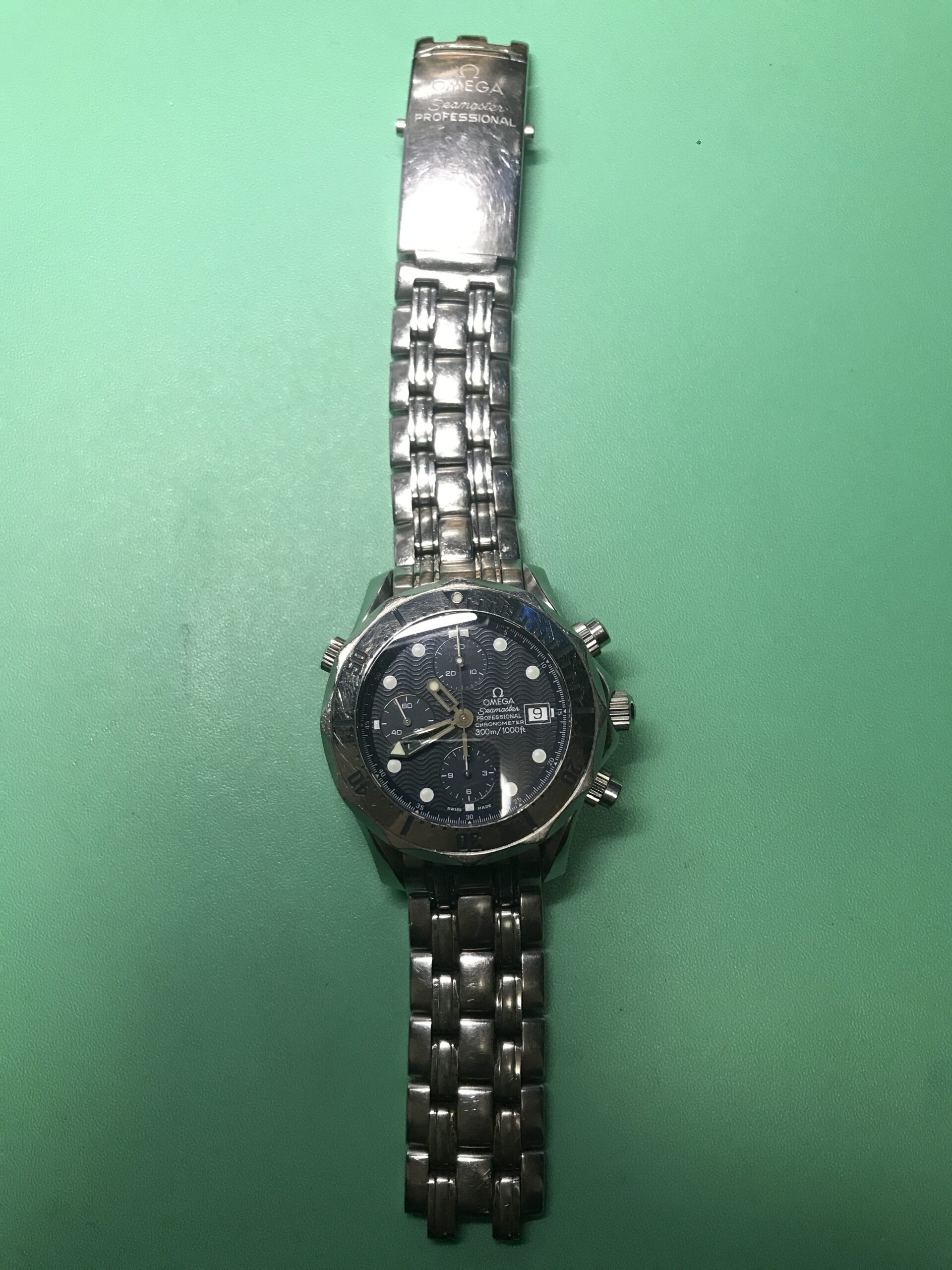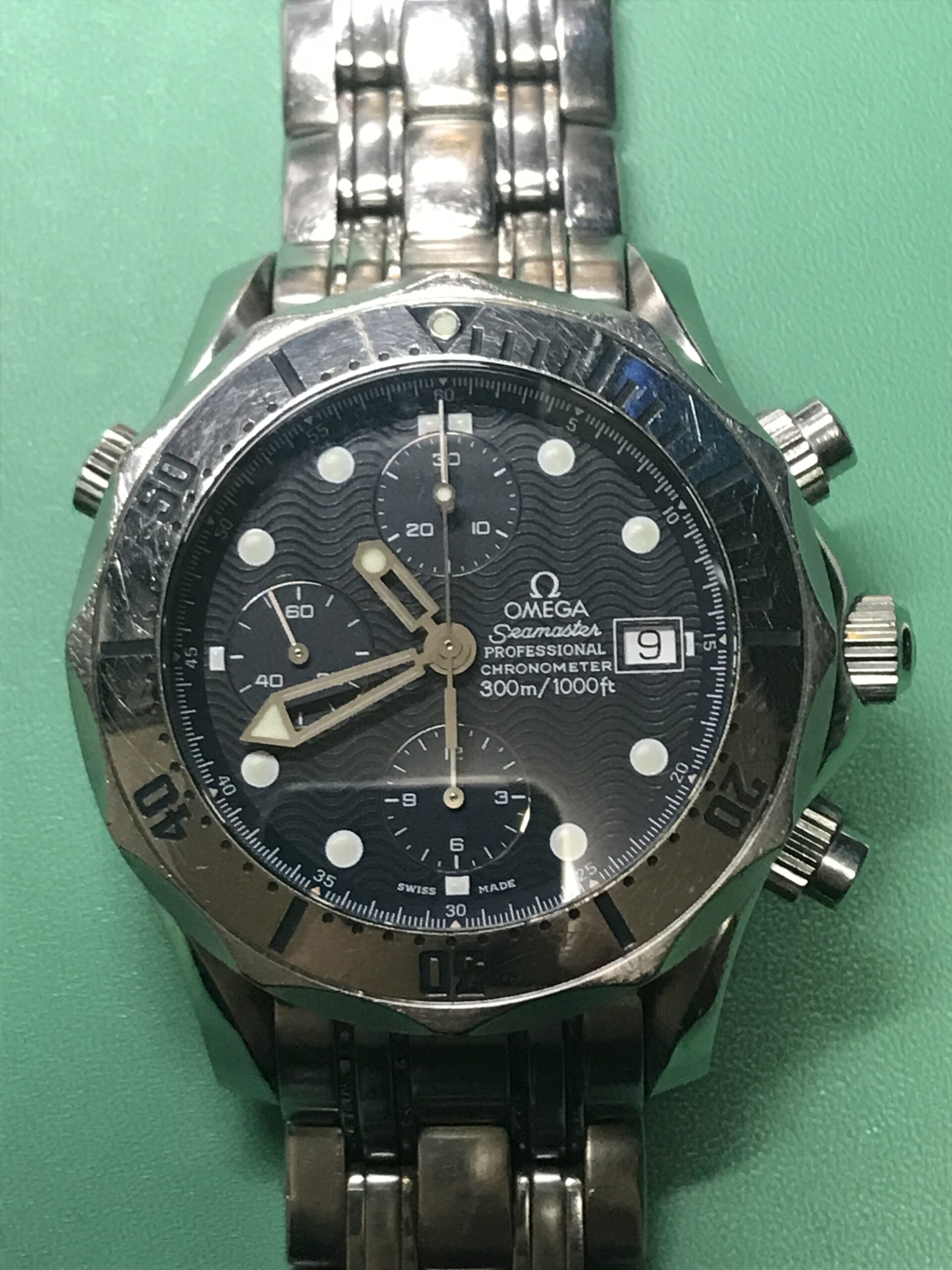 お預かりした時計、オメガ・シーマスター・プロフェッショナル ・クロノグラフ 300mはかの007、ジェームス・ボンドも愛用したモデル(正確には中身のムーブメントは違うものですが)で、その存在感あるフォルムはオーナーさんにとても似合っていますね。