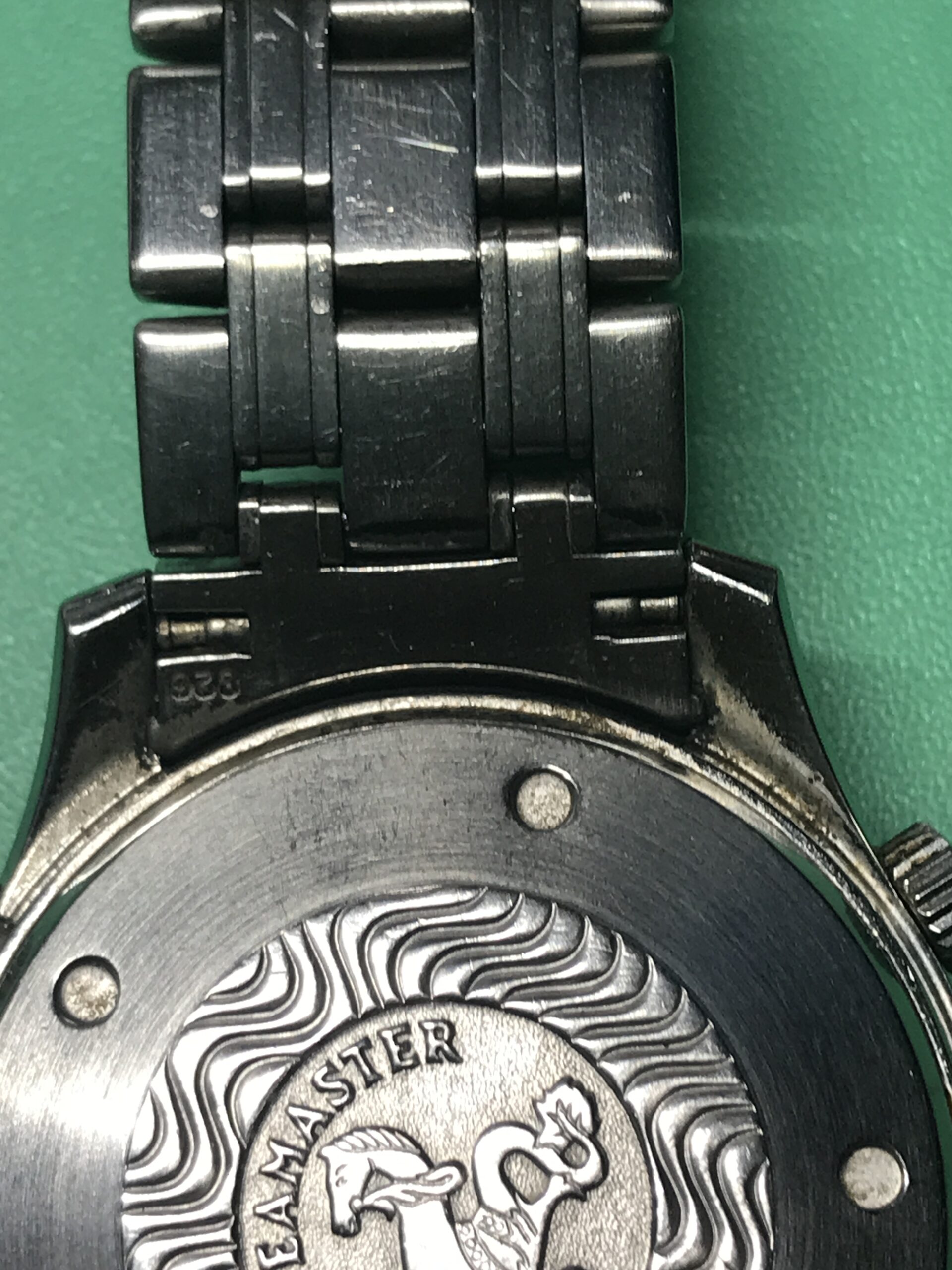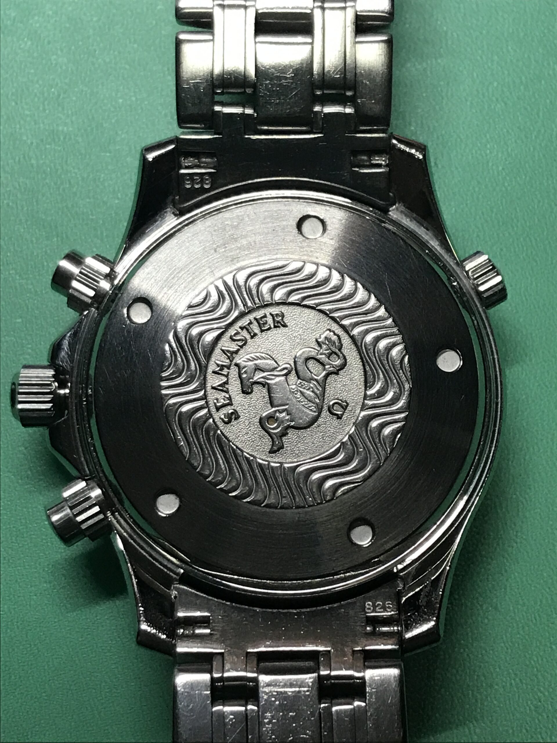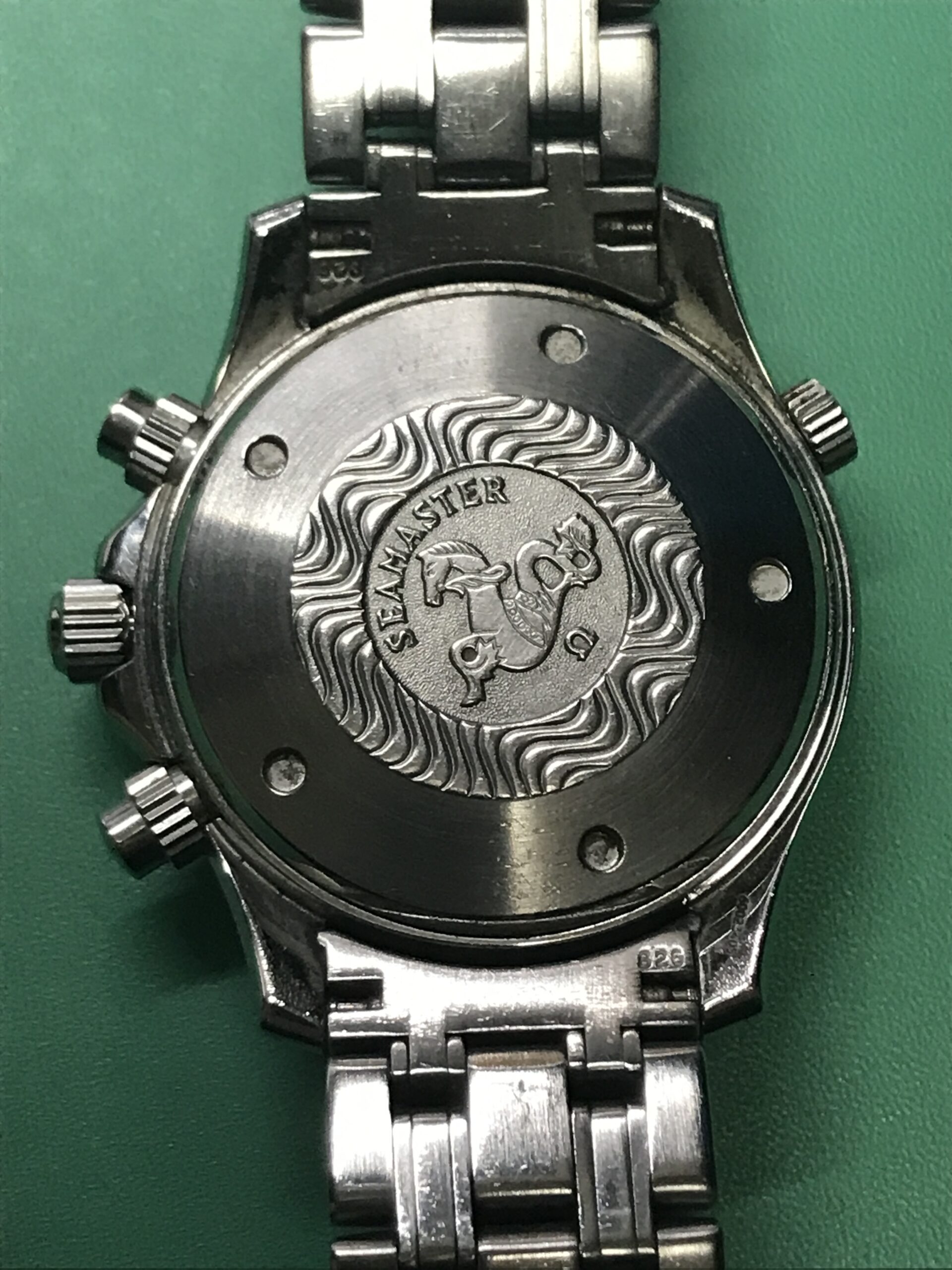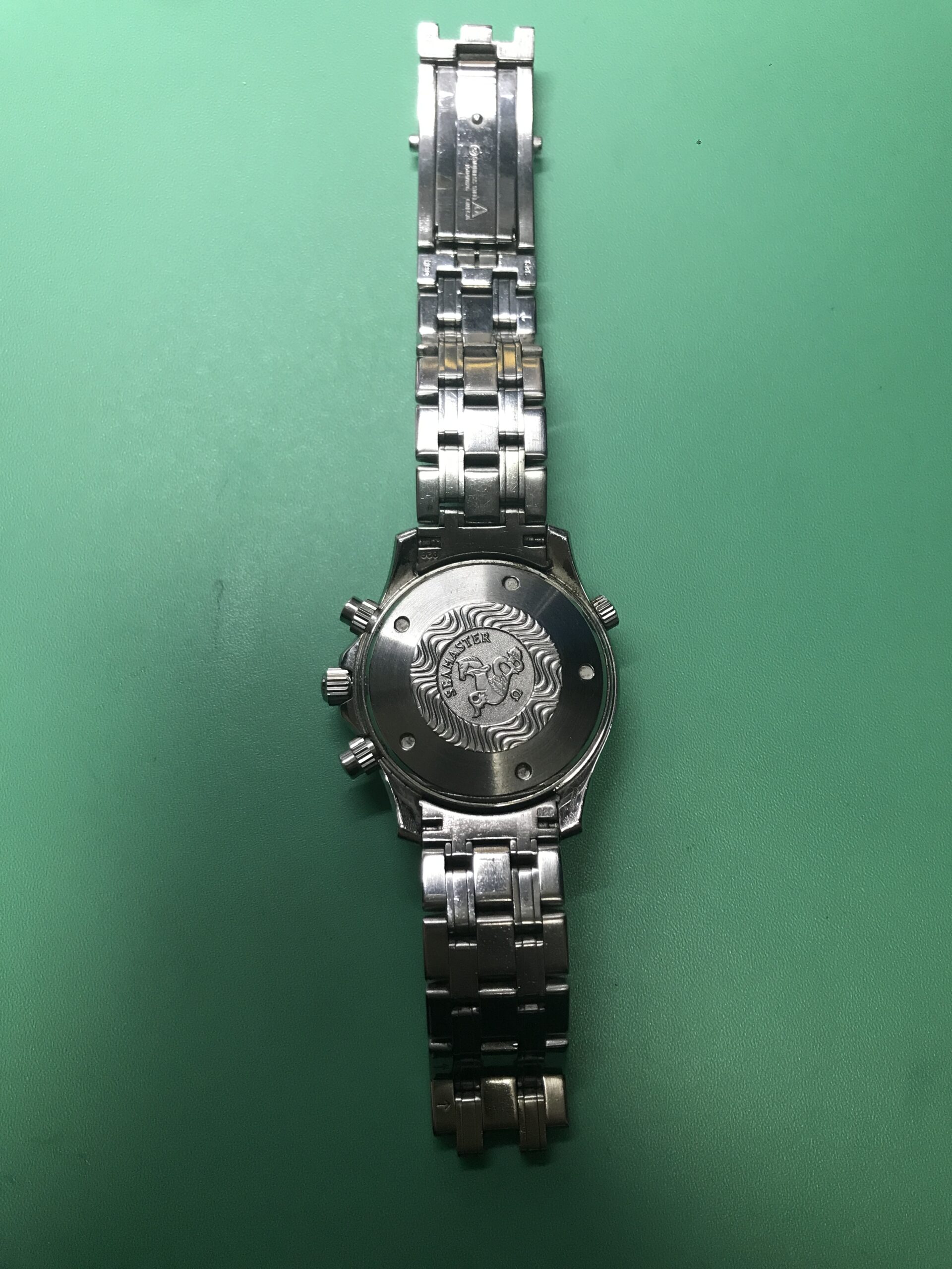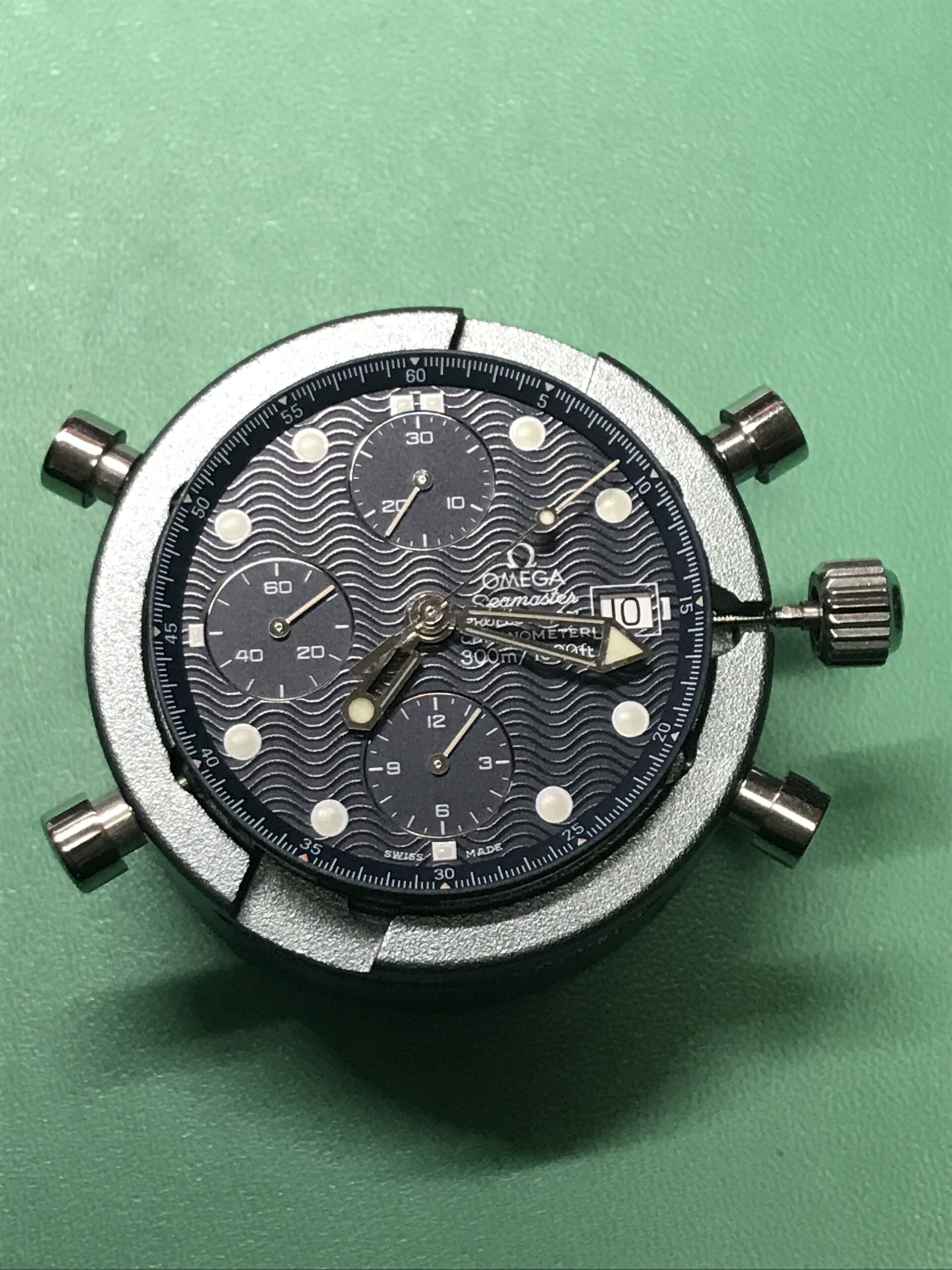 お預かりした時計、オメガ・シーマスター・プロフェッショナル ・クロノグラフ 300mはかの007、ジェームス・ボンドも愛用したモデル(正確には中身のムーブメントは違うものですが)で、その存在感あるフォルムはオーナーさんにとても似合っていますね。