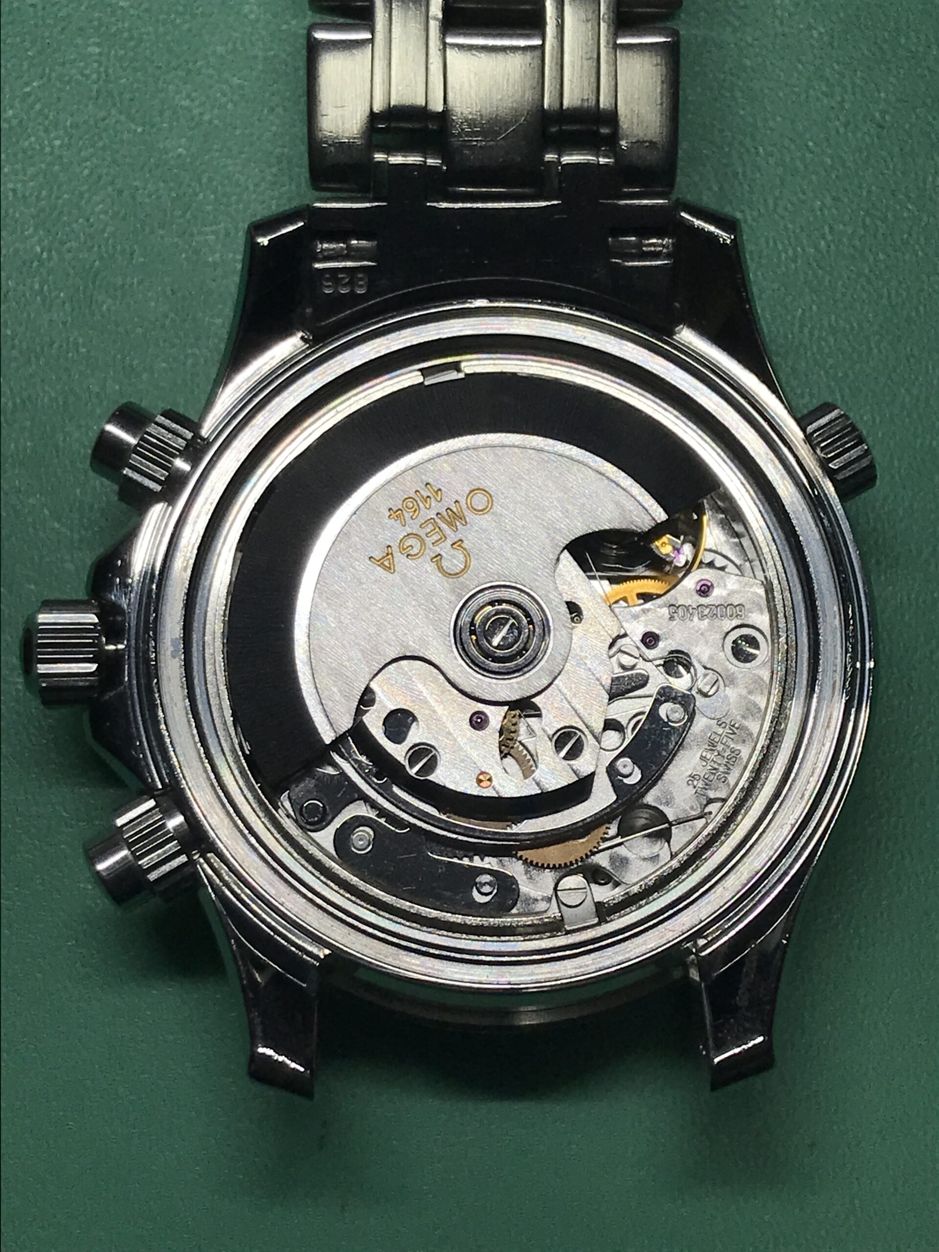 この自動巻クロノグラフムーブメントはオメガ1164、元はETA社の7750という、クロノグラフムーブメントで最も広く使用されているものをベースに作られており、非常に信頼の高い機械になります。