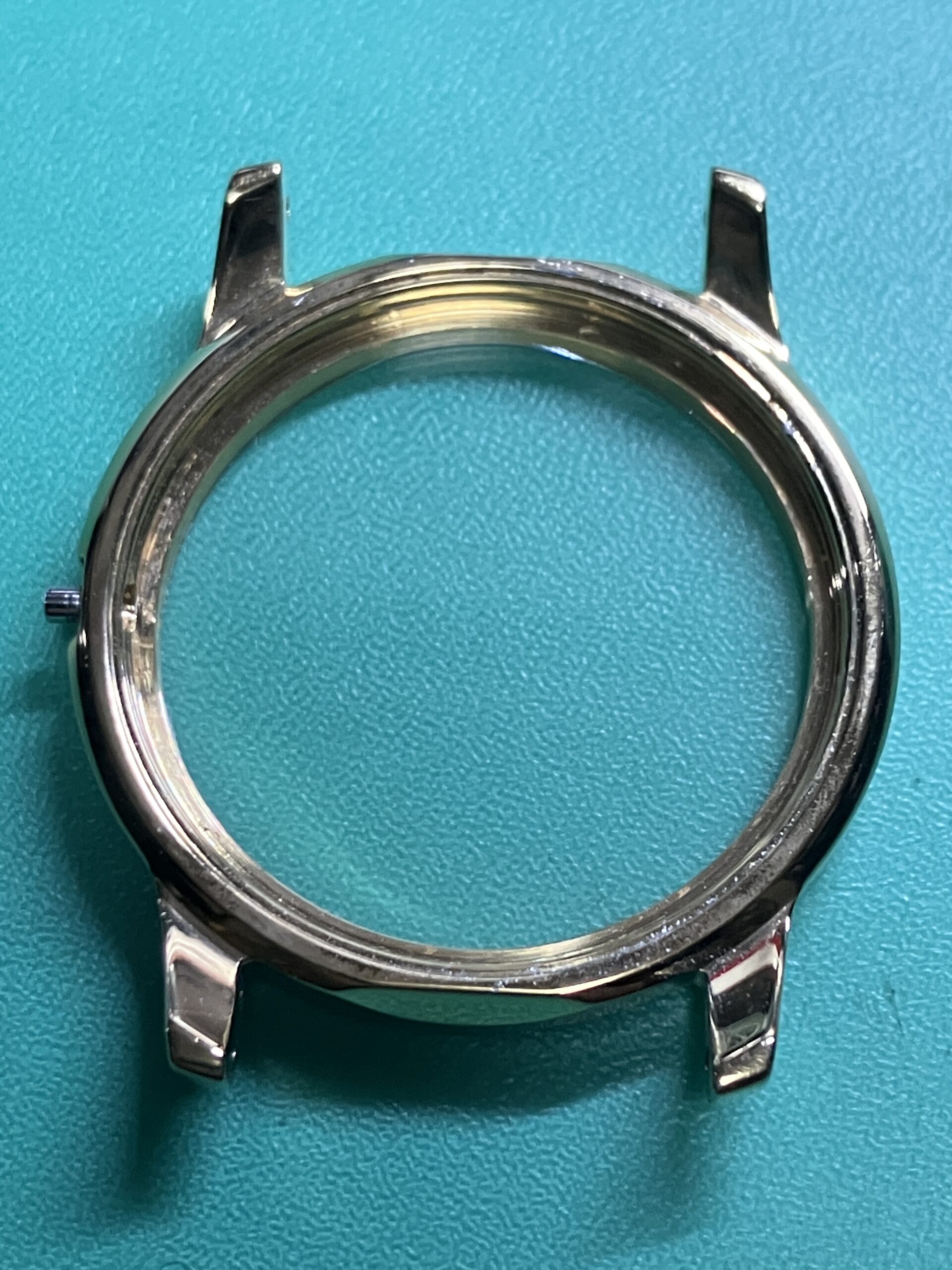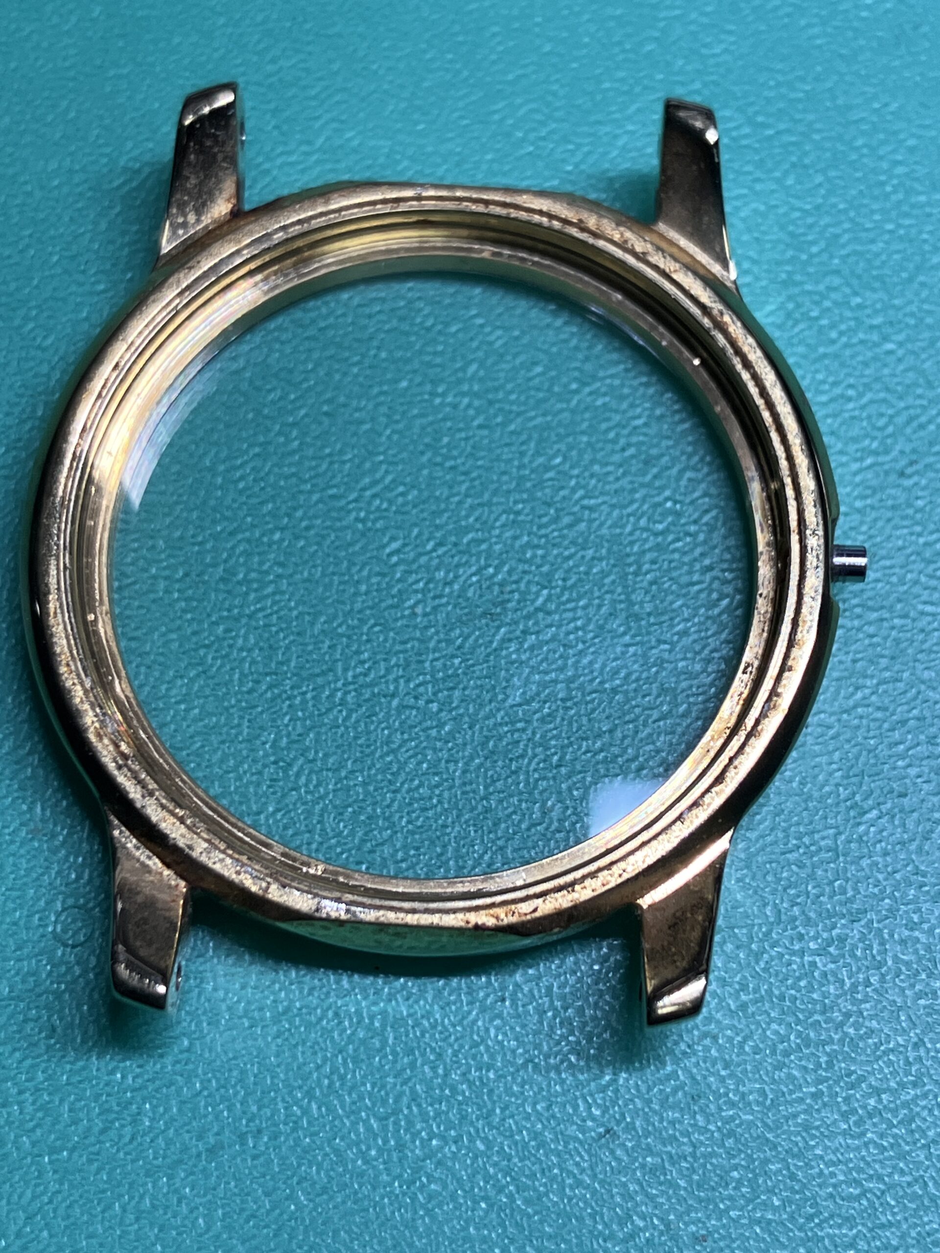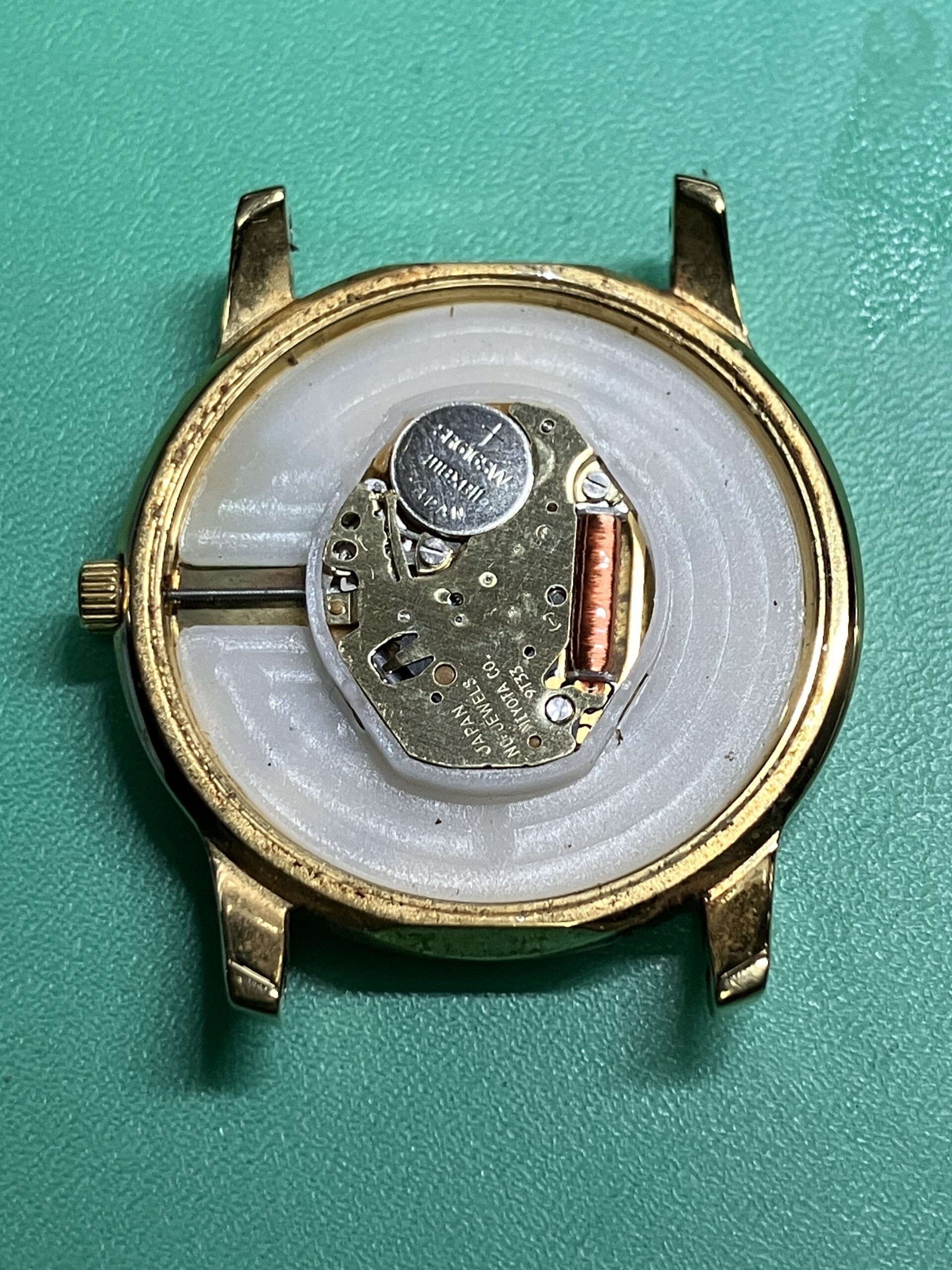 時計の状態としては、電池切れによる不動の状態でした。ケースに若干のメッキのすれはありますが、全体に状態としては良いものです。今回は電池交換とクリーニングのメンテナンスをいたしました。ケースの若干のサビ取り、文字板、風防内の埃、汚れの除去を行いました。また分針の取付が3分前後のずれ、秒針がインデックスとずれが見られましたので、針の付け直しをいたしました。