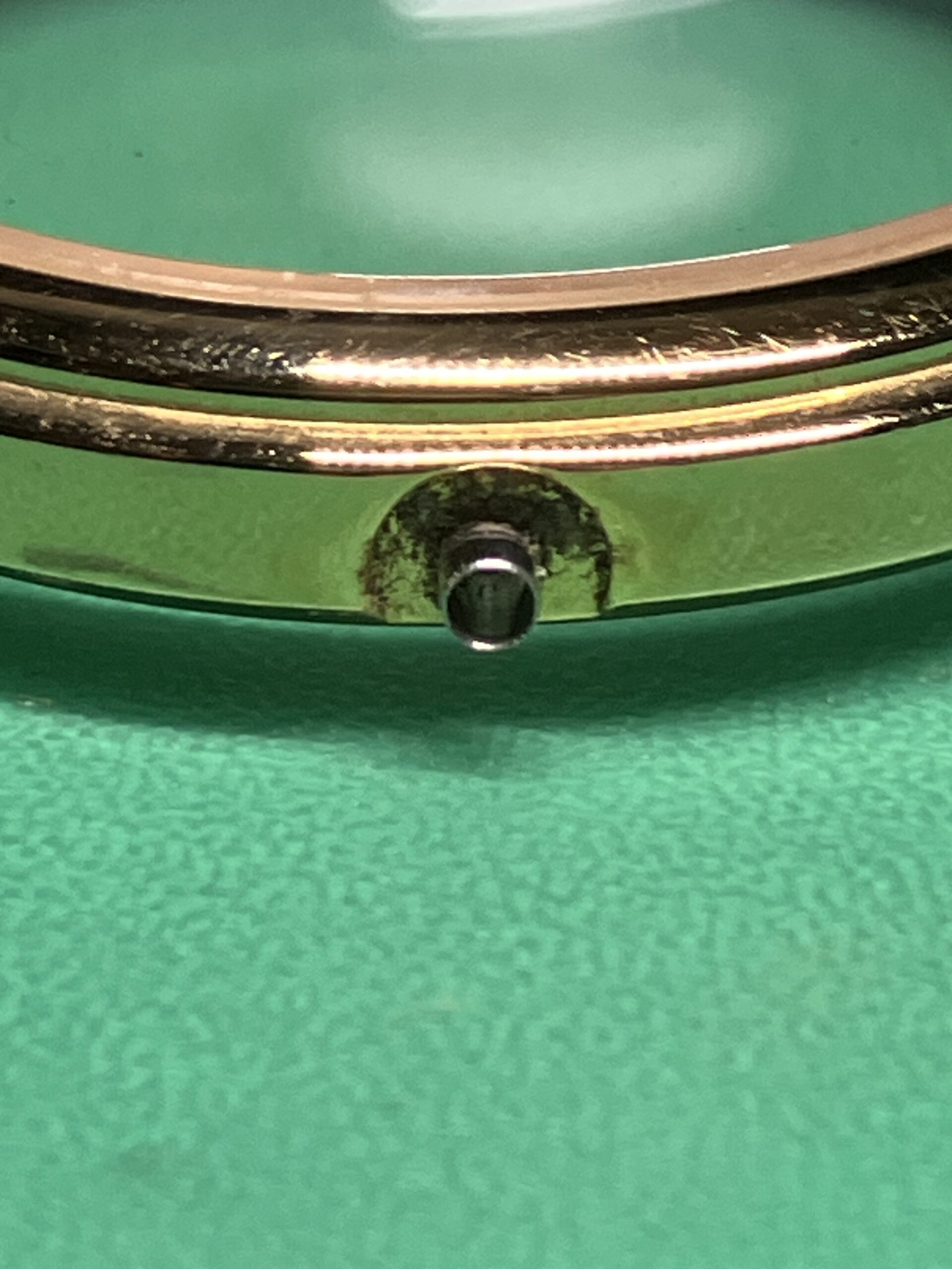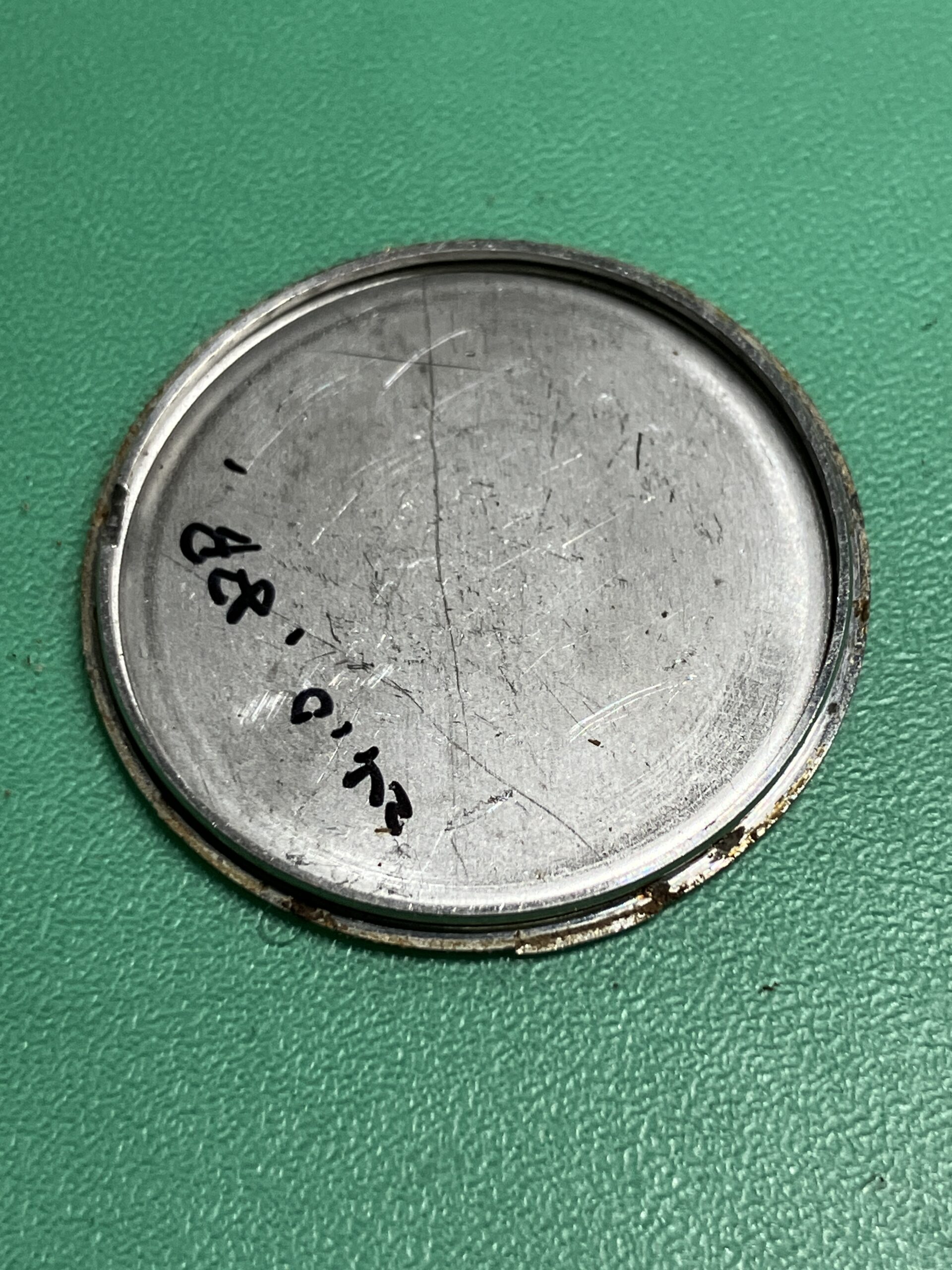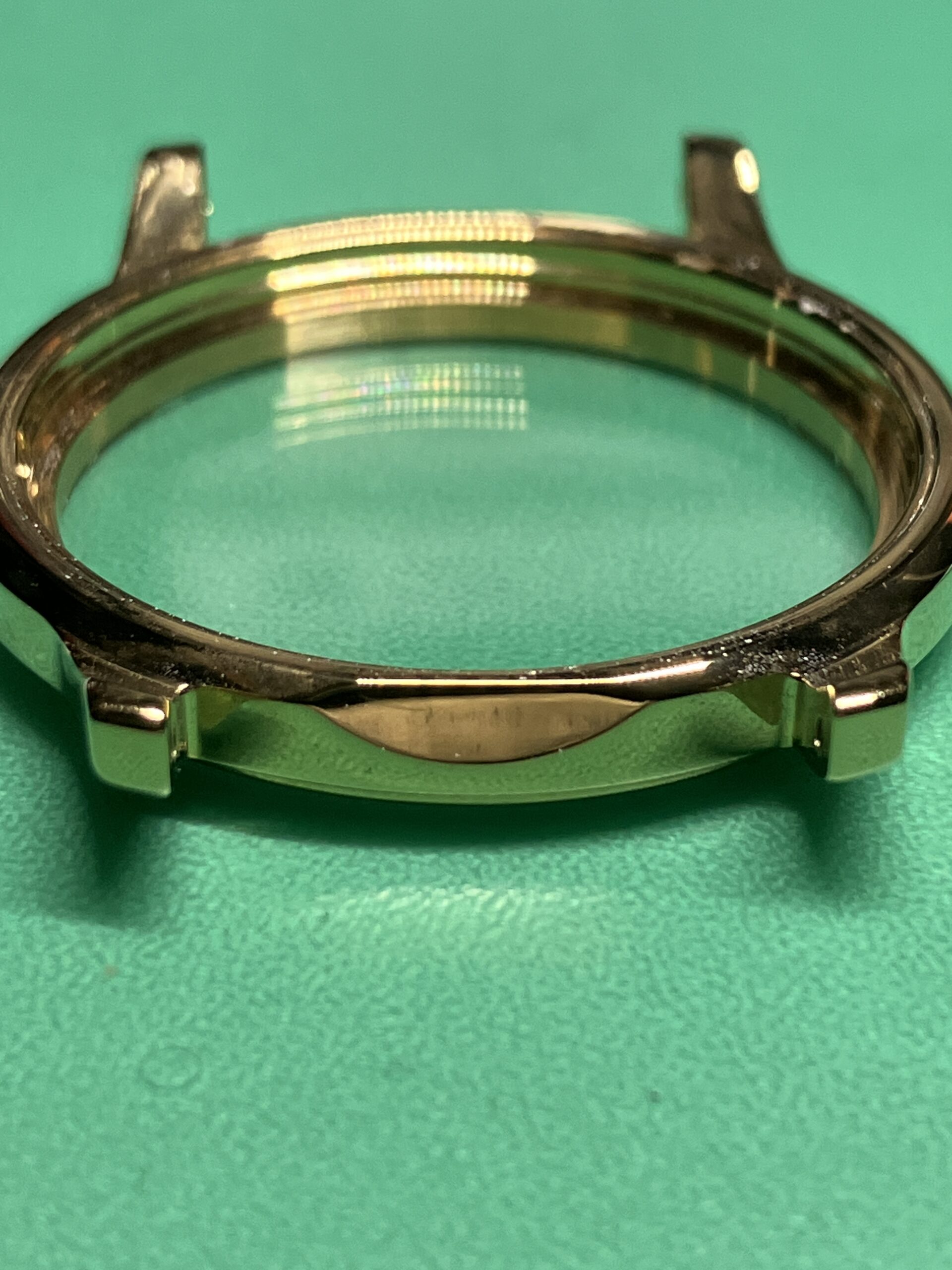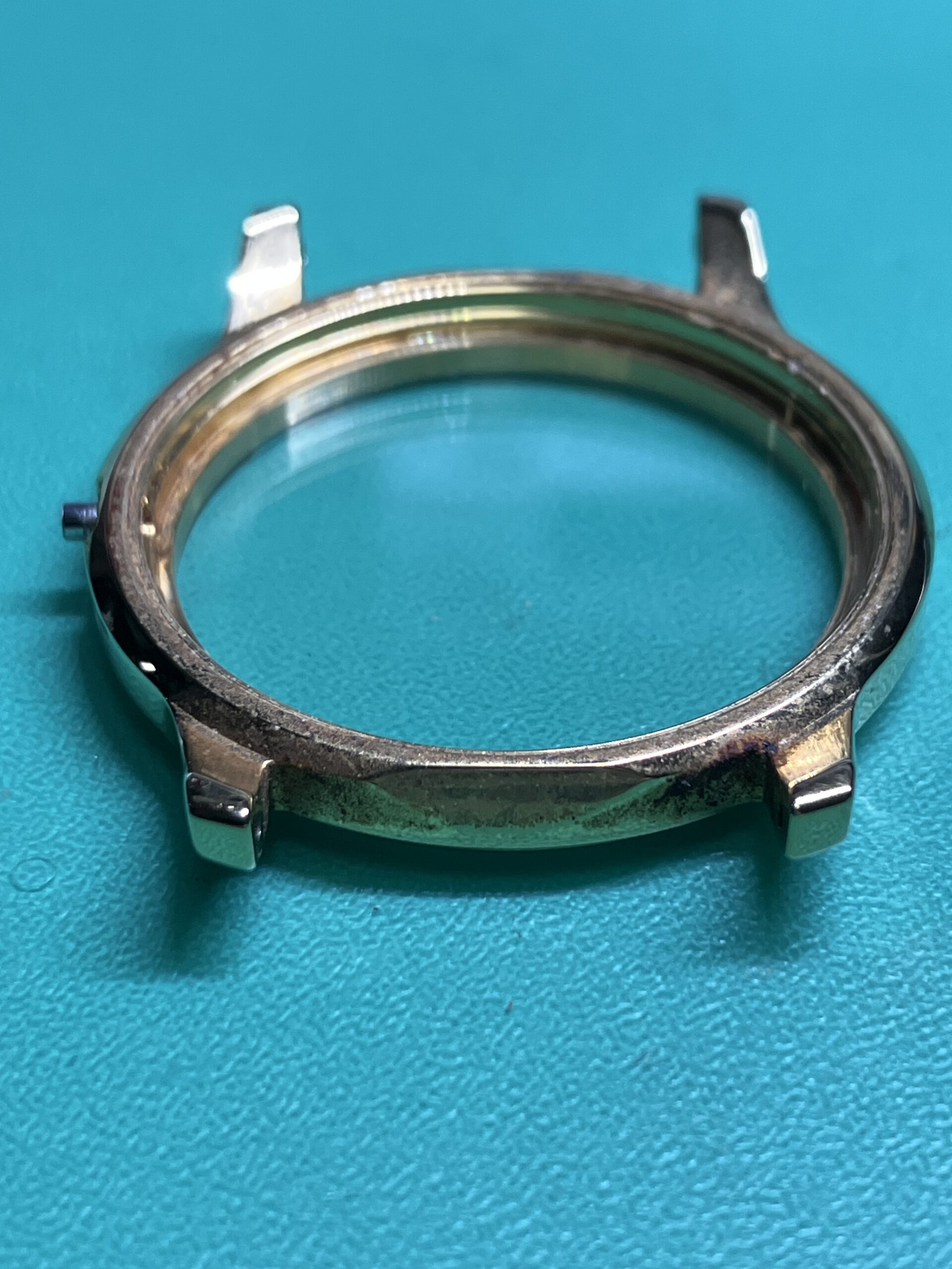 時計の状態としては、電池切れによる不動の状態でした。ケースに若干のメッキのすれはありますが、全体に状態としては良いものです。今回は電池交換とクリーニングのメンテナンスをいたしました。ケースの若干のサビ取り、文字板、風防内の埃、汚れの除去を行いました。また分針の取付が3分前後のずれ、秒針がインデックスとずれが見られましたので、針の付け直しをいたしました。