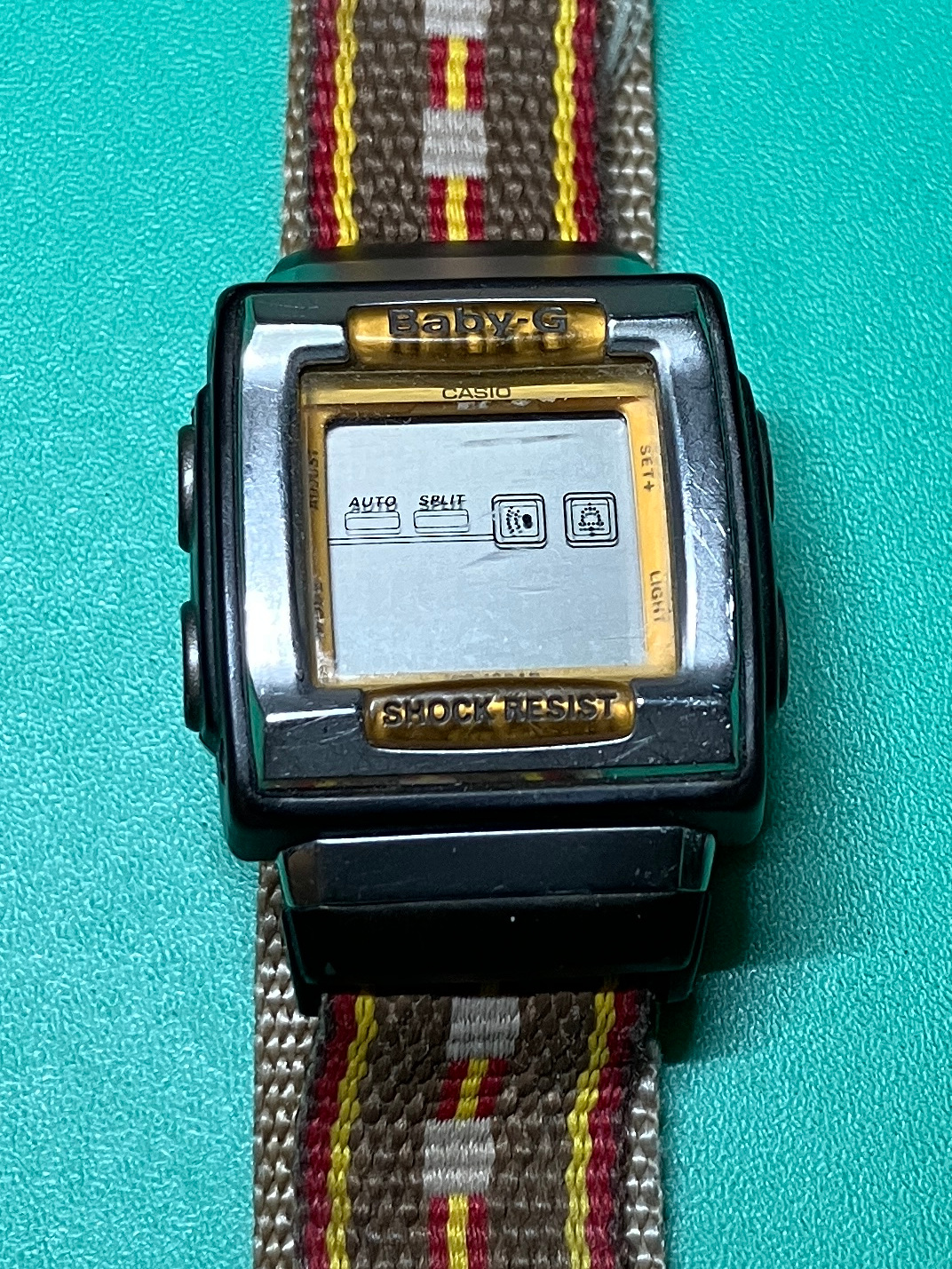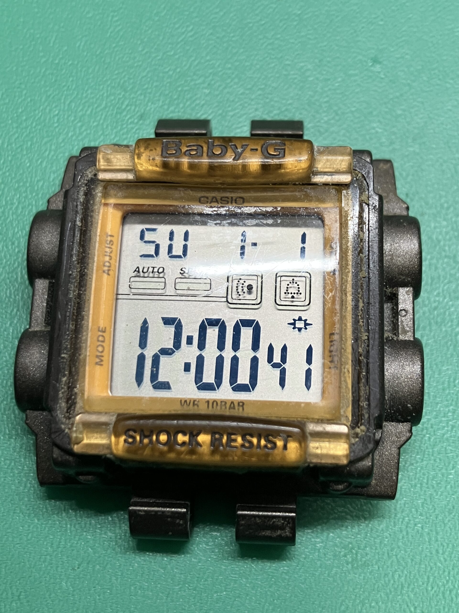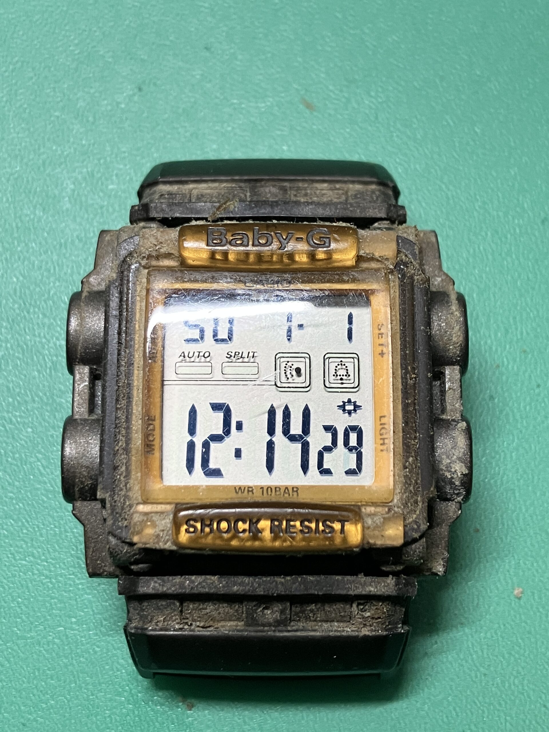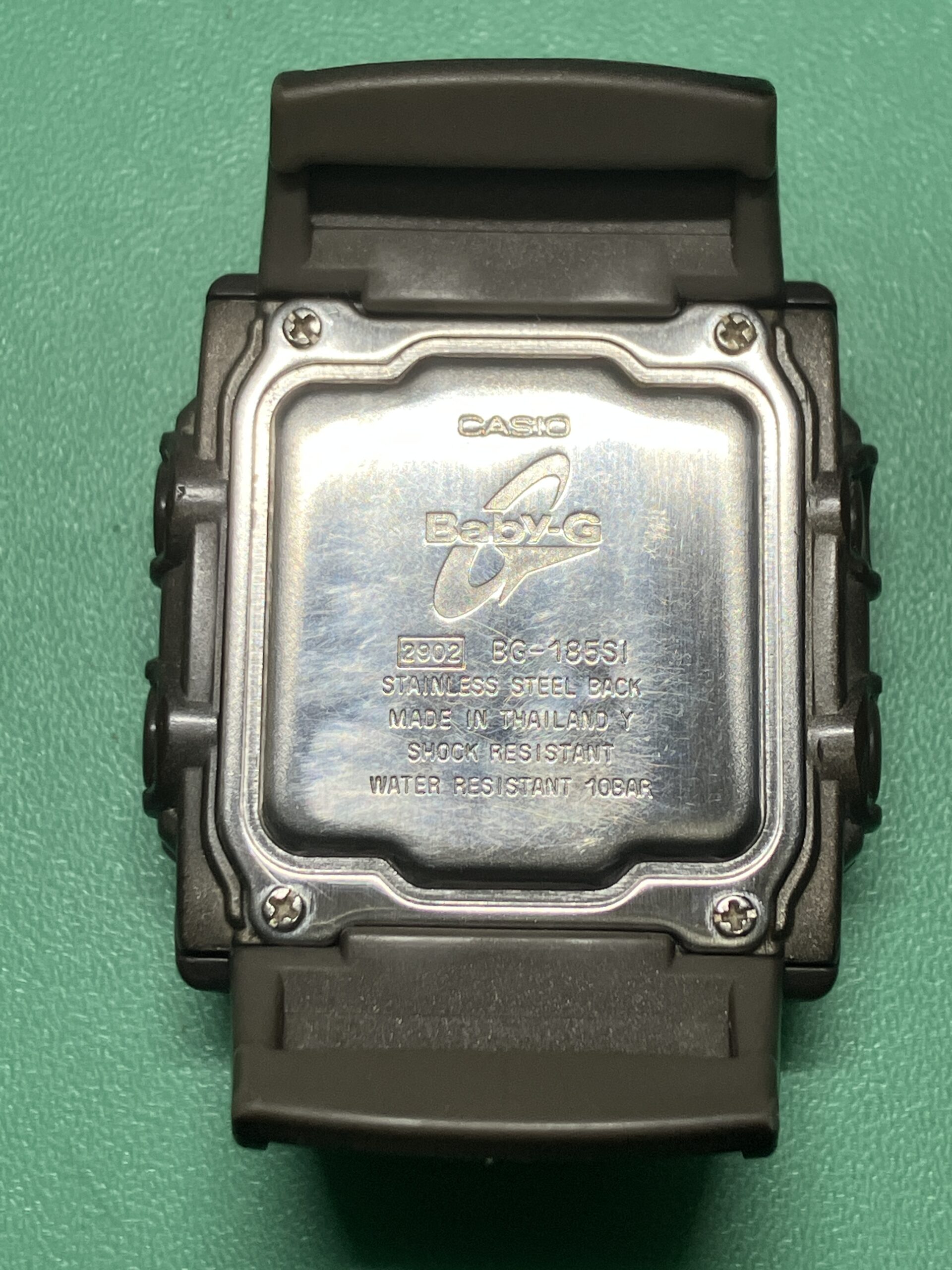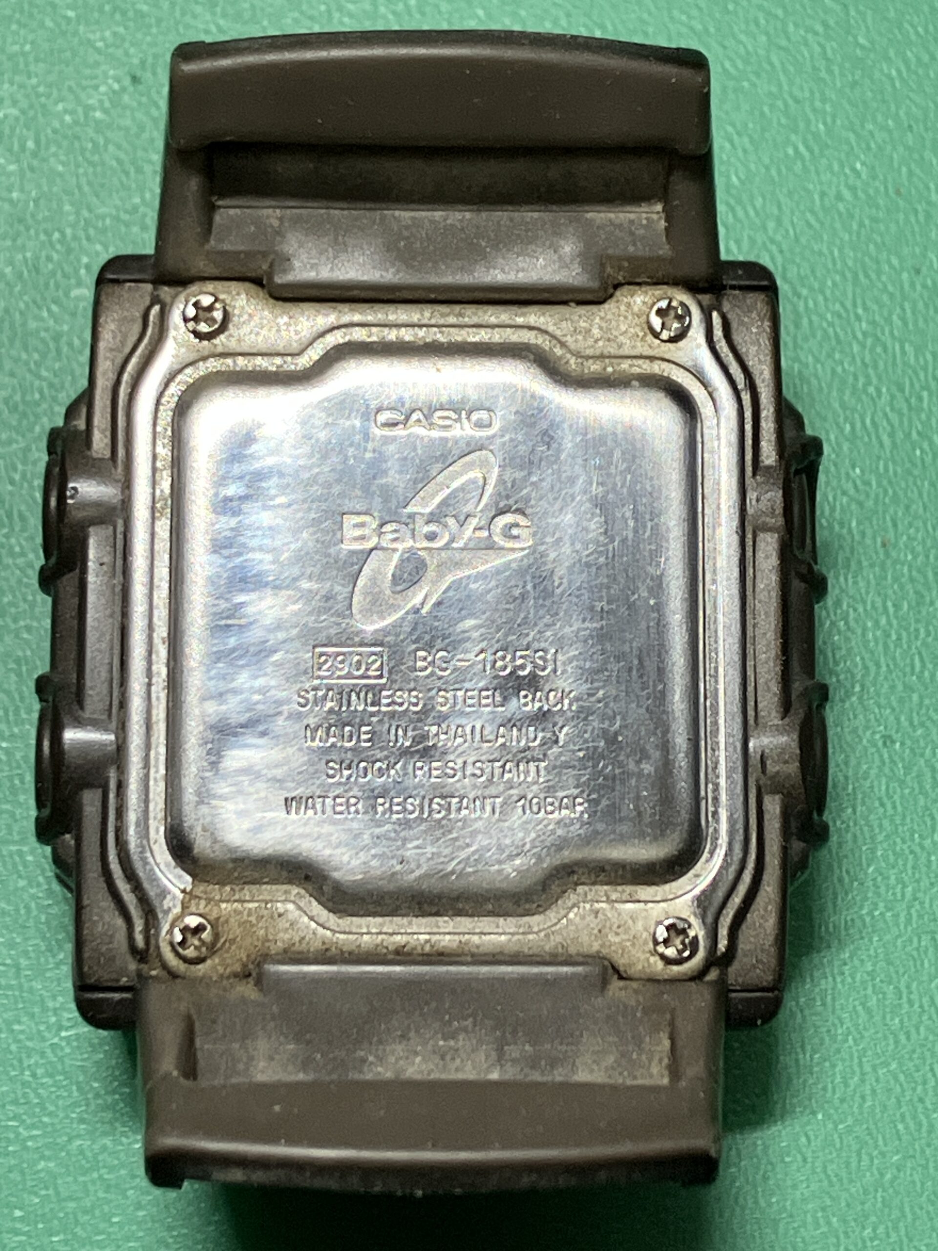 今回お預かりした時計は、カシオ ベイビーG (CASIO BABY-G)、2902 BG-185SIです。BABY-Gシリーズは、もともとメンズ向けタフウォッチ「G-SHOCK」の女性・若年層向け派生として1990年代に登場しました。BG-185 系(モジュール2902 搭載)は、2000年代中盤、スポーツ・アクティブ用途を意識したモデルとして “for running”/“アスレジャー” 的な要素を持って市場に出ました。BG185-SIは2005年の発売かと思われます。ベルトのカラーが3種類あり、このモデルはカラー番号が5(1, 3, 5が存在)だと思います。