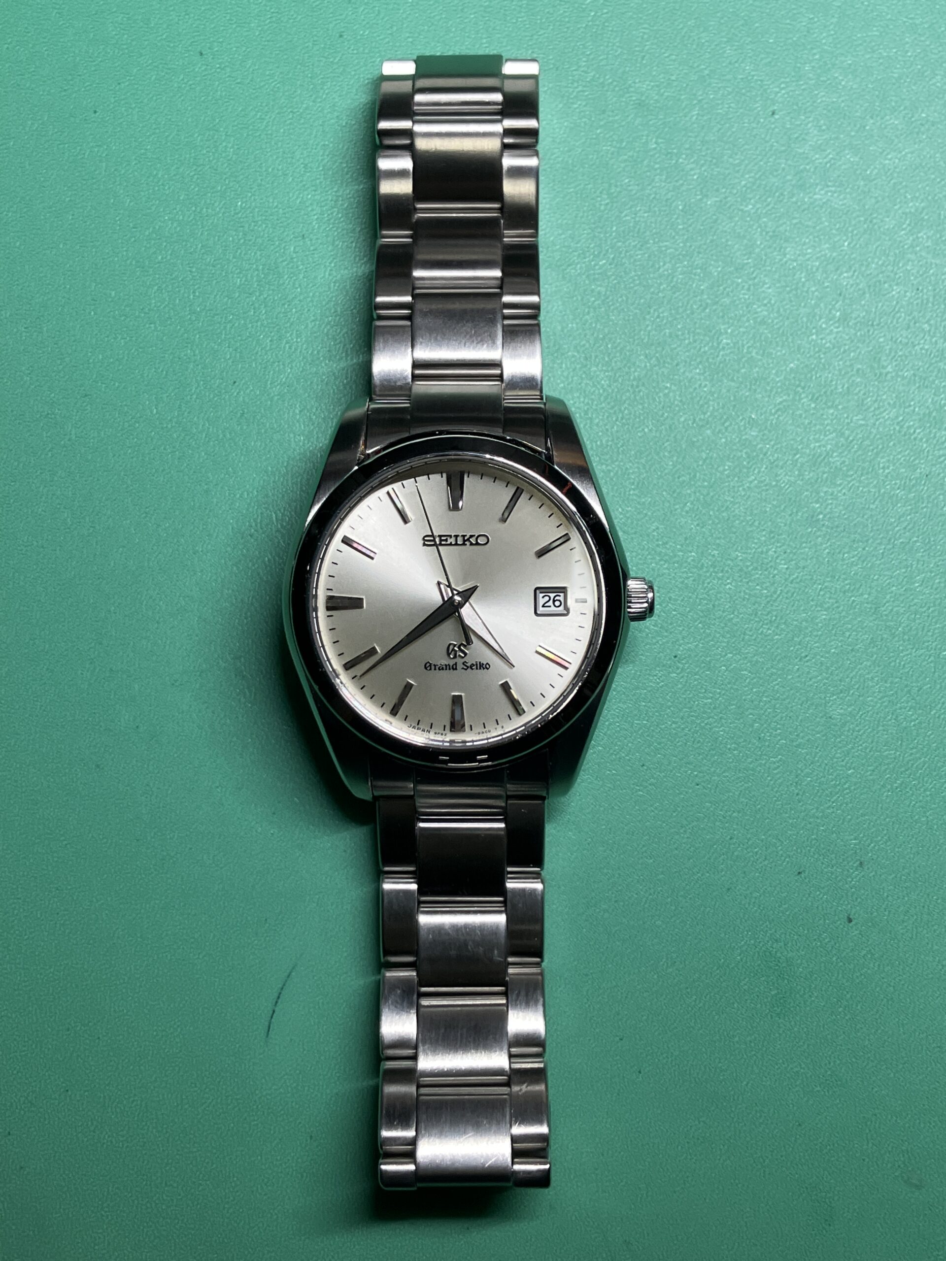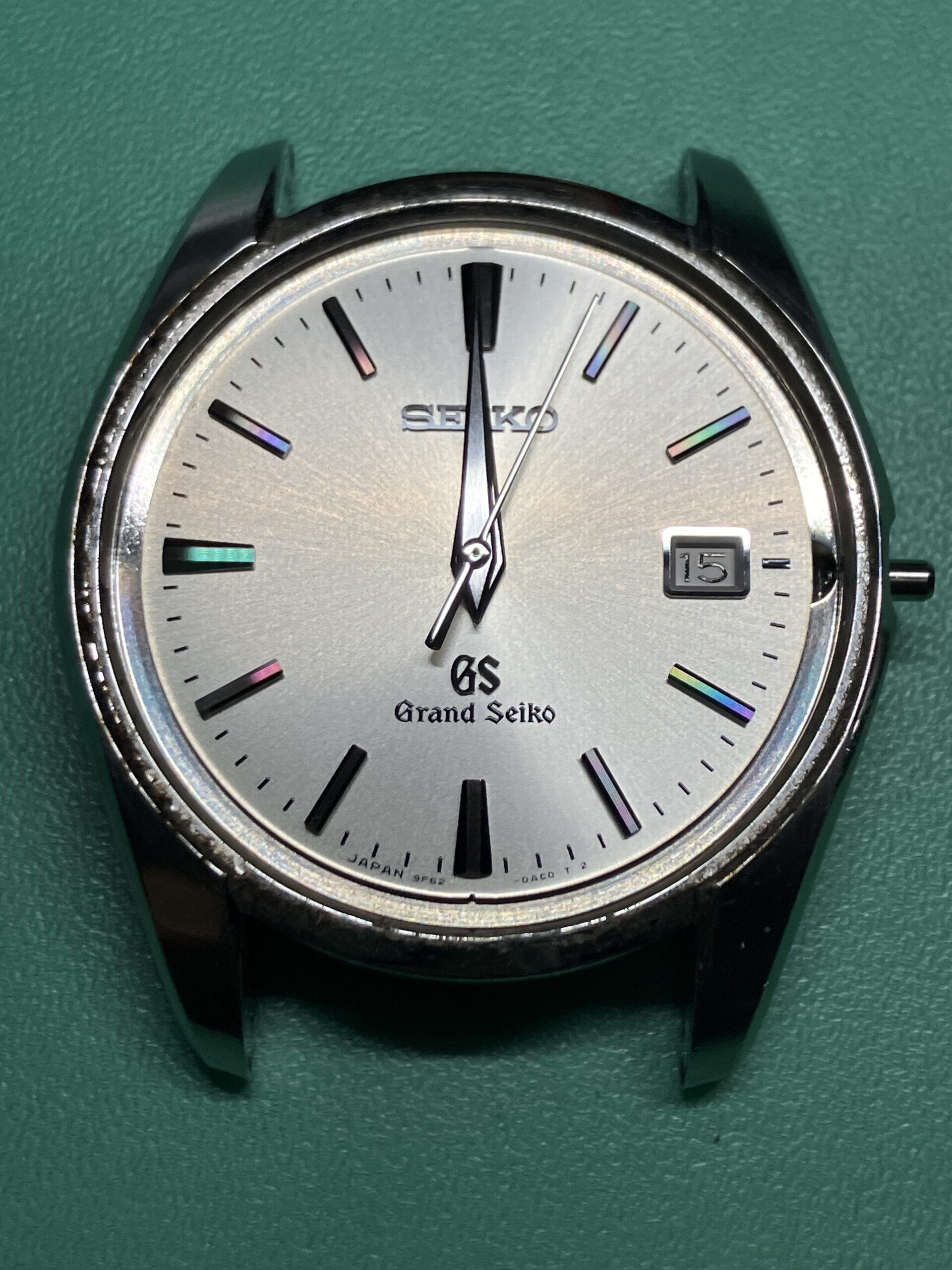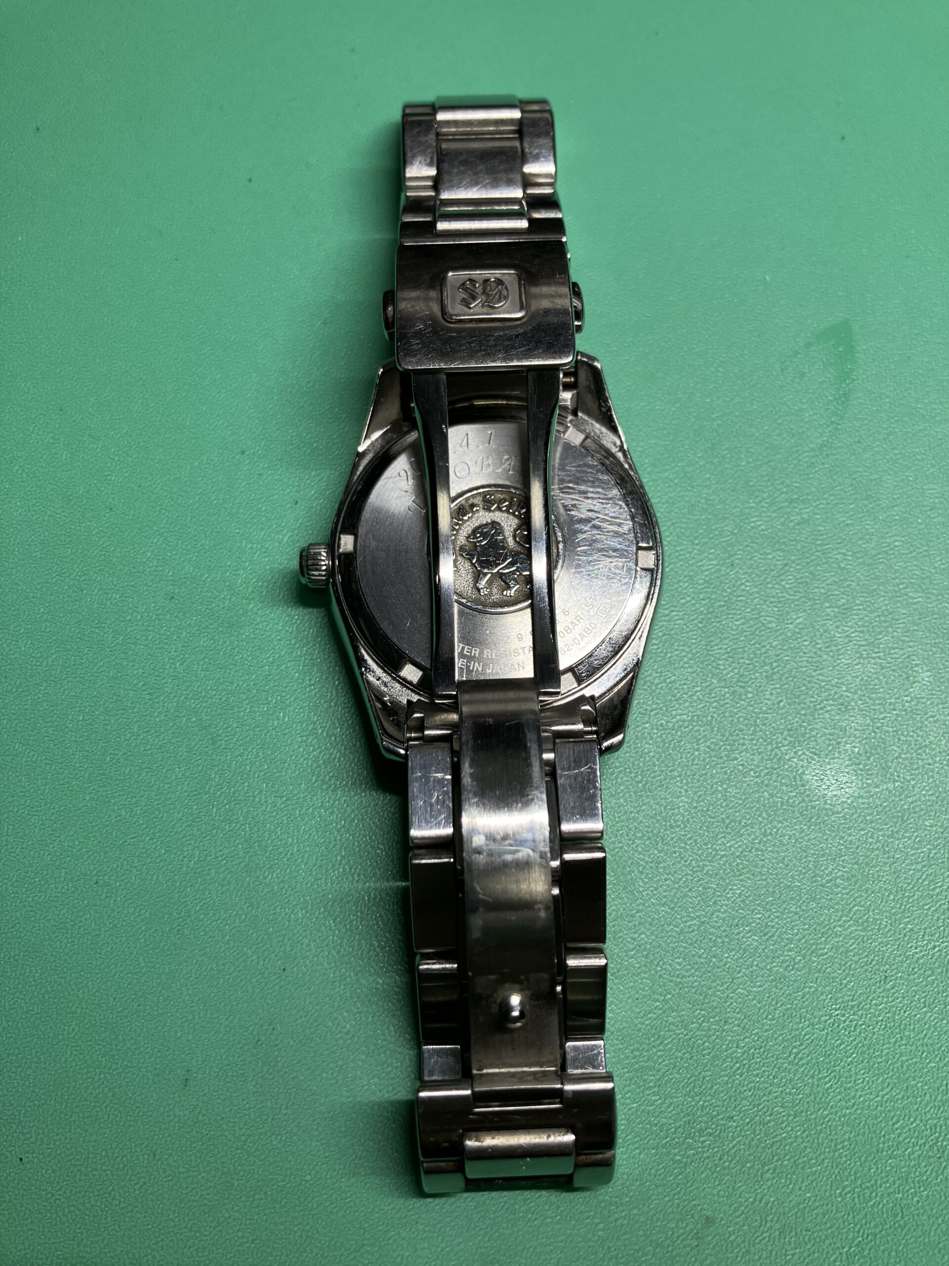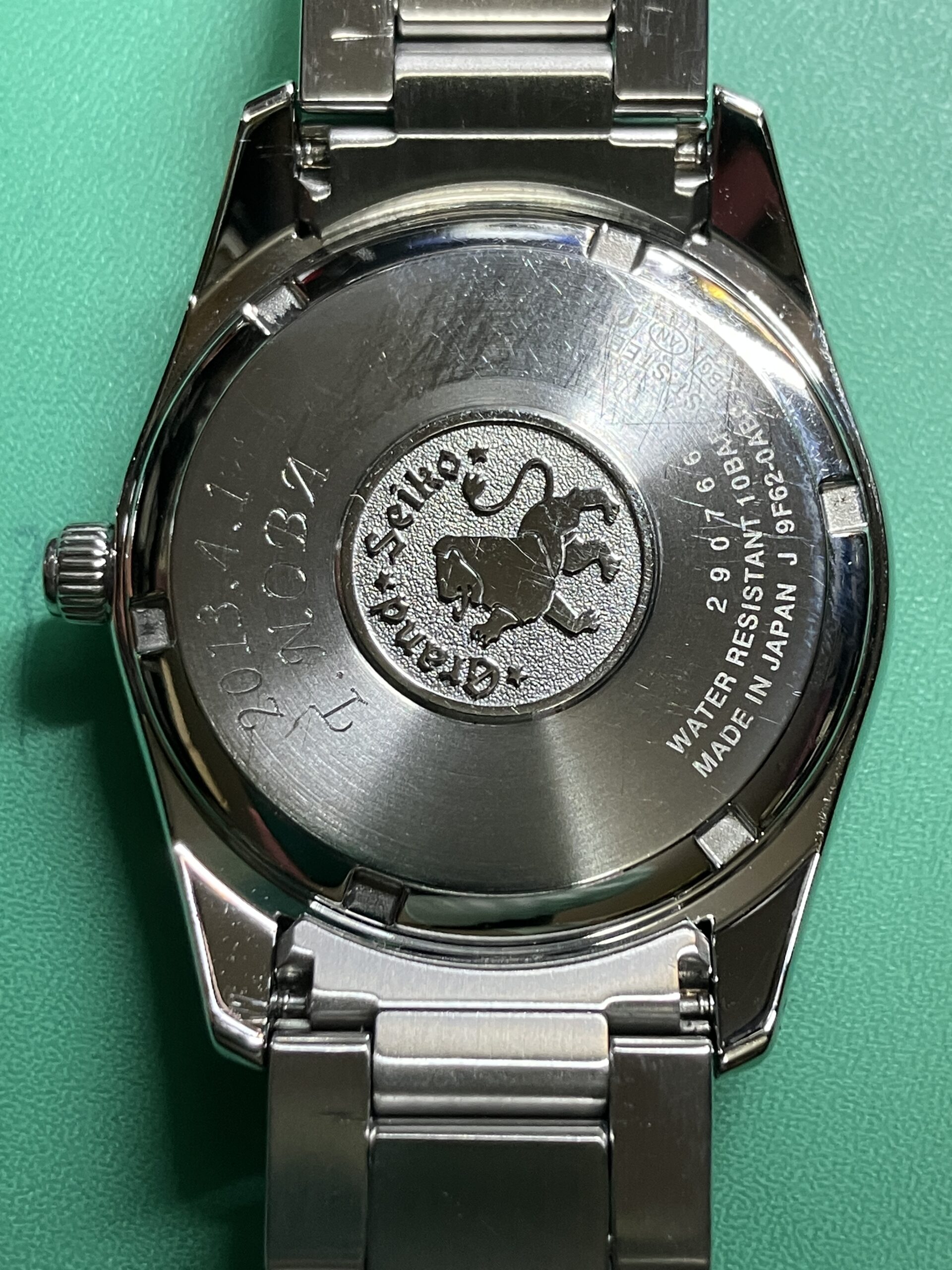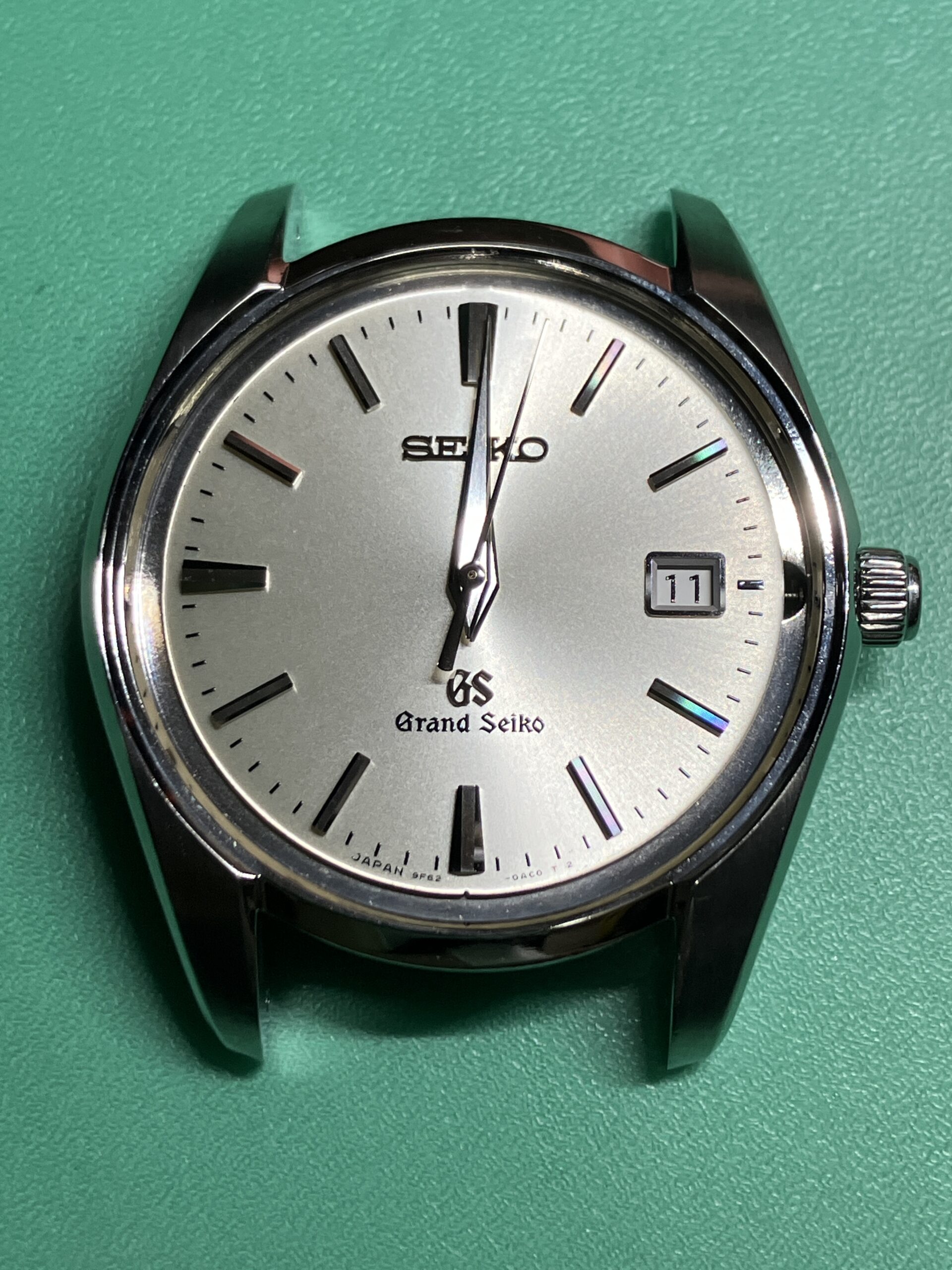 今回お預かりした時計は、セイコー グランドセイコーのクオーツモデル 9F62-0AB0, SBGX059です。年差±10秒の超高精度を誇るセイコーの9F系ムーブメントを搭載した中期のモデルにあたります。9F系ムーブメントは、大型針も動かせる高い駆動力を持った「ツインパルス制御モーター」を持ち、更に瞬間日送り機構、バックラッシュ オートアジャスト機構、3軸独立ガイド、ローター組合せ軸受、といった機能を加えて、操作性、信頼性、耐久性を高めたグランドセイコー専用の最高峰ムーブメントです。1993年に誕生し、セイコーエプソン塩尻事業所内「信州 時の匠工房」で製造され、その地で腕時計としての完成品まで組み上げられています。お手元の時計はシリアルナンバーから、2012年9月製造のものと分かります。