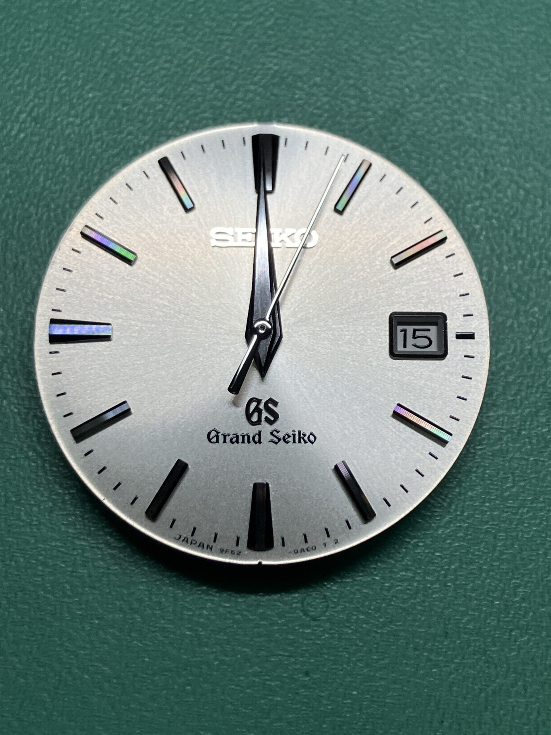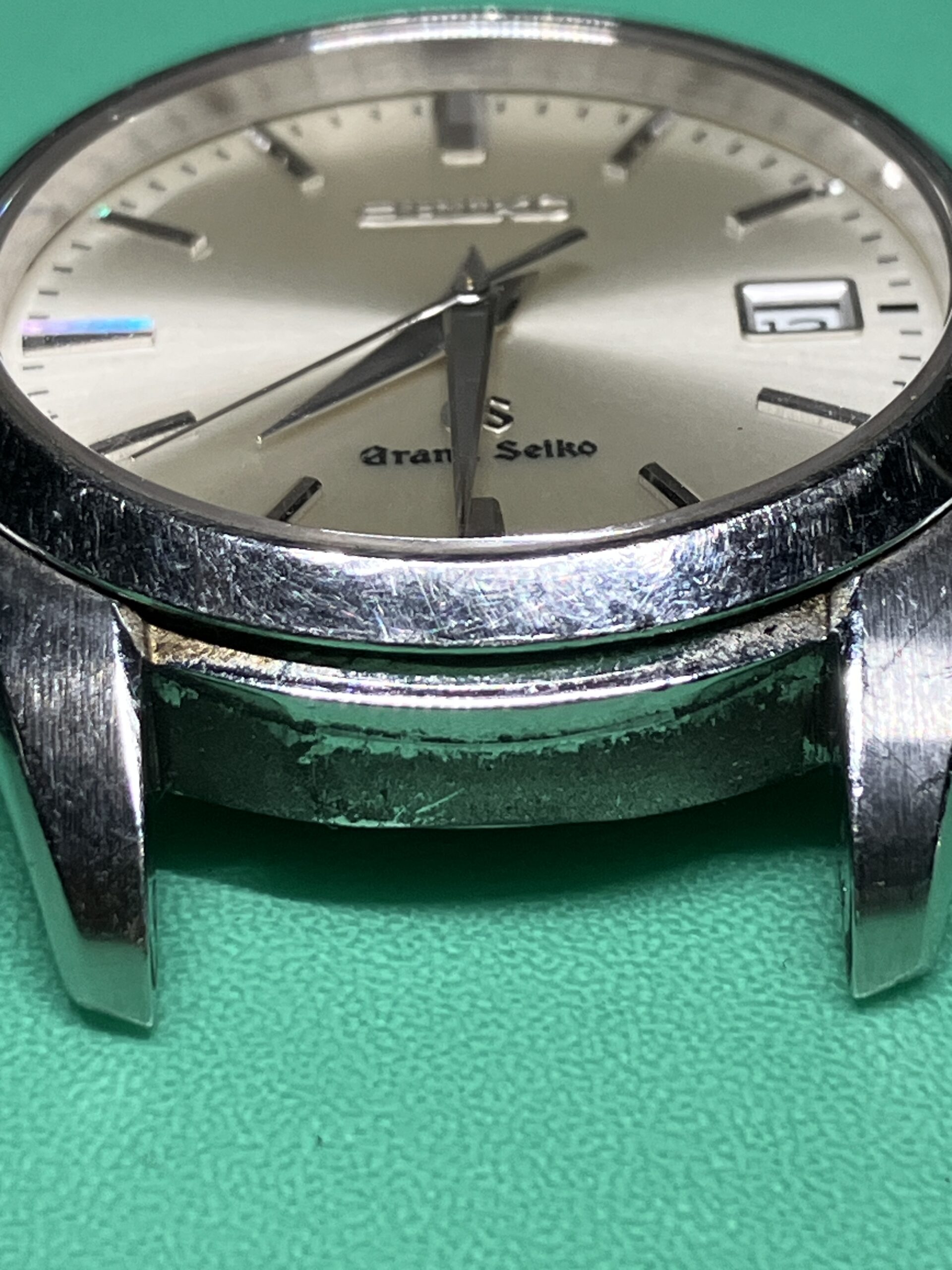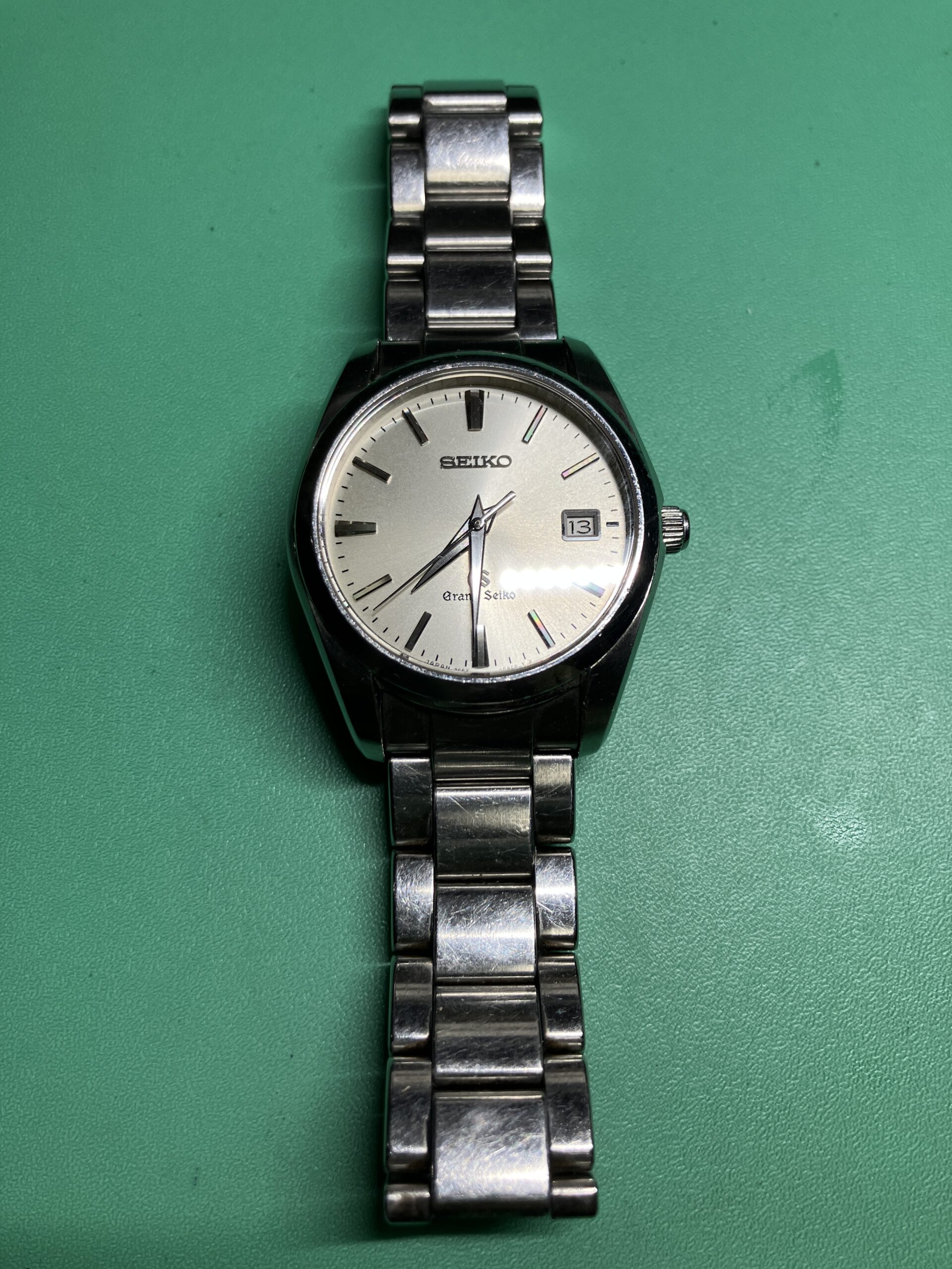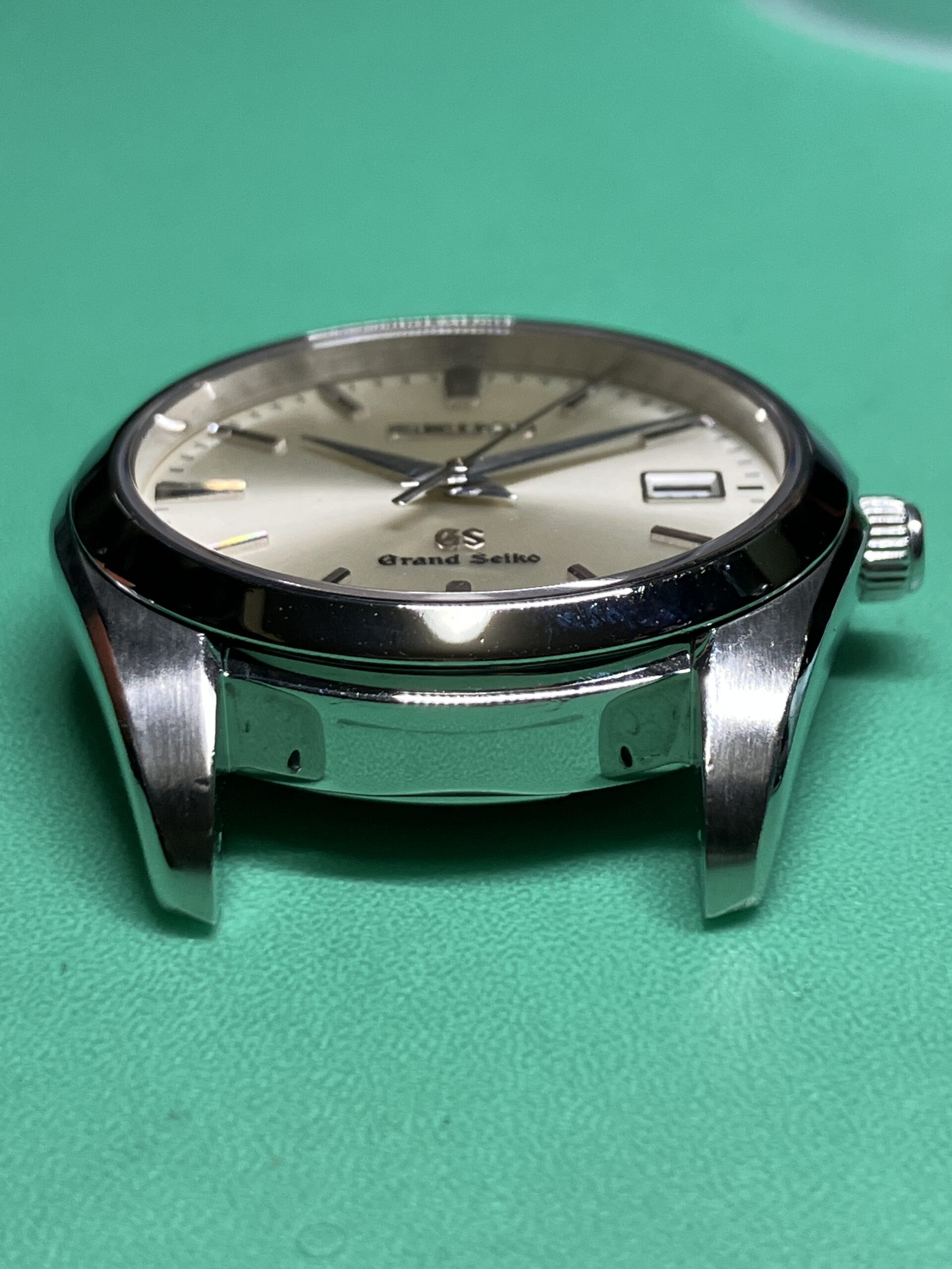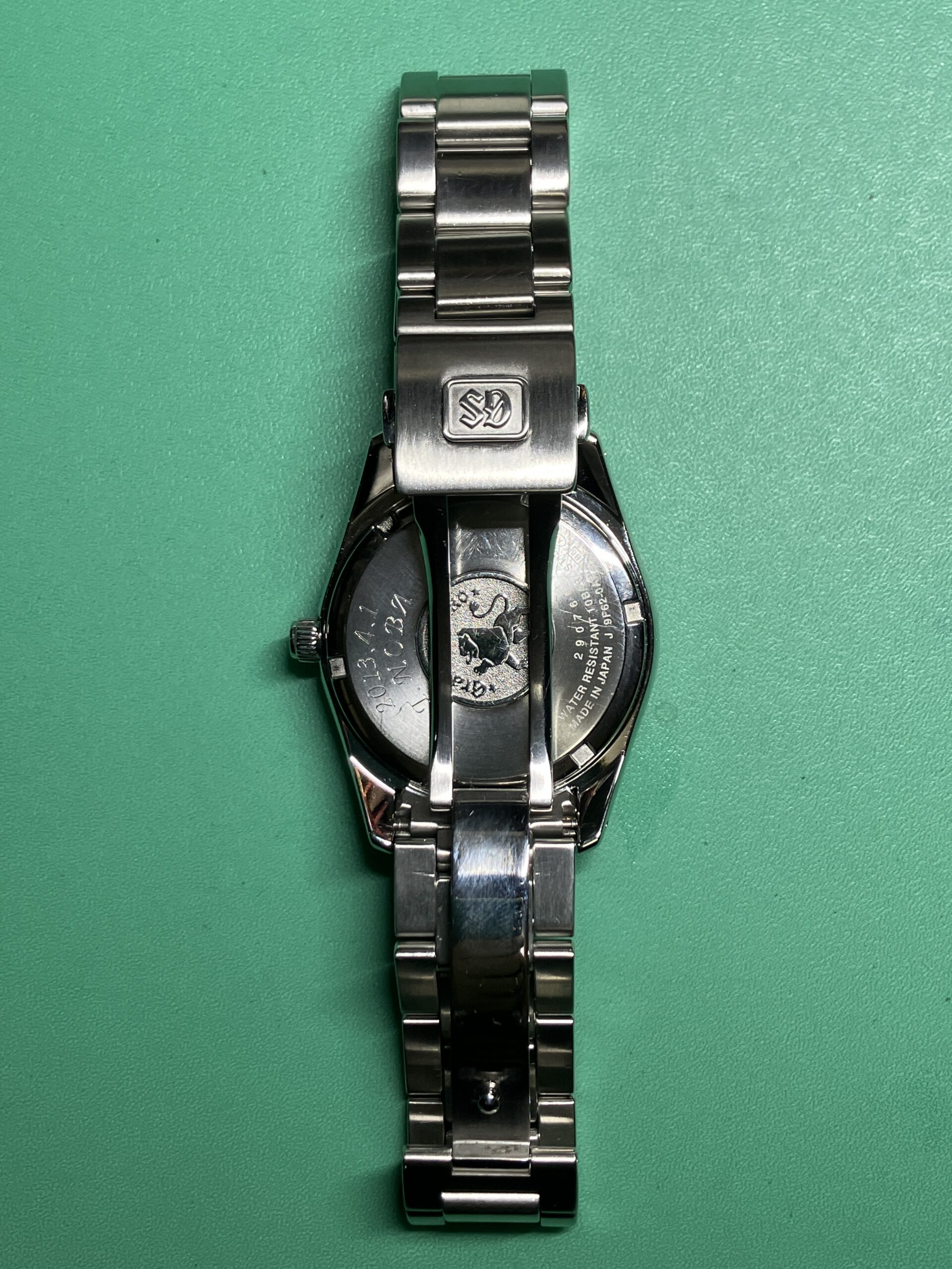 今回お預かりした時計は、セイコー グランドセイコーのクオーツモデル 9F62-0AB0, SBGX059です。年差±10秒の超高精度を誇るセイコーの9F系ムーブメントを搭載した中期のモデルにあたります。9F系ムーブメントは、大型針も動かせる高い駆動力を持った「ツインパルス制御モーター」を持ち、更に瞬間日送り機構、バックラッシュ オートアジャスト機構、3軸独立ガイド、ローター組合せ軸受、といった機能を加えて、操作性、信頼性、耐久性を高めたグランドセイコー専用の最高峰ムーブメントです。1993年に誕生し、セイコーエプソン塩尻事業所内「信州 時の匠工房」で製造され、その地で腕時計としての完成品まで組み上げられています。お手元の時計はシリアルナンバーから、2012年9月製造のものと分かります。
