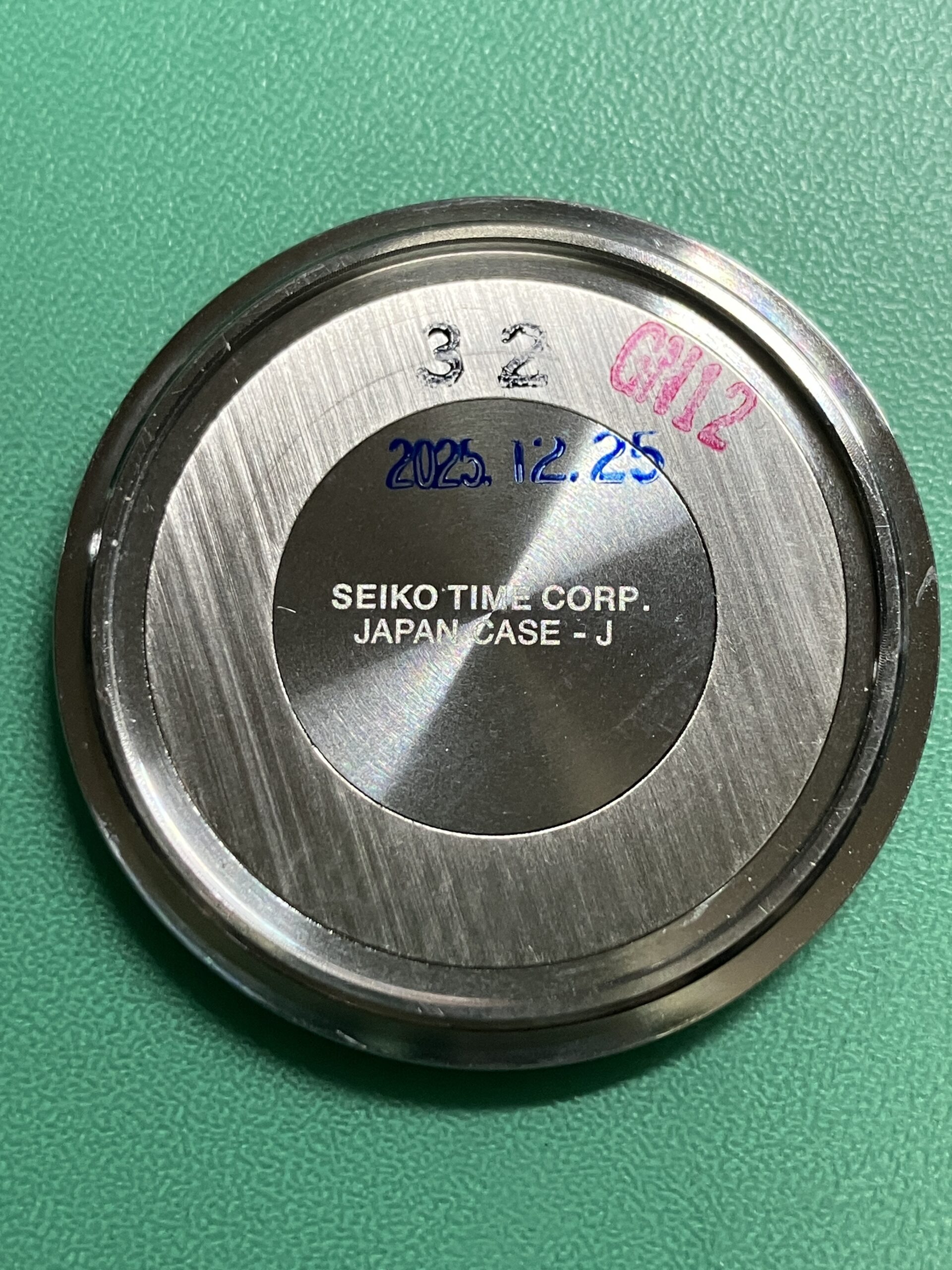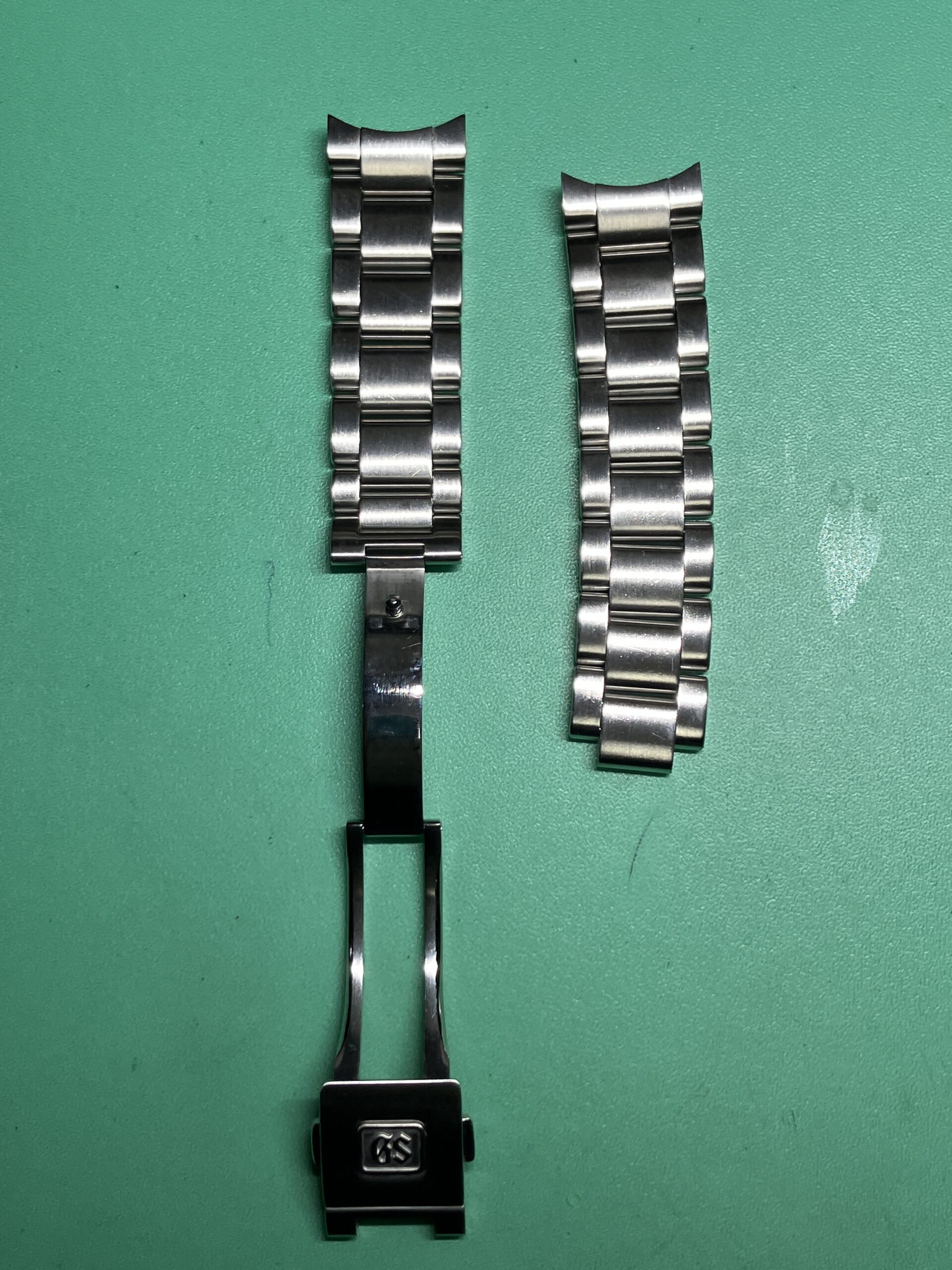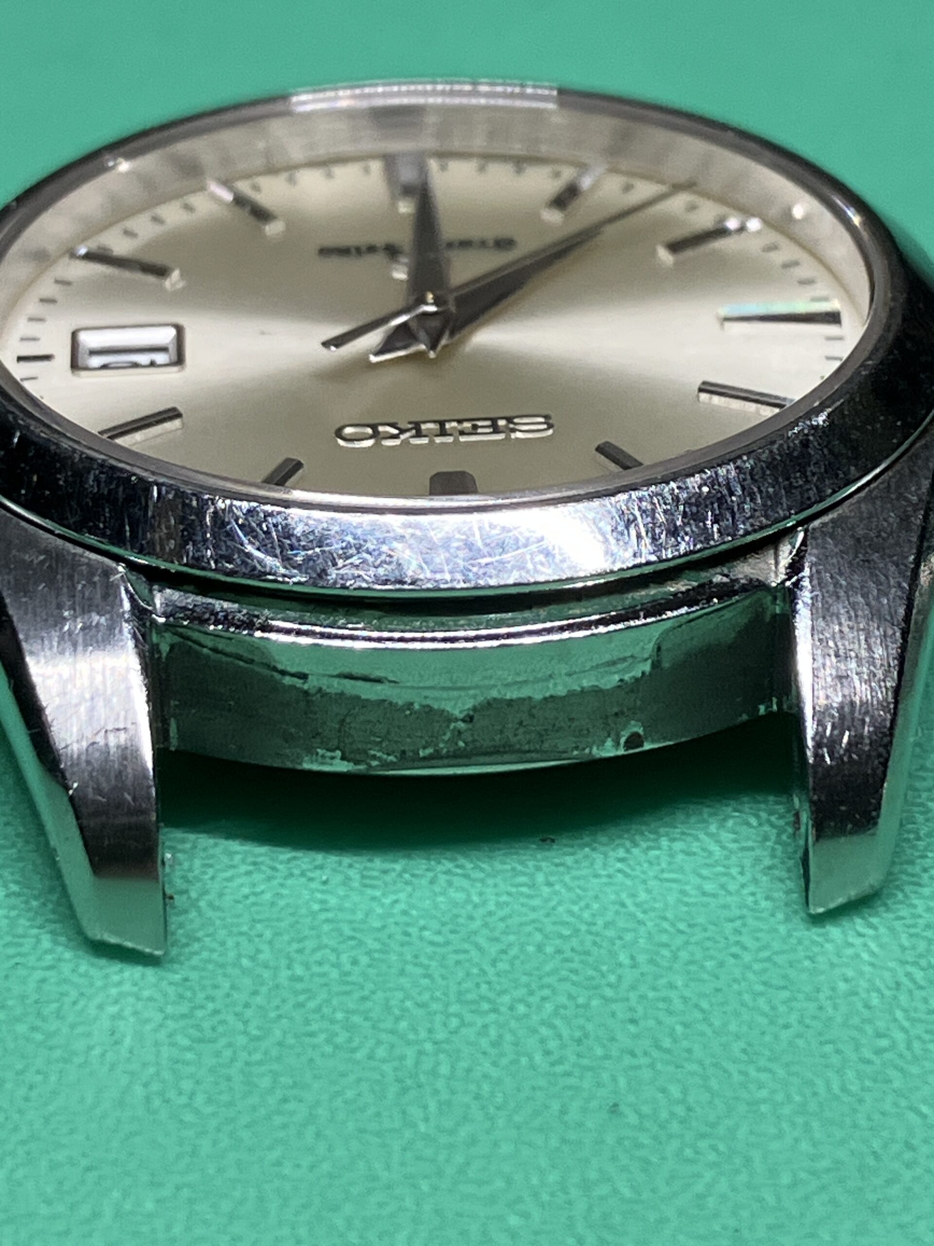 またオーバーホールとともにケースとブレスレットのキズ取り研磨もさせていただきました。ケースは鏡面仕上げとヘアライン仕上げの組合せ、ブレスレットはヘアライン仕上げとなっています。裏ブタについては刻印が消えてしまう可能性があったため、中心部のヘアラインは行わず、周りの鏡面部分のみ磨きを入れています。