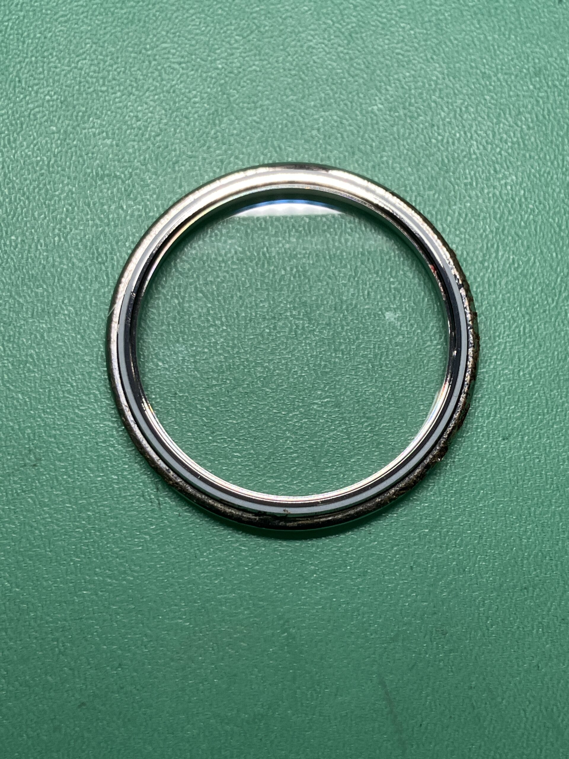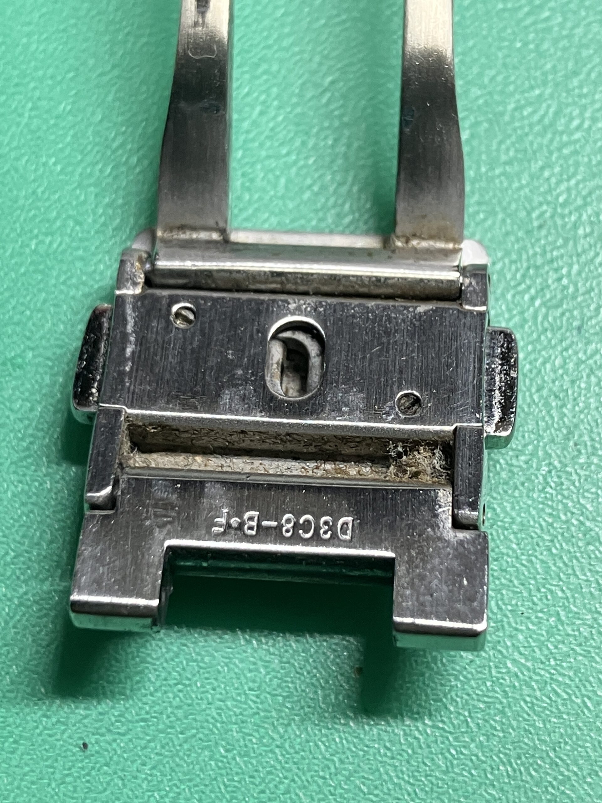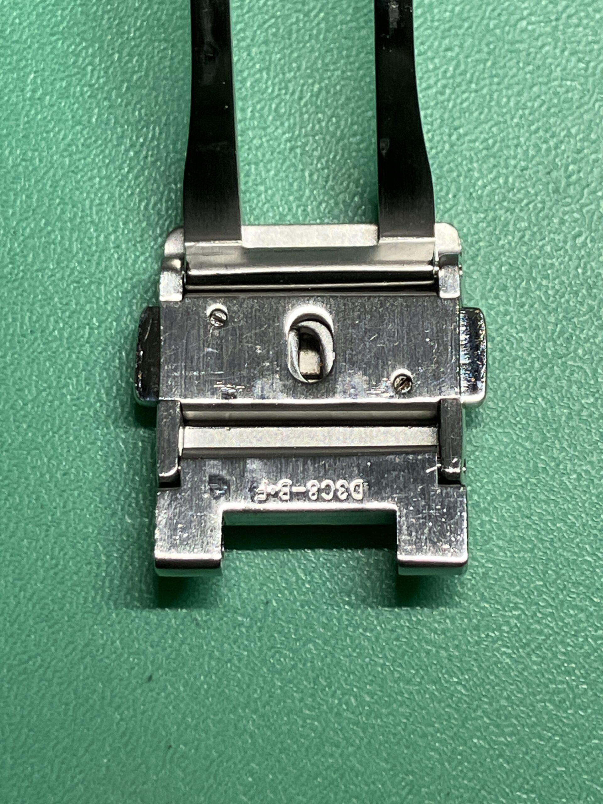 またオーバーホールとともにケースとブレスレットのキズ取り研磨もさせていただきました。ケースは鏡面仕上げとヘアライン仕上げの組合せ、ブレスレットはヘアライン仕上げとなっています。裏ブタについては刻印が消えてしまう可能性があったため、中心部のヘアラインは行わず、周りの鏡面部分のみ磨きを入れています。