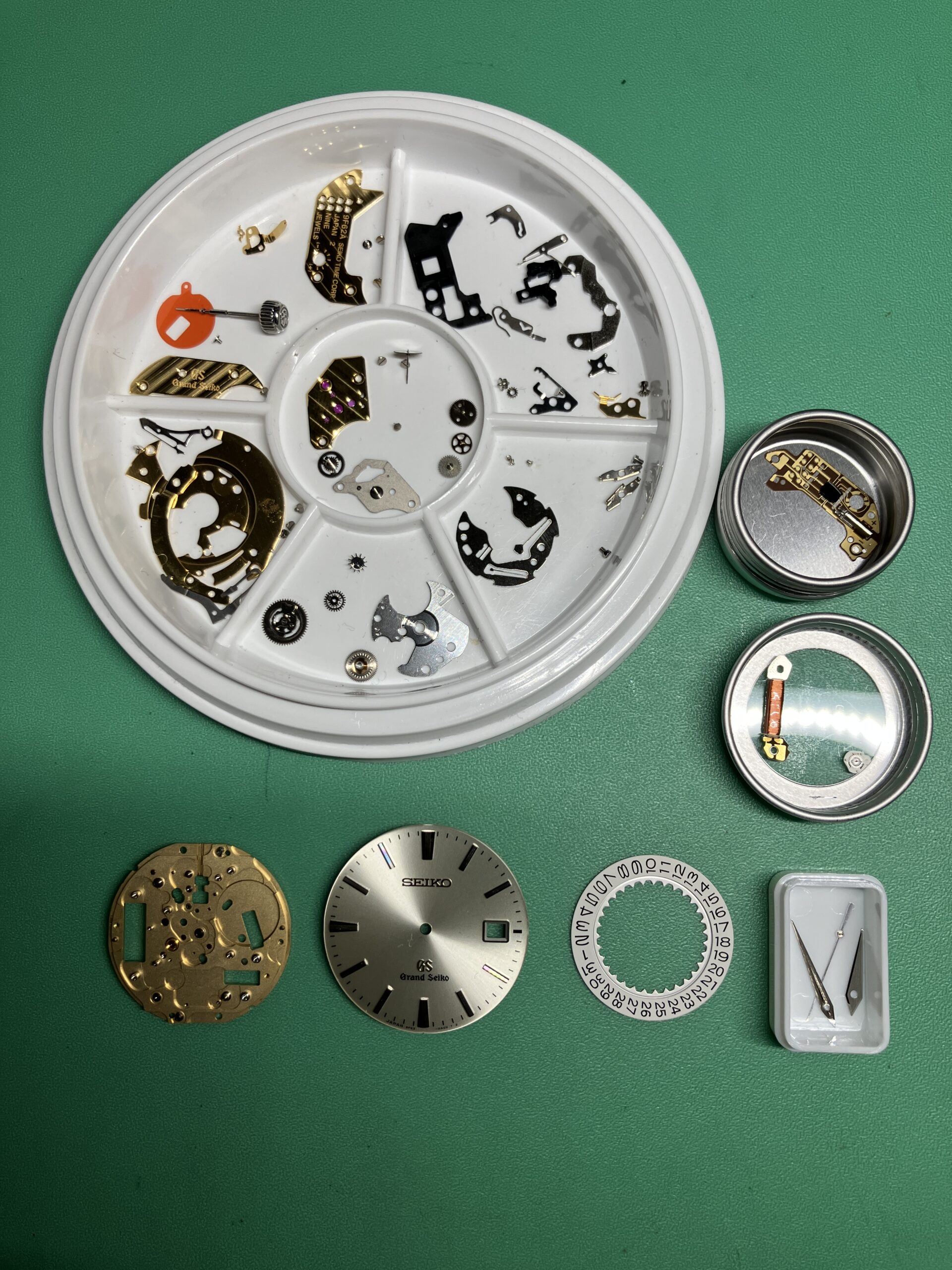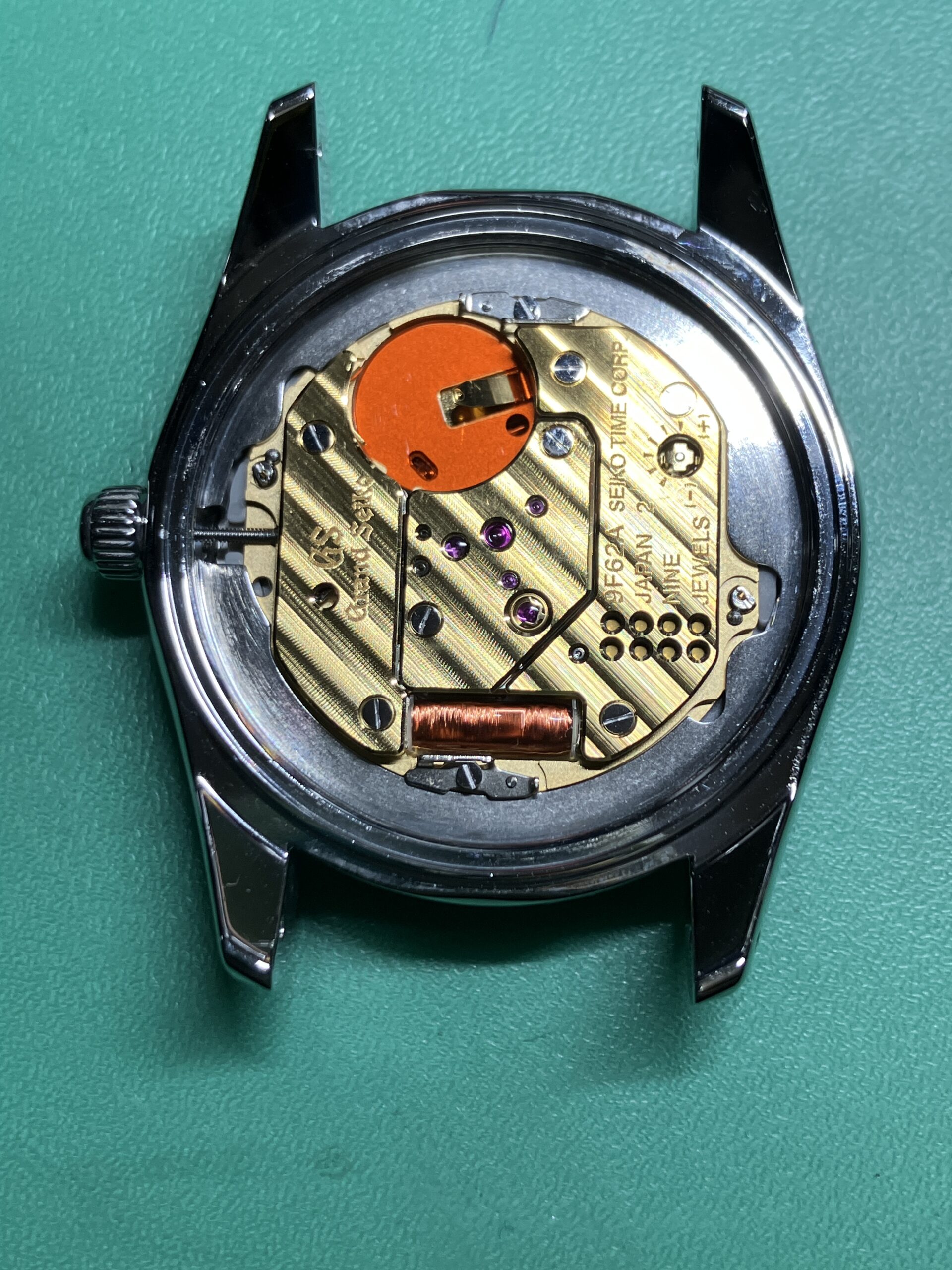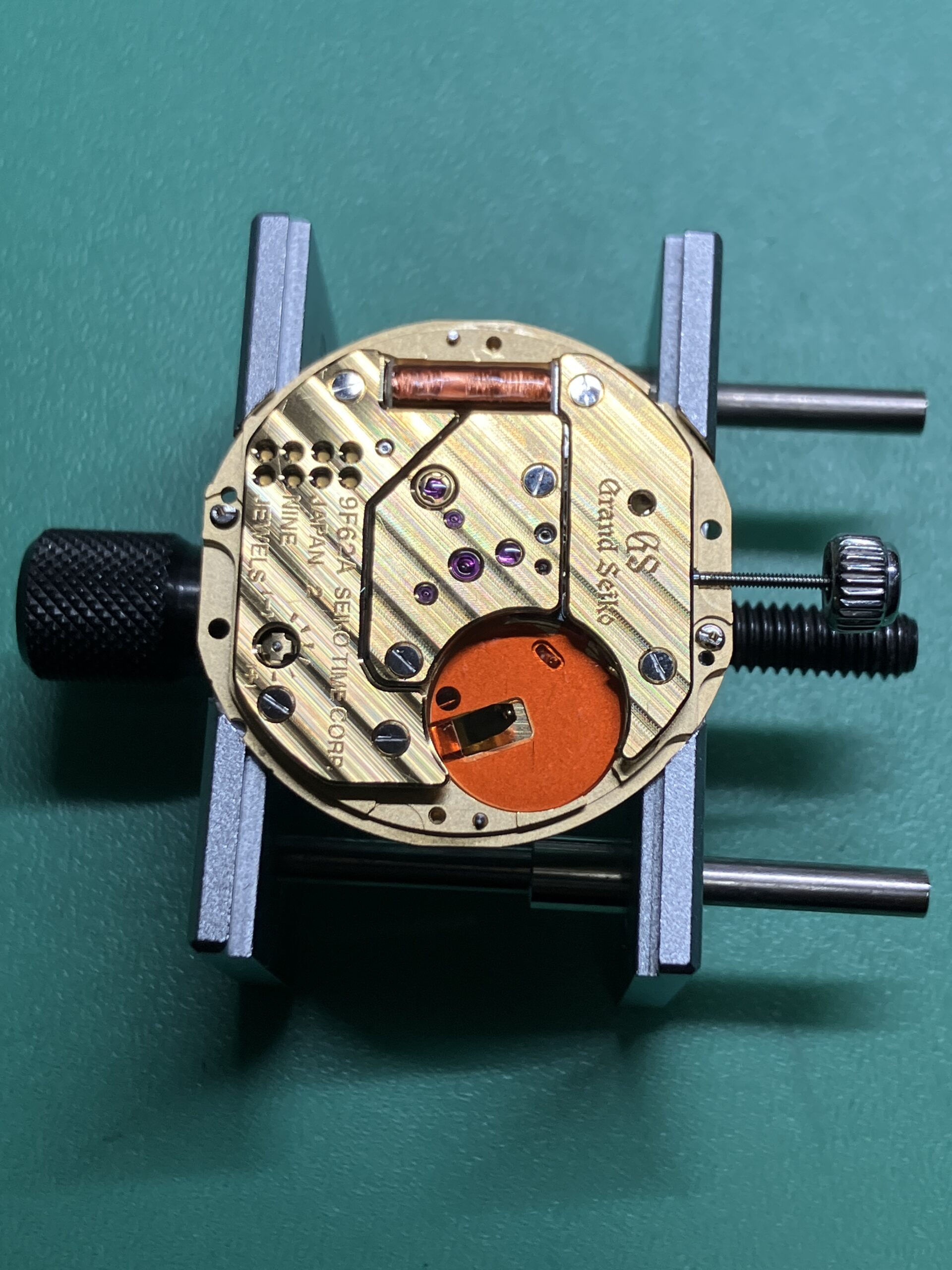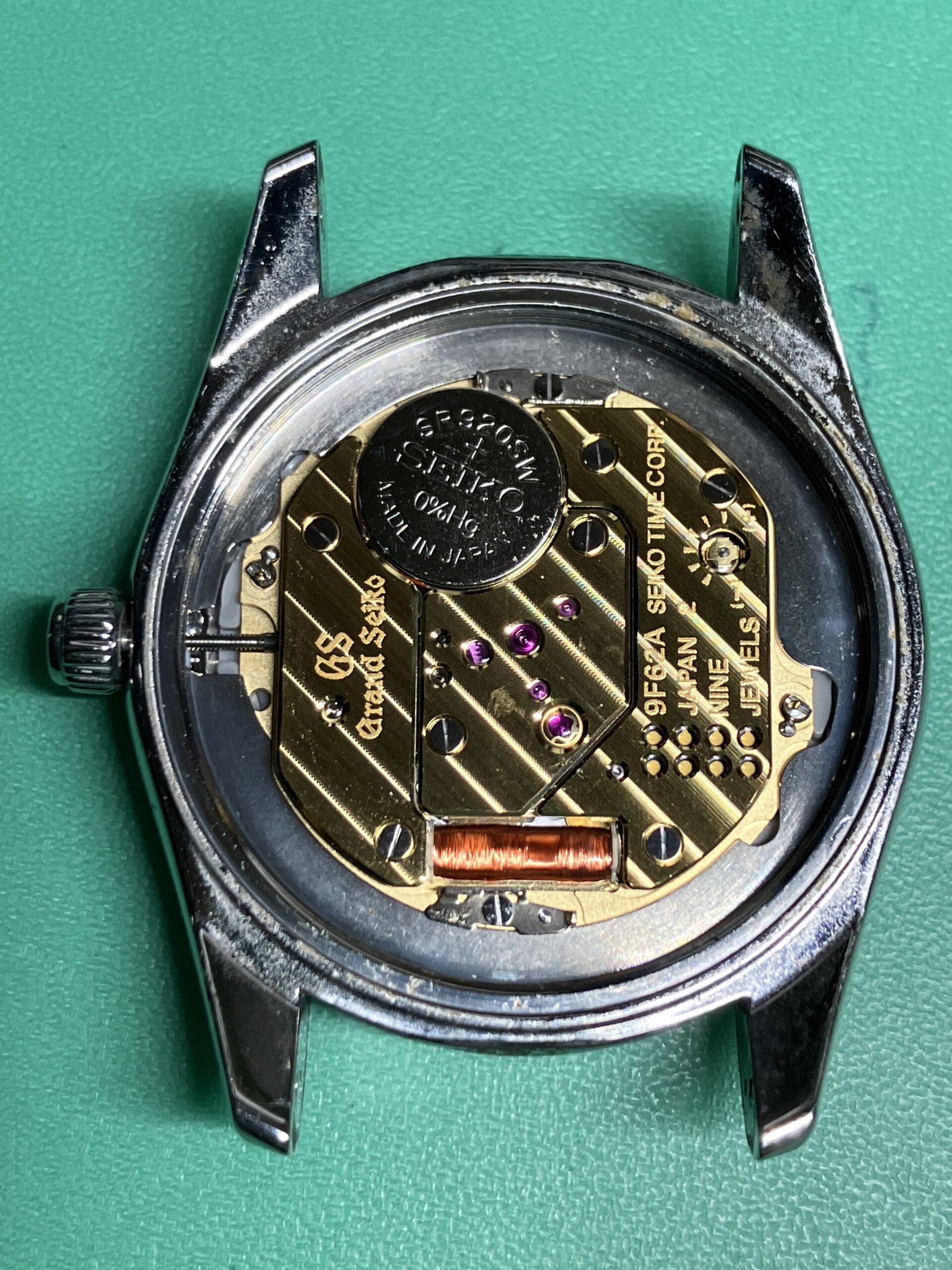 電池切れによる不動の状態でしたが、2013年4月に購入され、電池交換のみで一度もメンテナンスをされていないということで、分解、洗浄、注油、組立のオーバーホールをさせていただきました。流石に9F62クオーツ、一般のクオーツムーブメントとはレベルが違いました。また初期のGSのムーブメントとも比べても大きく進化しています。クオーツ時計でも稼働部分の油の経年劣化、減少が原因で精度に影響が出てくる場合があります。折角のグランドセイコーなので定期にメンテナンスを行い、永くお使いいただきたいと思います。