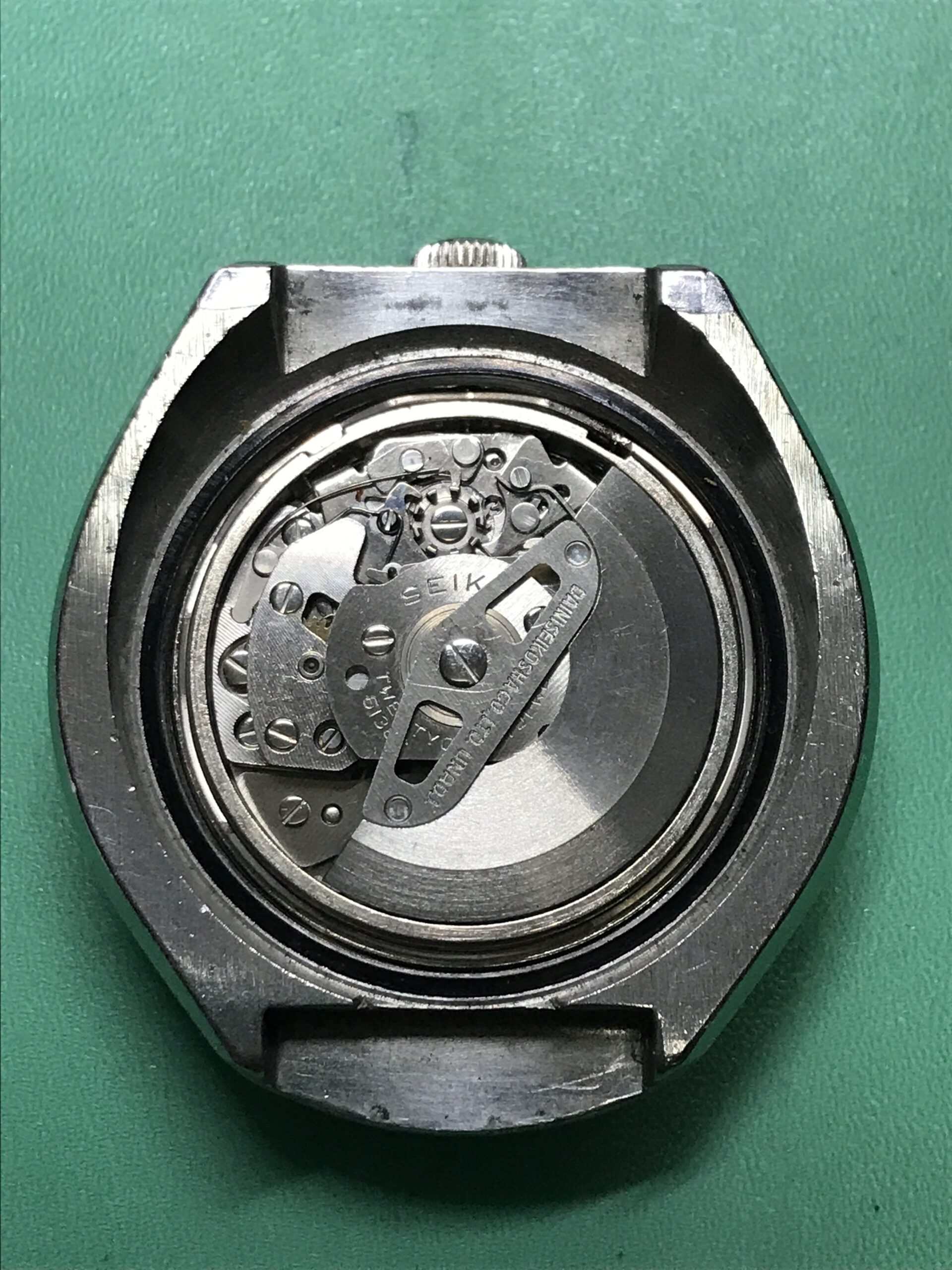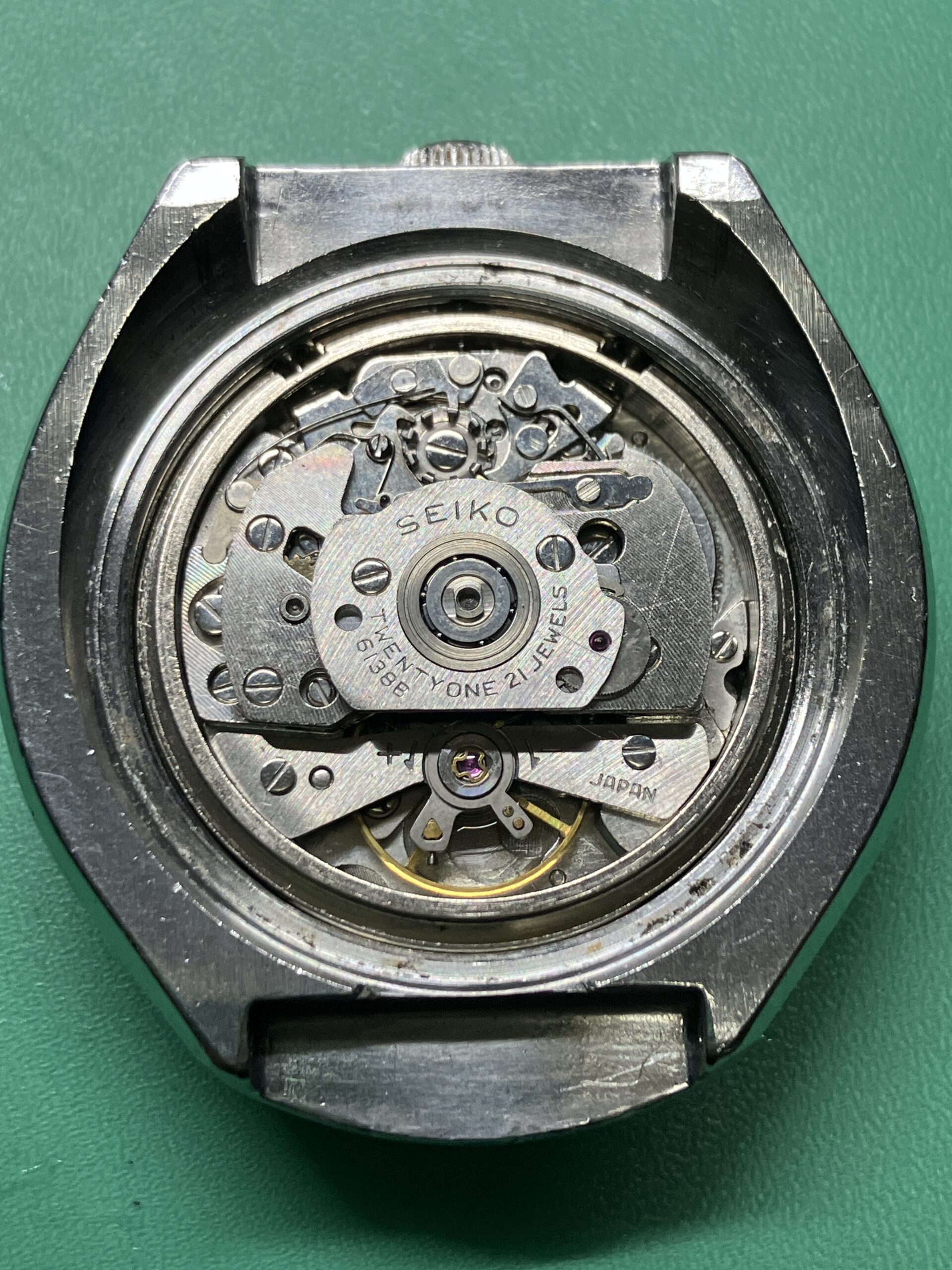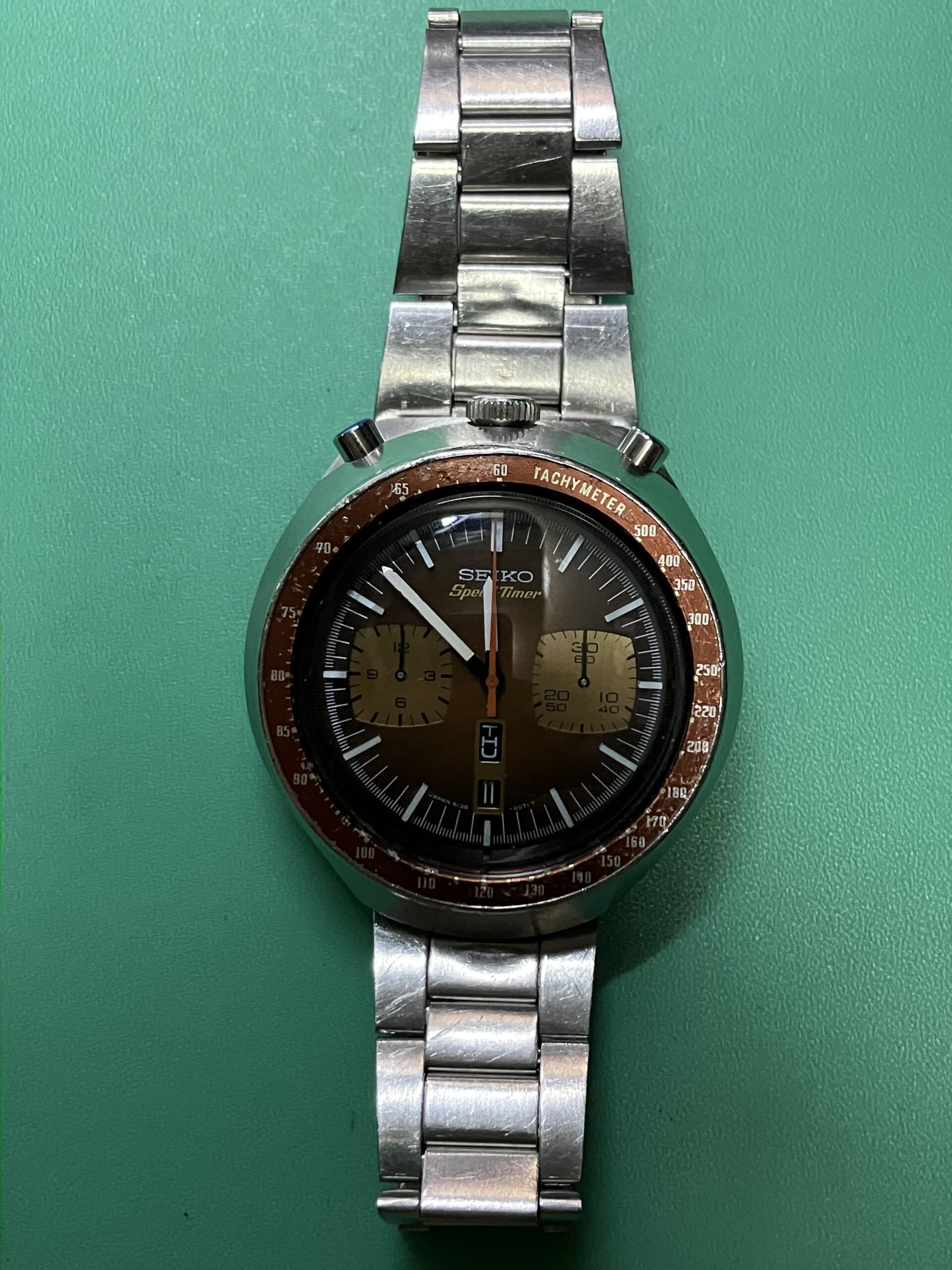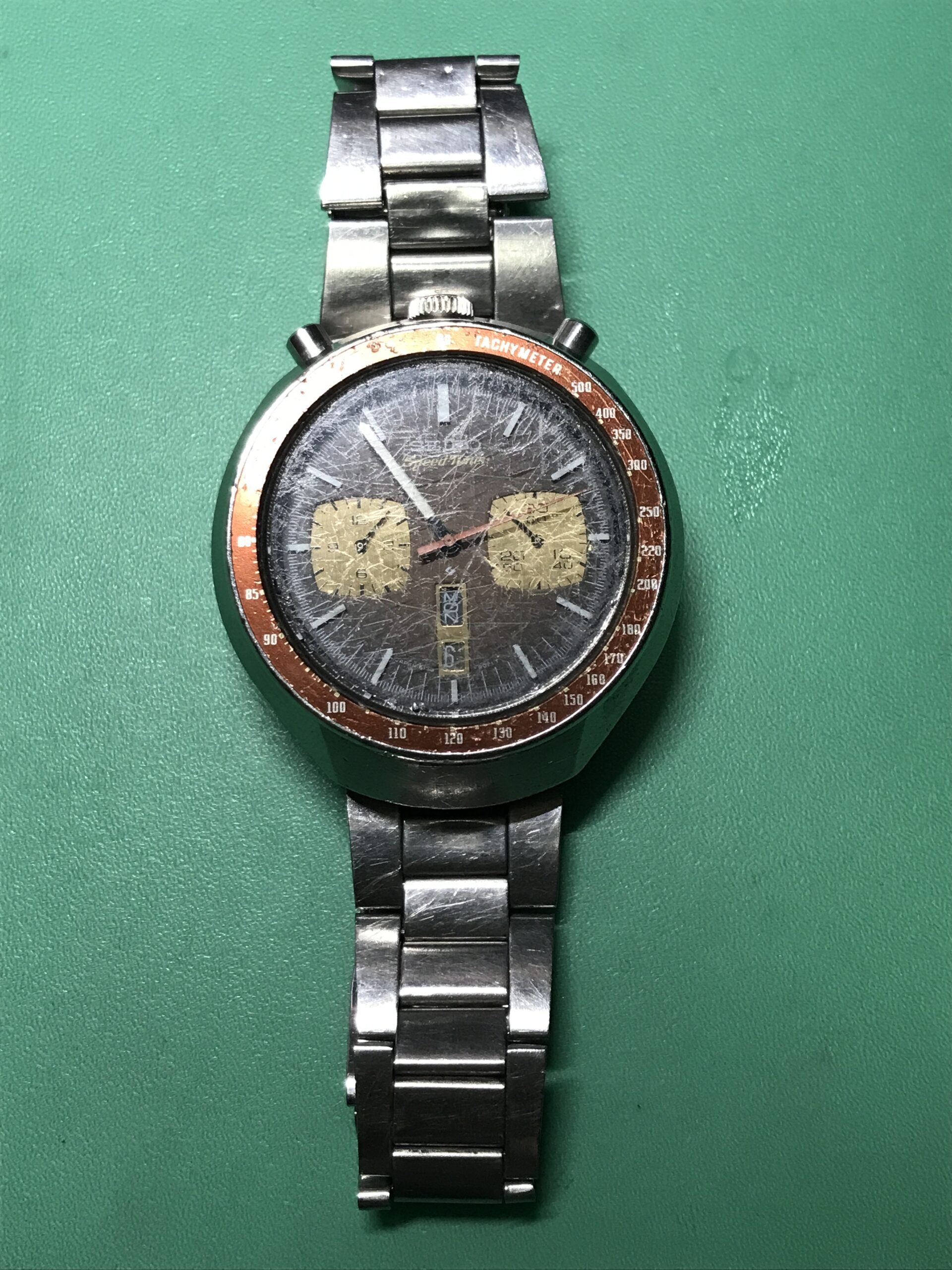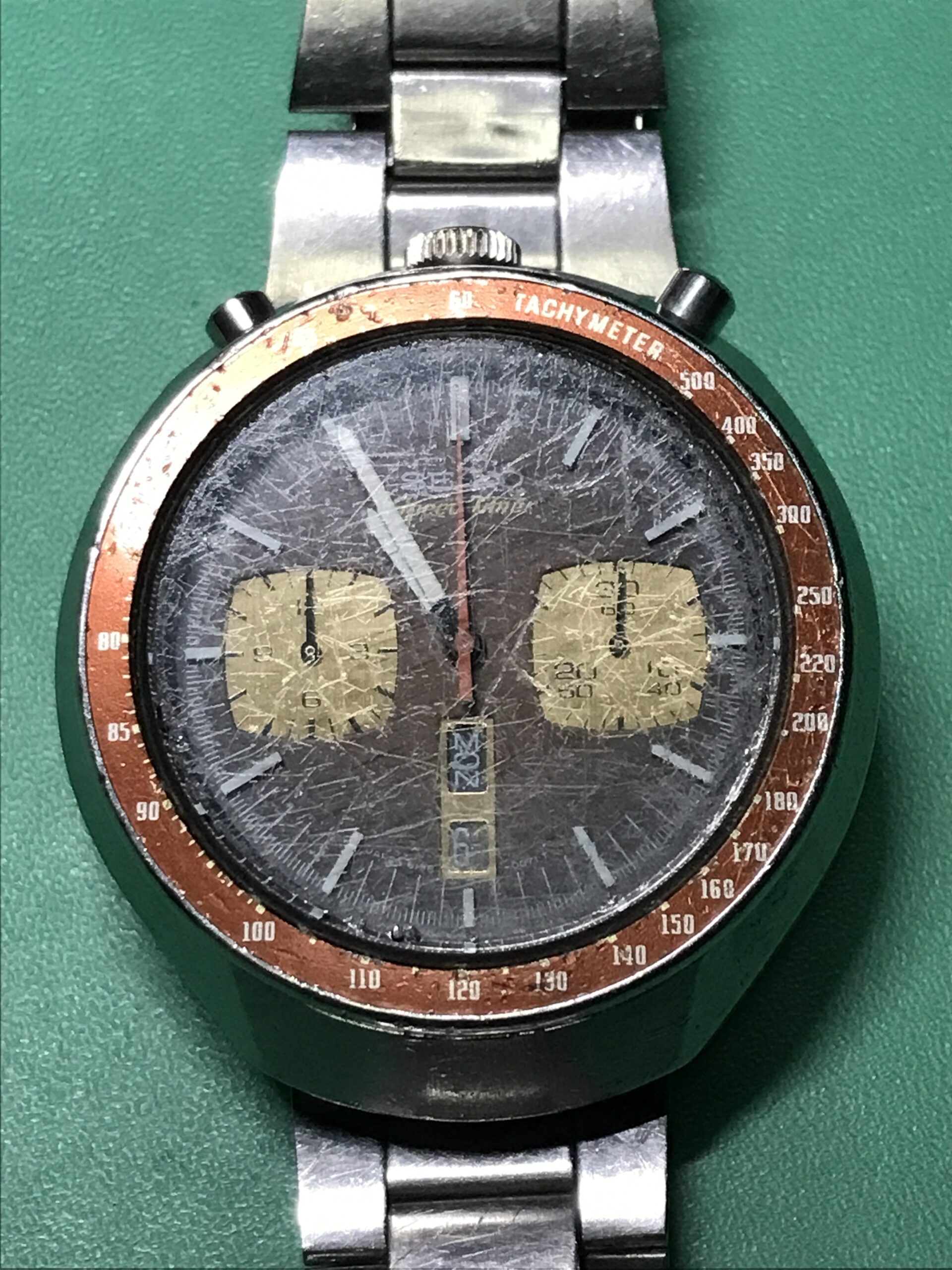 お預かお預かりした時計はSEIKO SPEED TIMER、モデルナンバー6138-0040、通称「茶馬」や「ブルヘッド」の愛称で親しまれている、セイコーの自動巻クロノグラフですね。このクロノグラフは、垂直クラッチ式+コラム小イールで世界初の量産自動巻クロノグラフと言われているSEIKO Cal. 6139(1969年に諏訪セイコーの大木俊彦氏が開発)を発展させたCal. 6138Bが搭載されています。6139との違いは12時間積算計が加わっていることです。