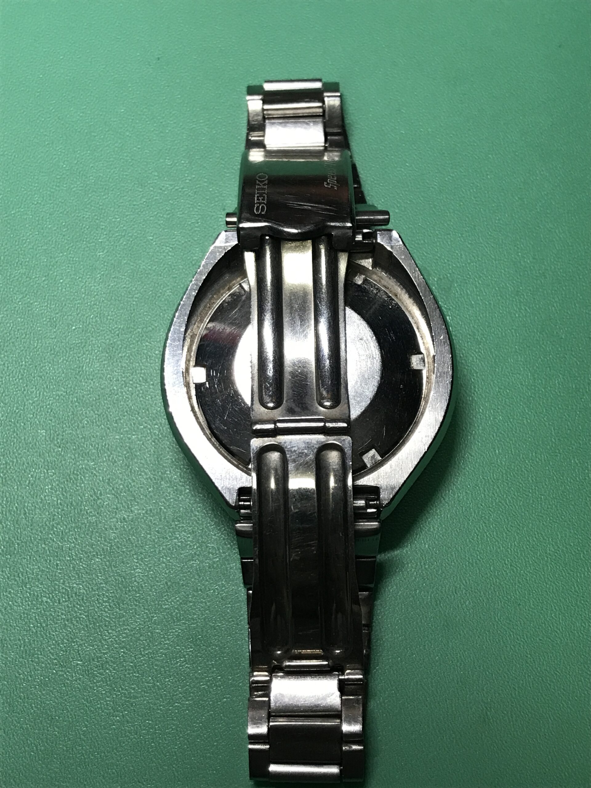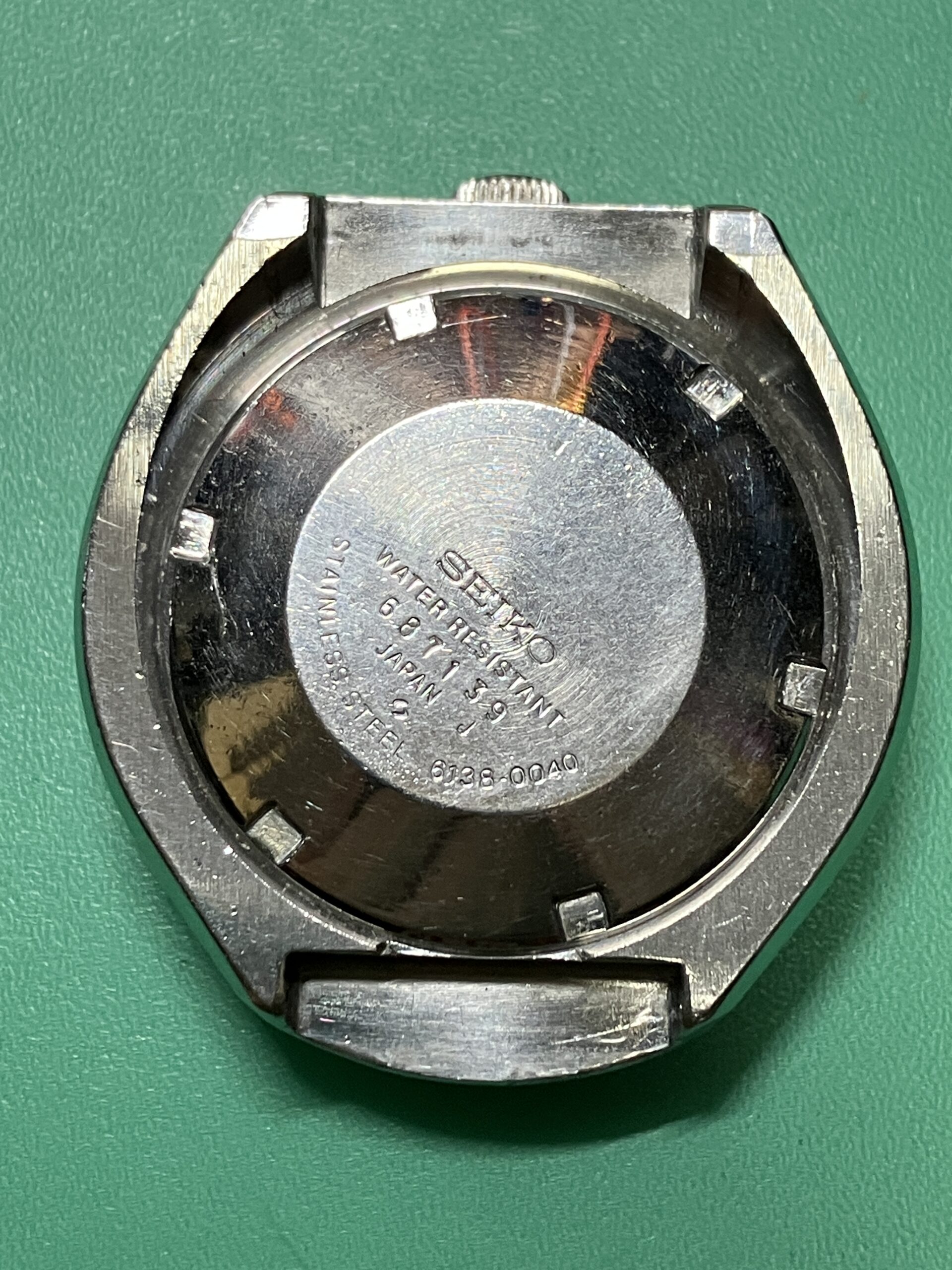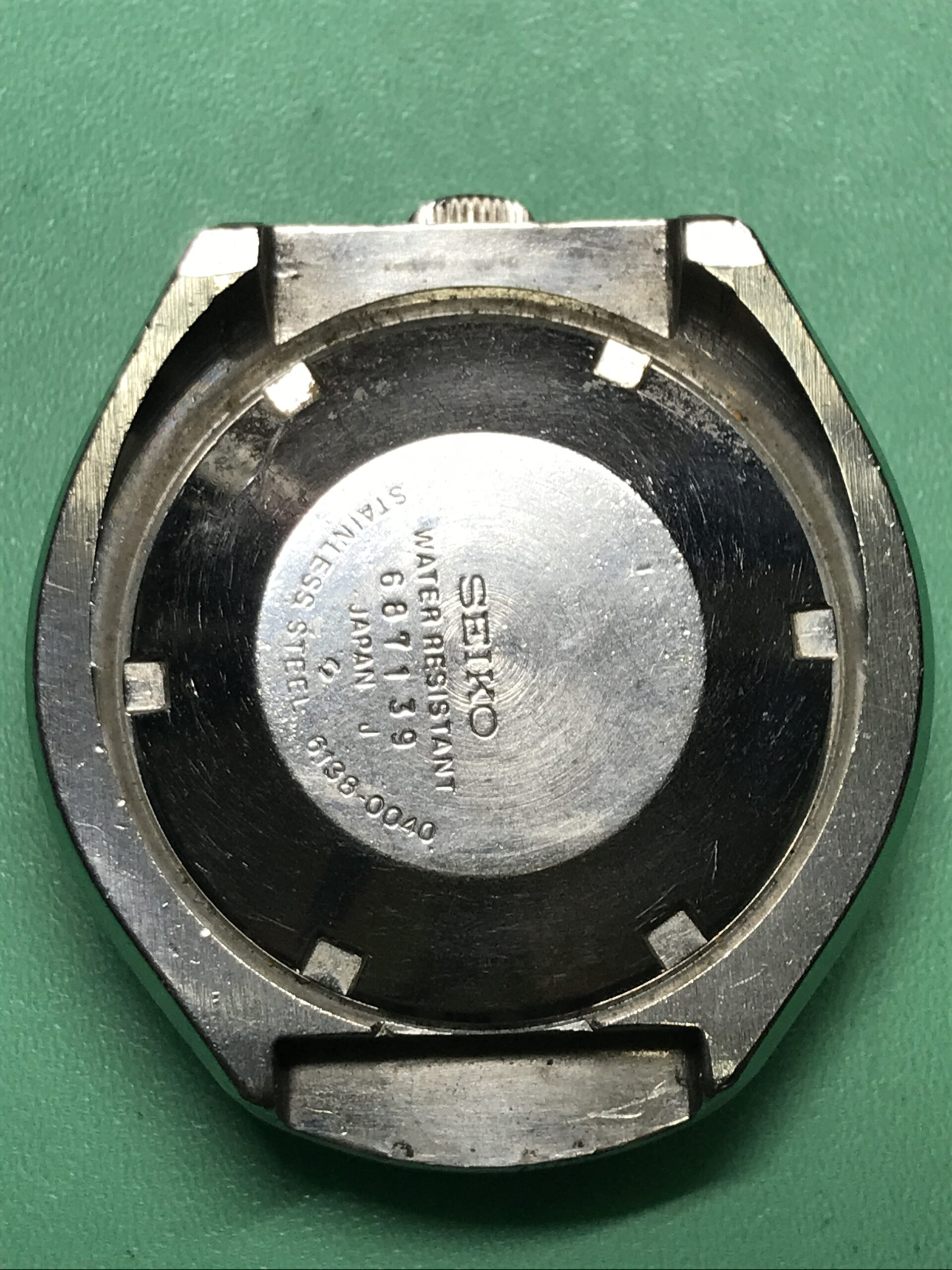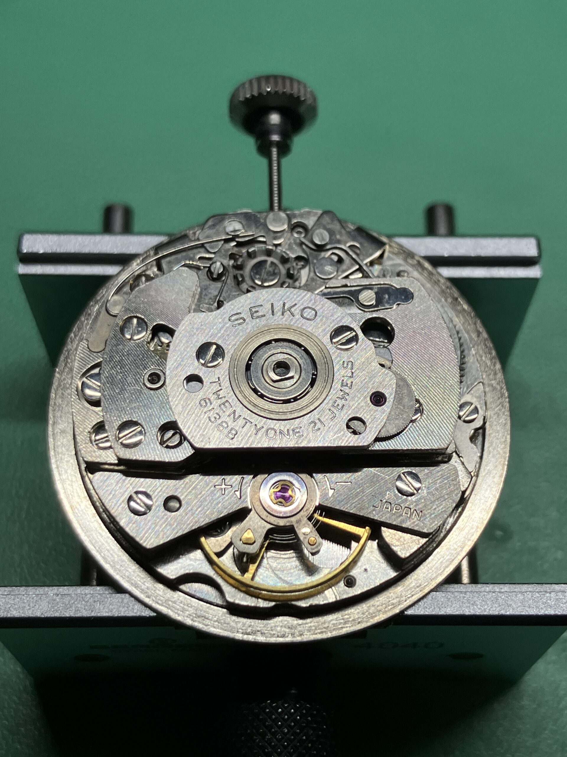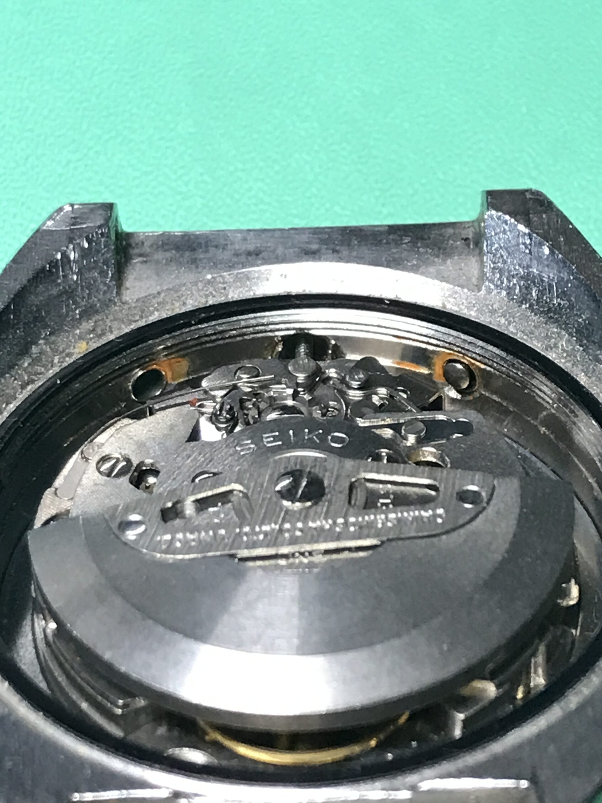 お預かお預かりした時計はSEIKO SPEED TIMER、モデルナンバー6138-0040、通称「茶馬」や「ブルヘッド」の愛称で親しまれている、セイコーの自動巻クロノグラフですね。このクロノグラフは、垂直クラッチ式+コラム小イールで世界初の量産自動巻クロノグラフと言われているSEIKO Cal. 6139(1969年に諏訪セイコーの大木俊彦氏が開発)を発展させたCal. 6138Bが搭載されています。6139との違いは12時間積算計が加わっていることです。