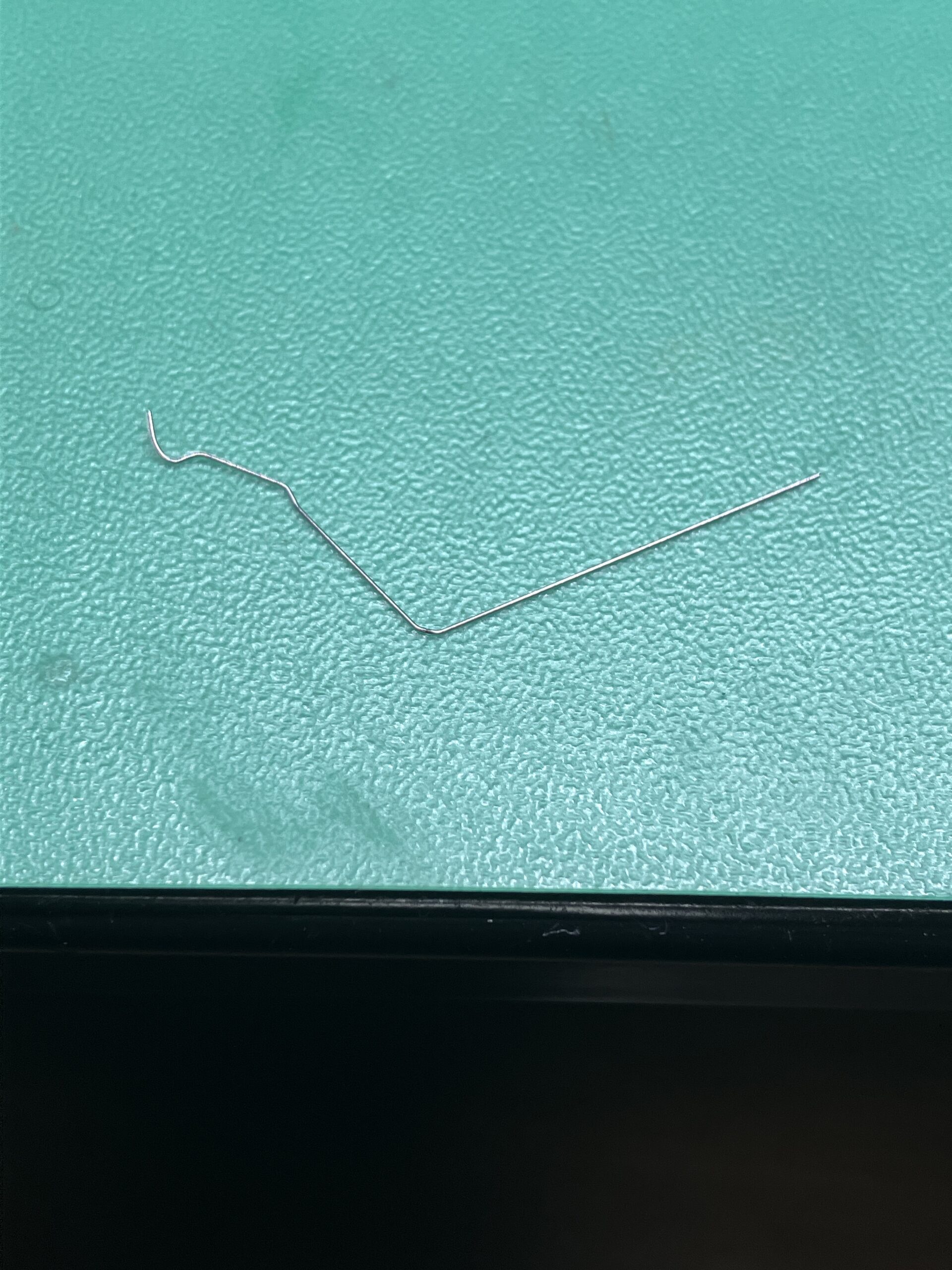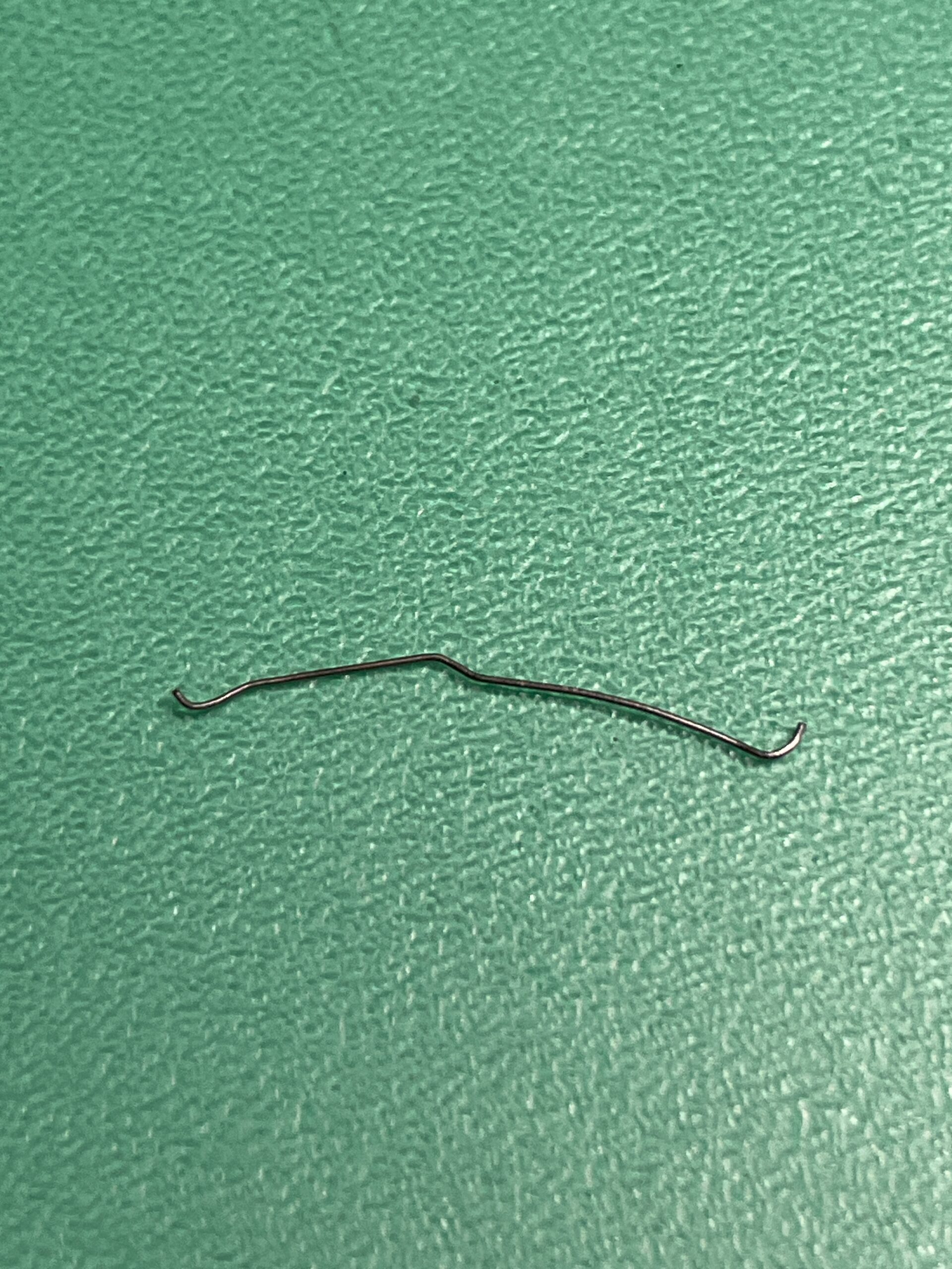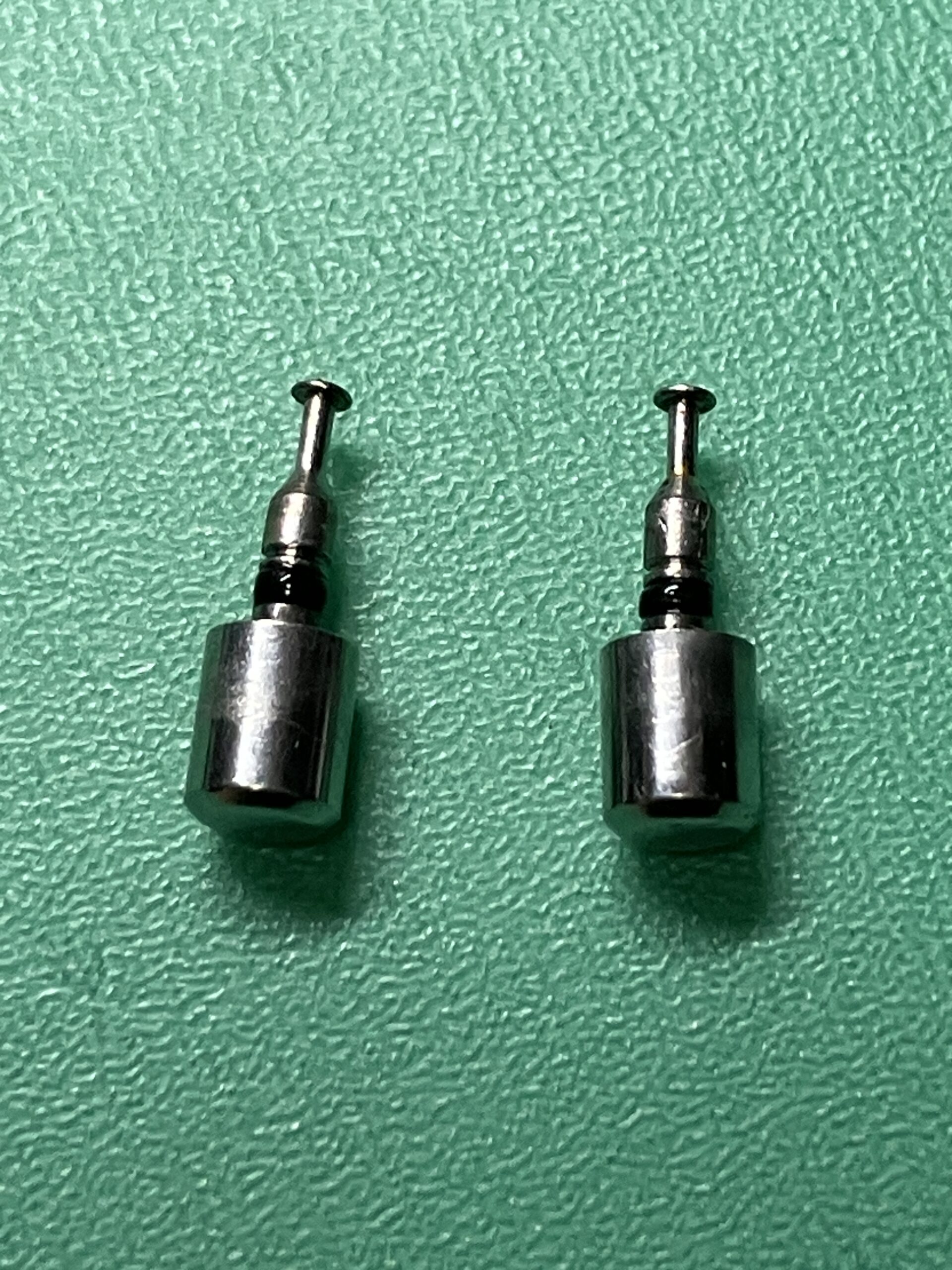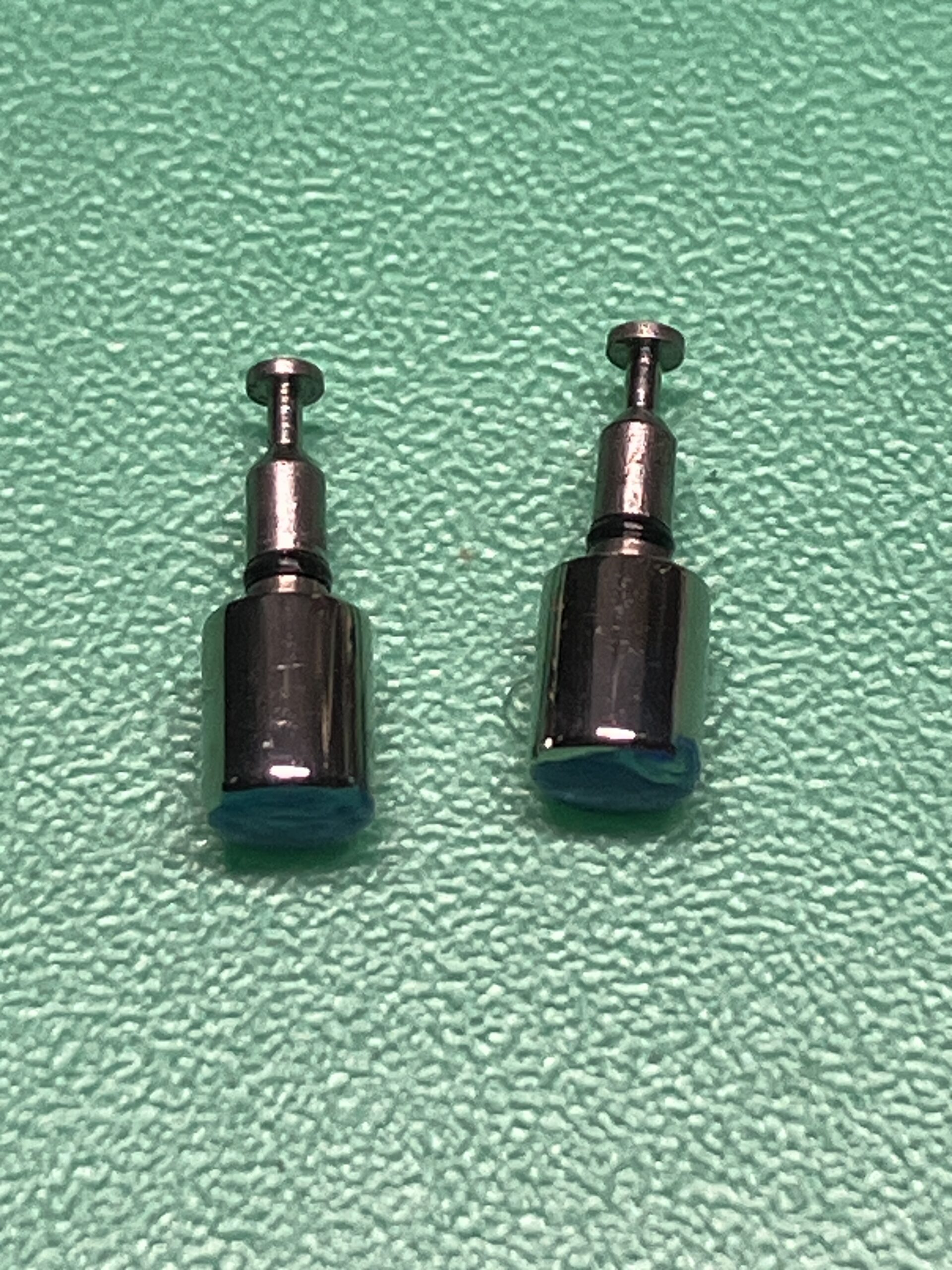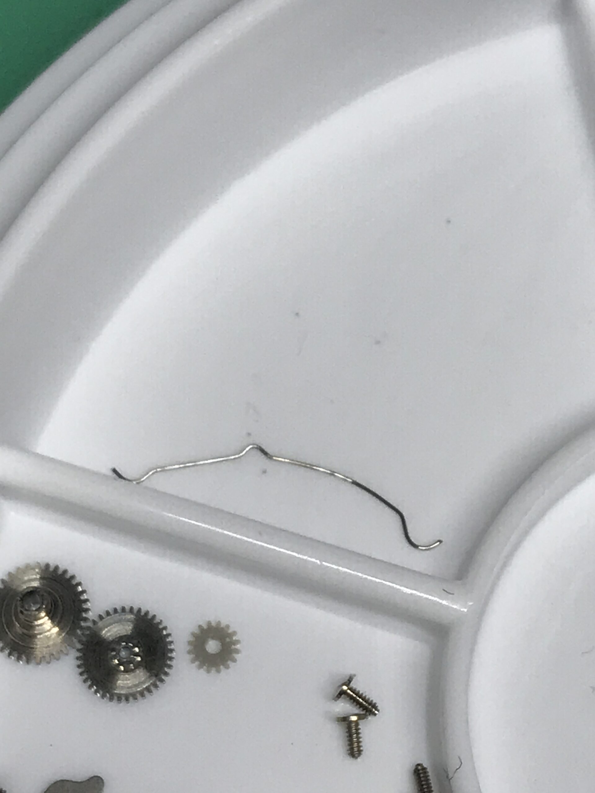 キャリパーの話が長くなりましたが、この垂直クラッチ式のクロノグラフのメンテナンスは初めてだったため、できるだけ資料を集めて、確認しながらオーバーホールを進めました。お預かりした時の状態は、時計、クロノ機能は稼働でしたが、スタート/ストップのプッシュボタンが戻らない症状がありました。これは分解、洗浄、注油で解決するかと思っていましたが、確認するとボタンの軸が変形して曲がっており、ご相談の結果、新品に部品交換させていただきました。