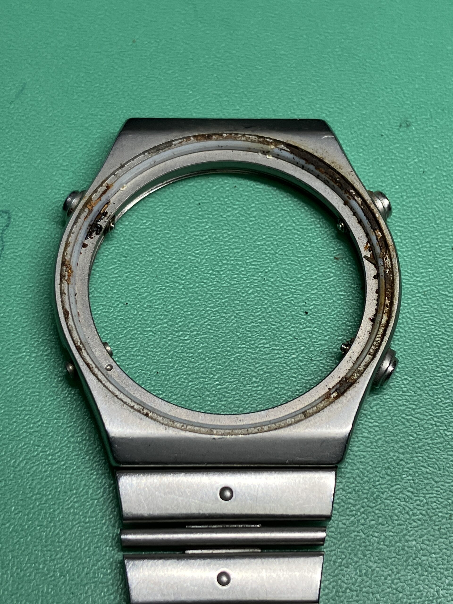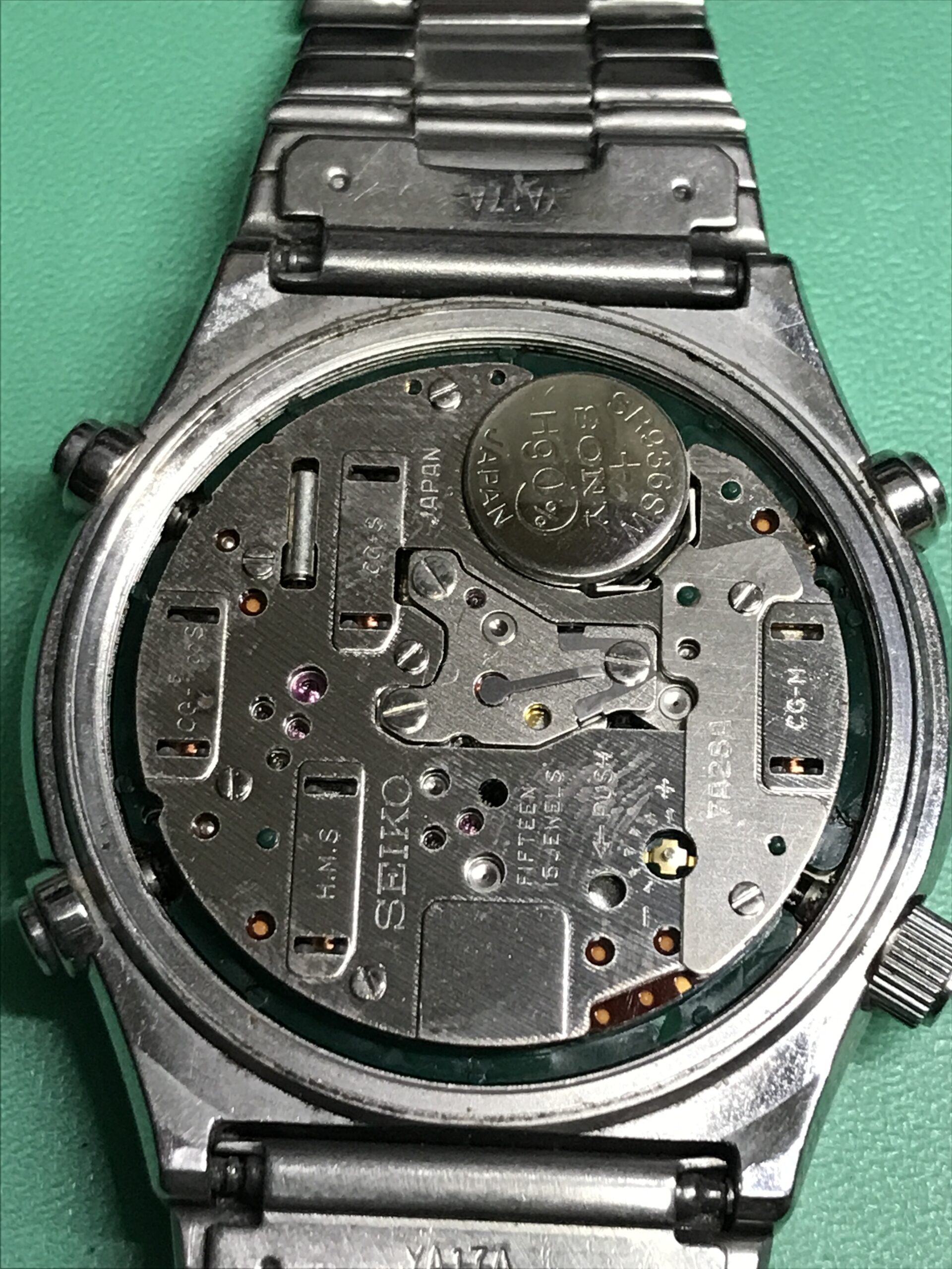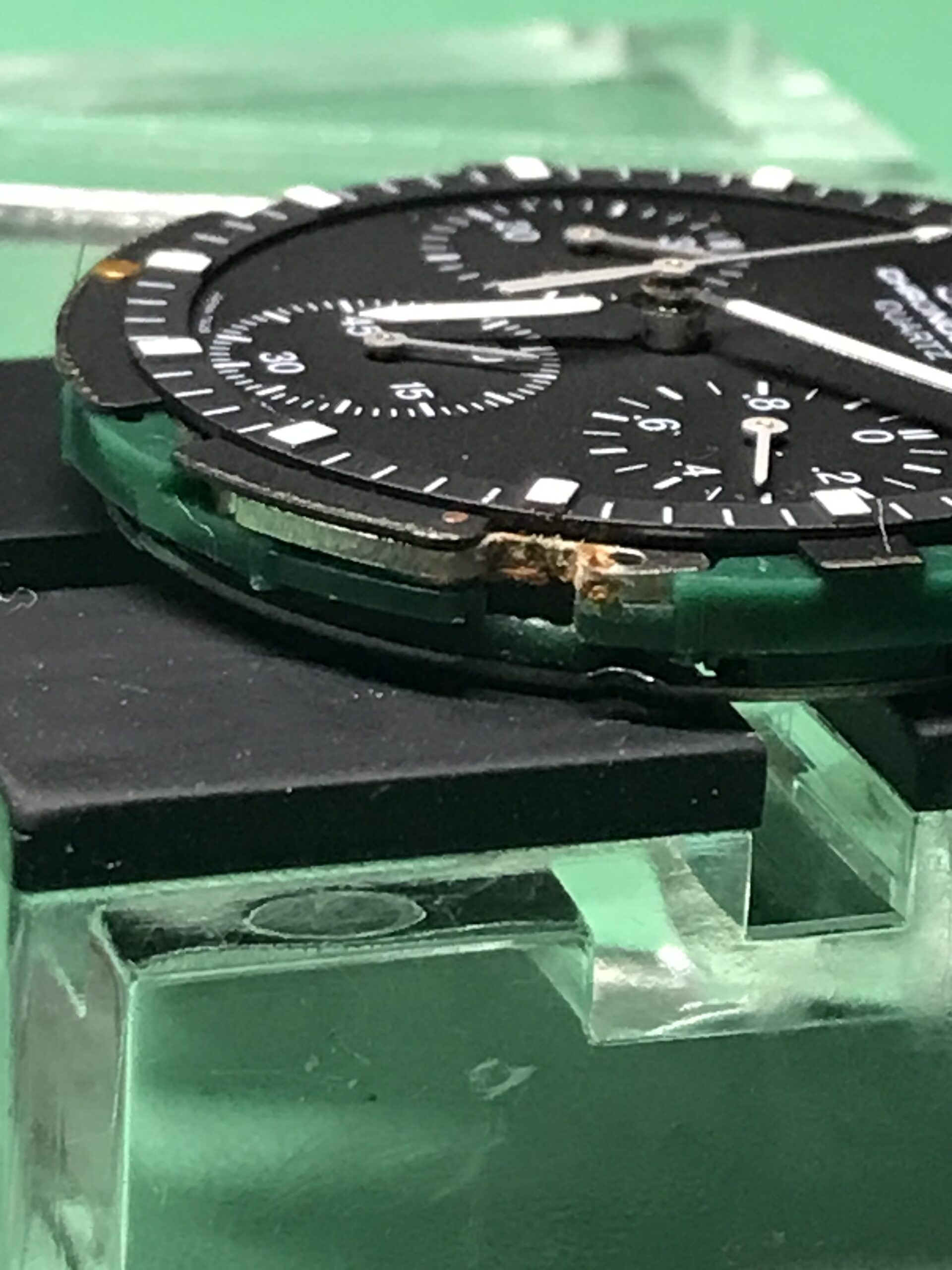 ケース外装のサビは思ったよりひどく、結果としてベゼル、風貌を取り外して除去しました。また内部も3箇所のプッシュボタン、特に4時のリセットボタン周りのサビがひどく、ムーブメント分解を行い除去しました。オーバーホールまでいたしませんでしたが、回路を外すところまで行ったので、見える範囲の歯車軸部への注油はしておきました。