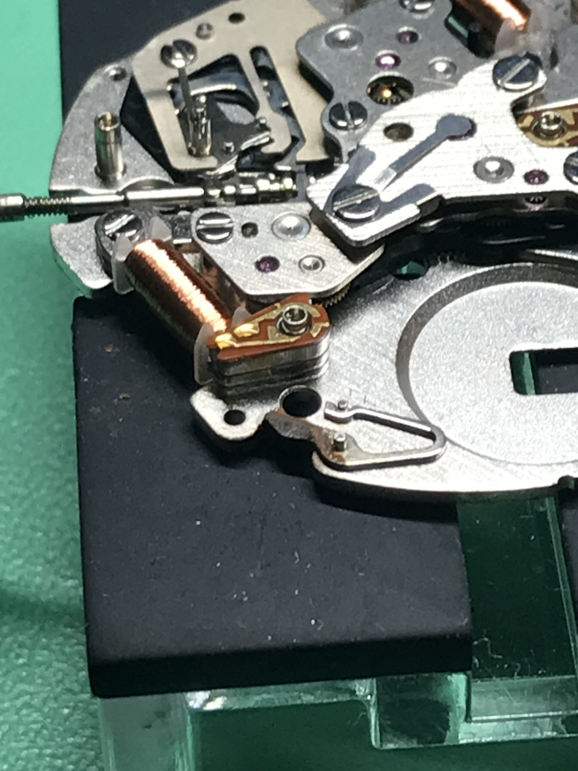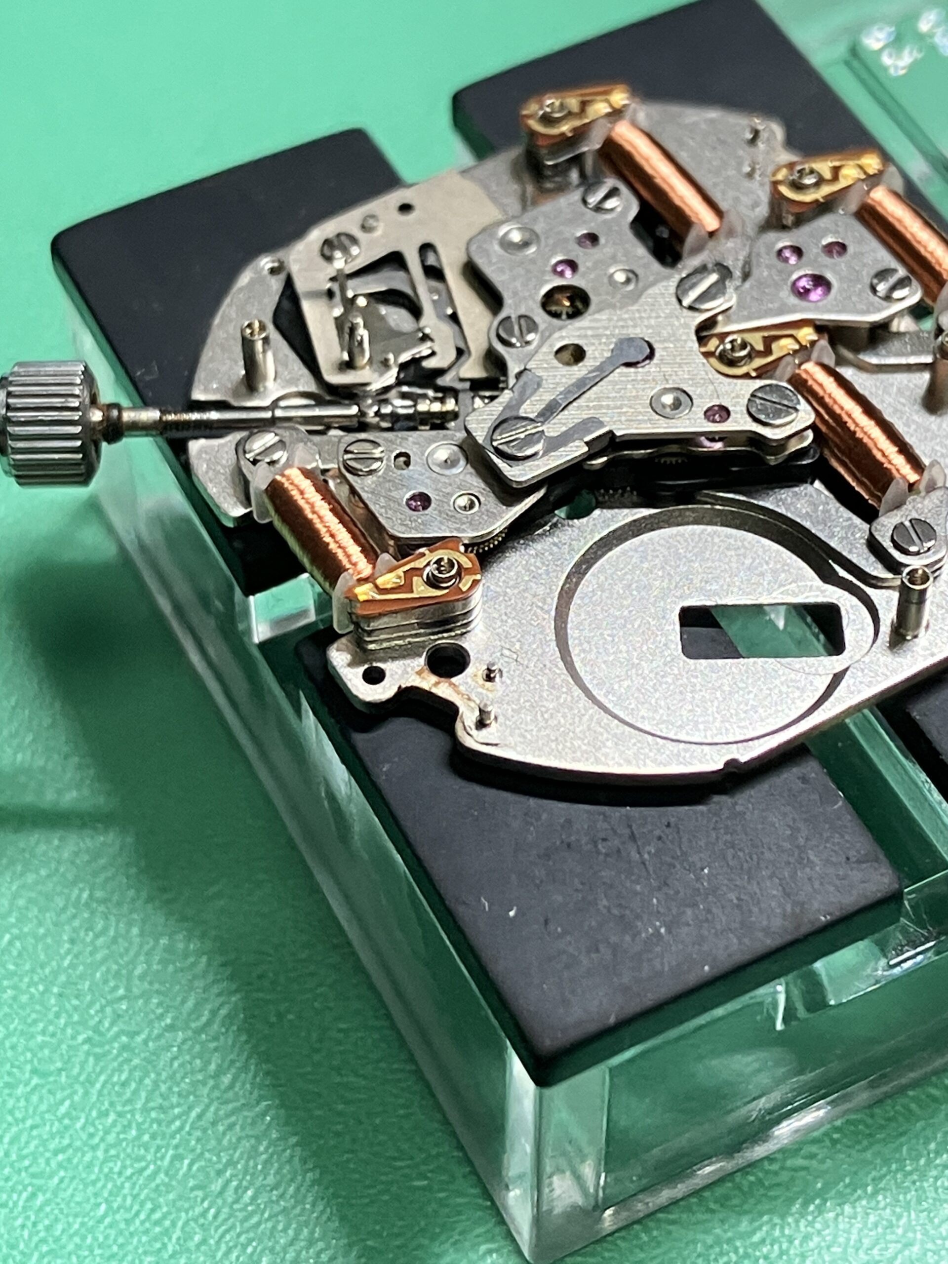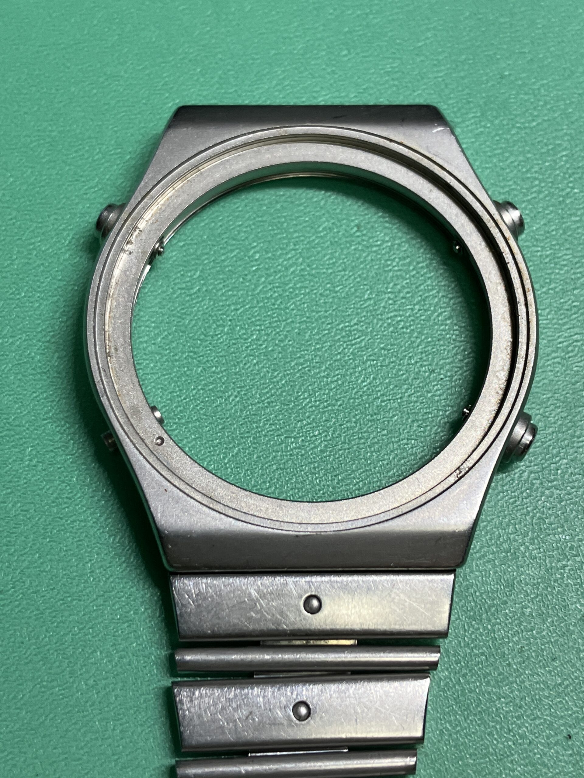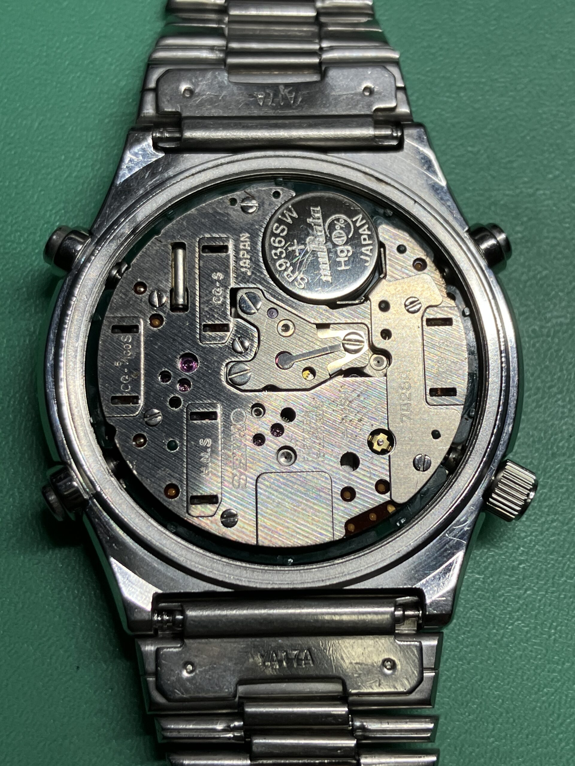 ケース外装のサビは思ったよりひどく、結果としてベゼル、風貌を取り外して除去しました。また内部も3箇所のプッシュボタン、特に4時のリセットボタン周りのサビがひどく、ムーブメント分解を行い除去しました。オーバーホールまでいたしませんでしたが、回路を外すところまで行ったので、見える範囲の歯車軸部への注油はしておきました。