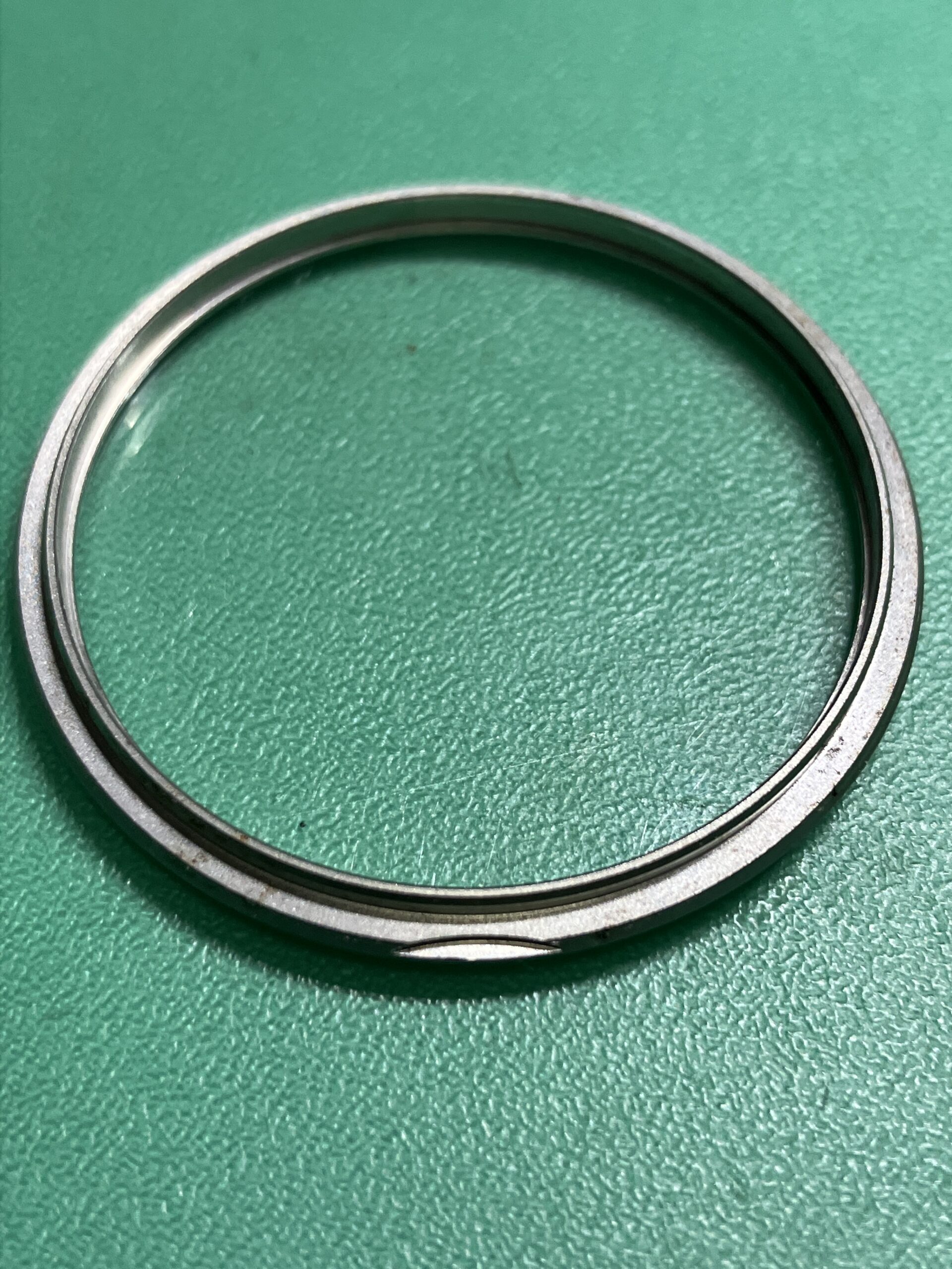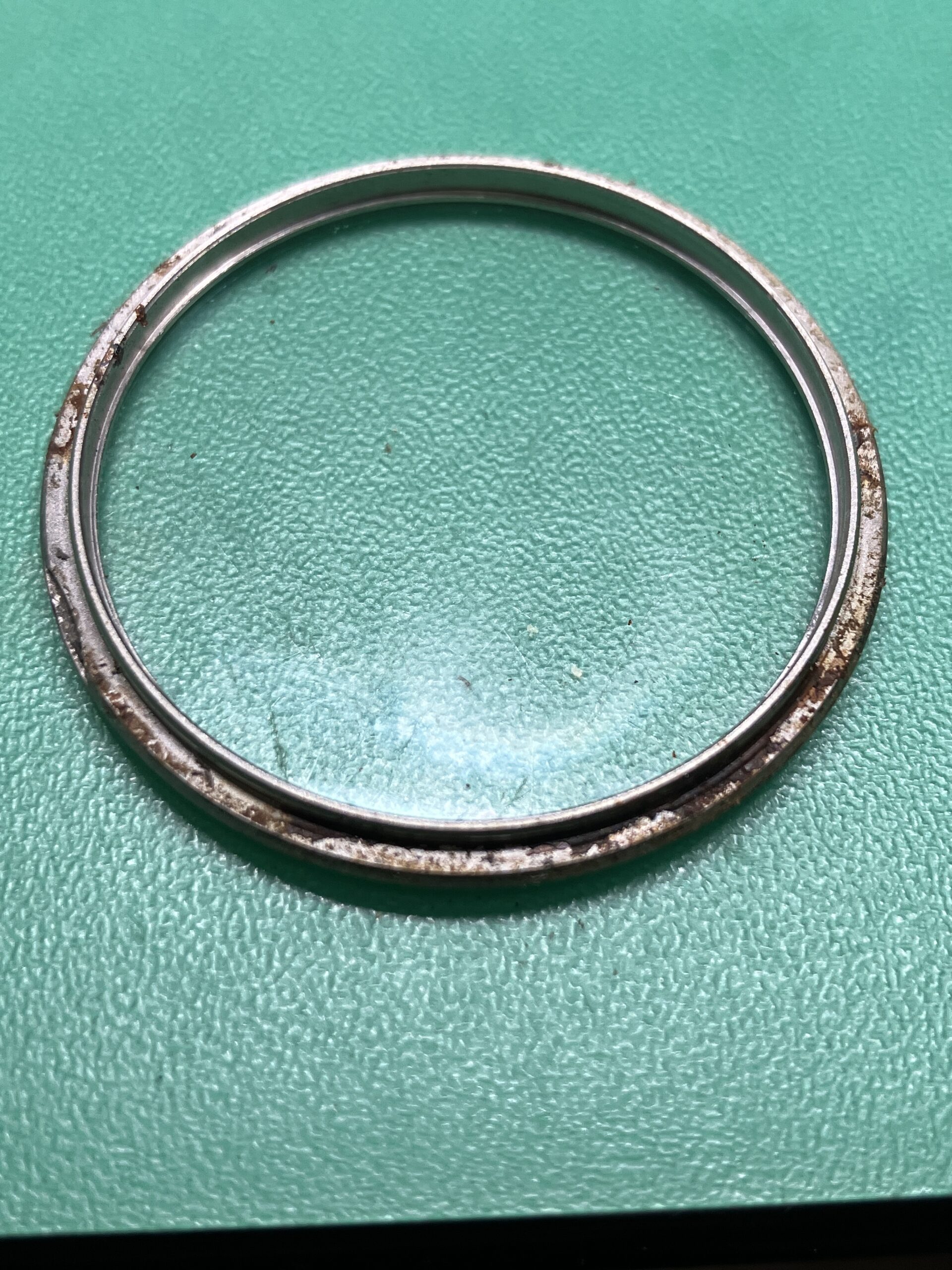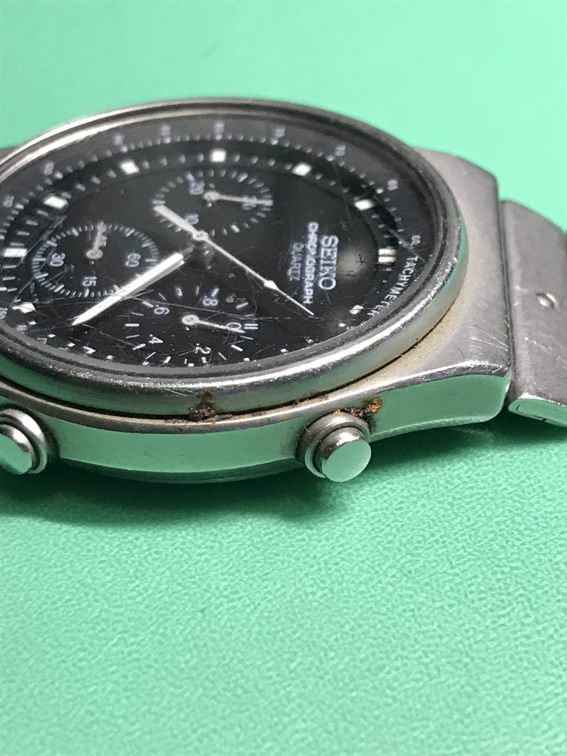 状態としては電池切れによる不動で、クロノグラフも帰零もできない状態でした。またケースのクロノプッシュボタン周り、またリューズ、プッシュボタンから水分侵入により内部にもサビが発生していました。風防はガラス製ですが、流石に40年の年月を経ておりキズが多く入っていました。ただ幸いに電池を交換すれば時計としては稼働しましたので、ご相談し電池交換、クリーニング、ケースの内外のサビ取りを基本に進めさせていただきました。ガラス風防はそのままとなっています。