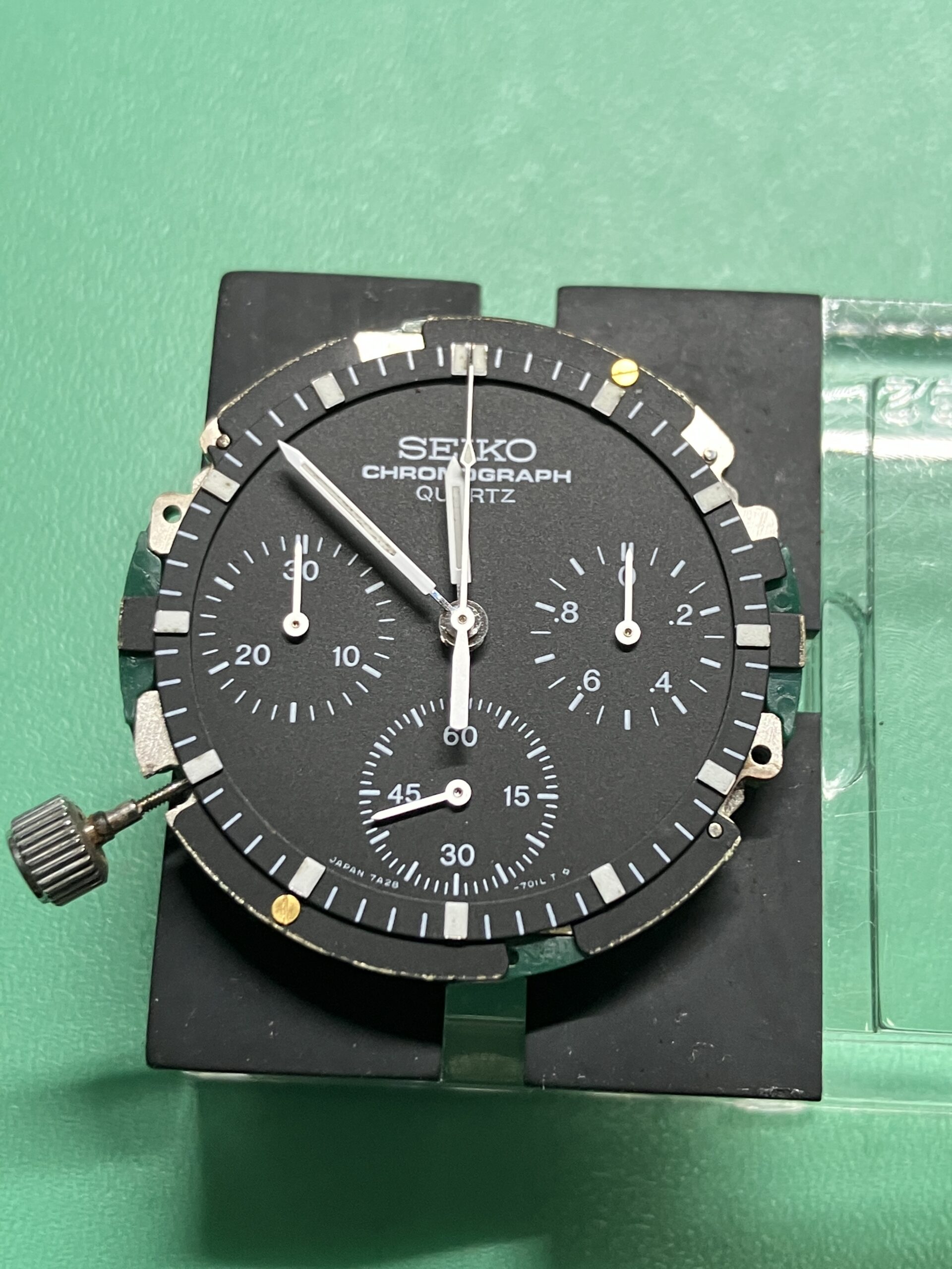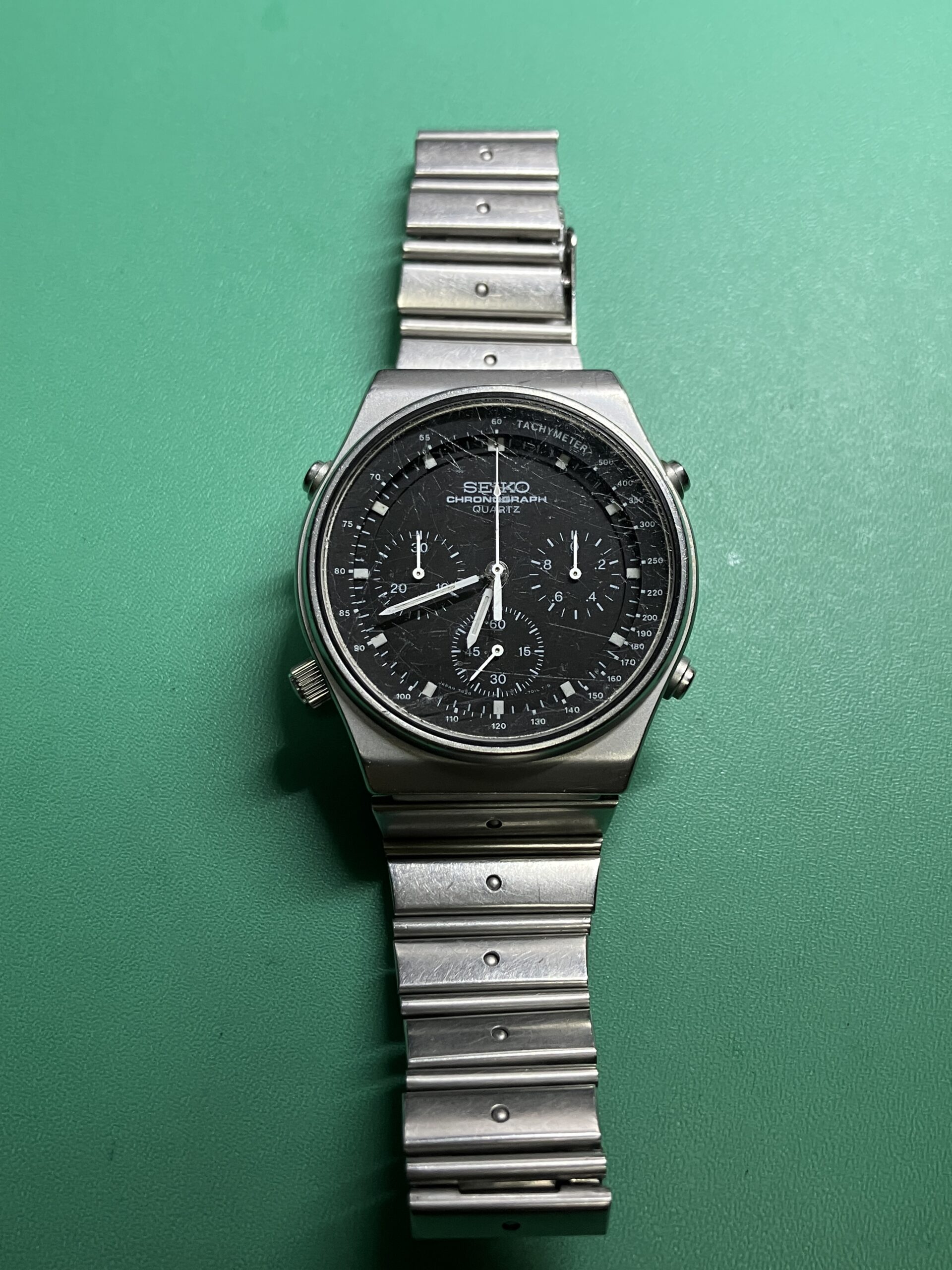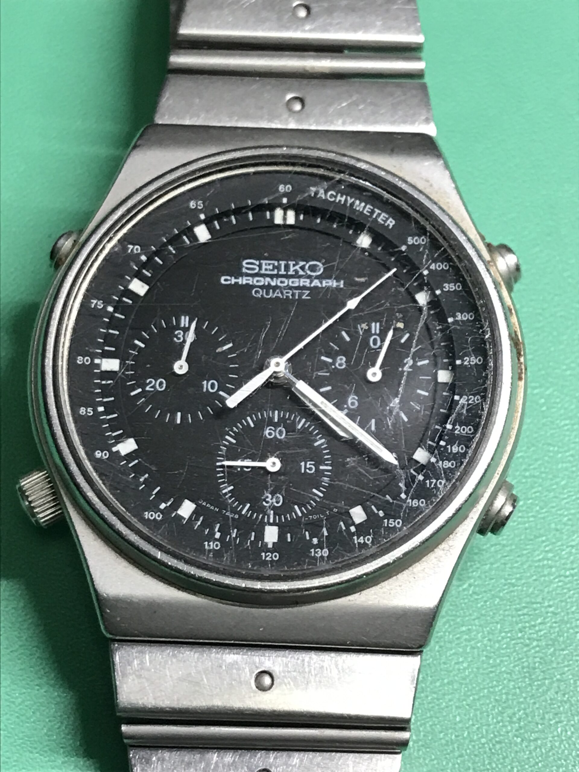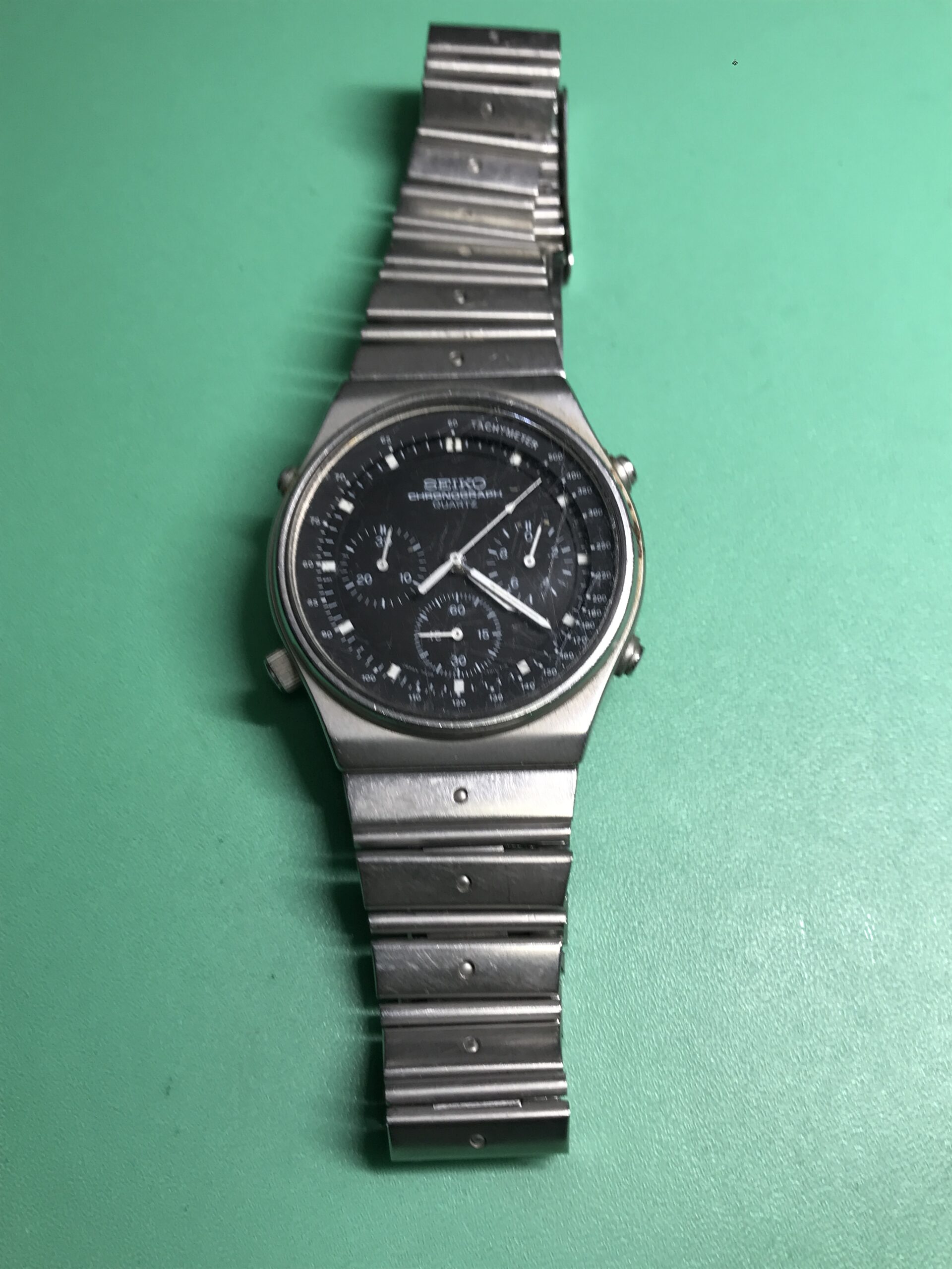 お預かりした時計はセイコー スピードマスター、モデルナンバー7A28-701A、世界初のアナログクオーツクロノグラフです。