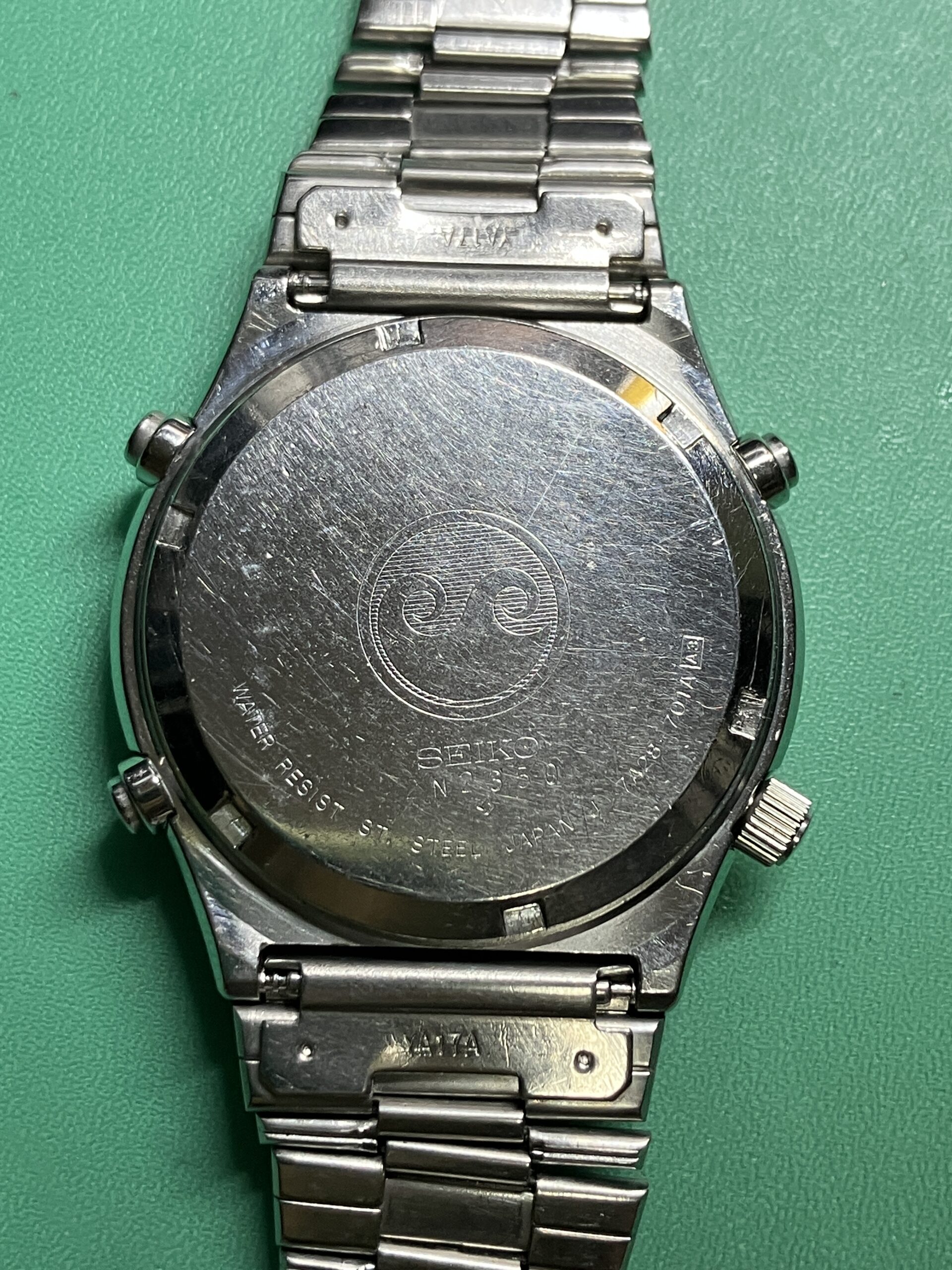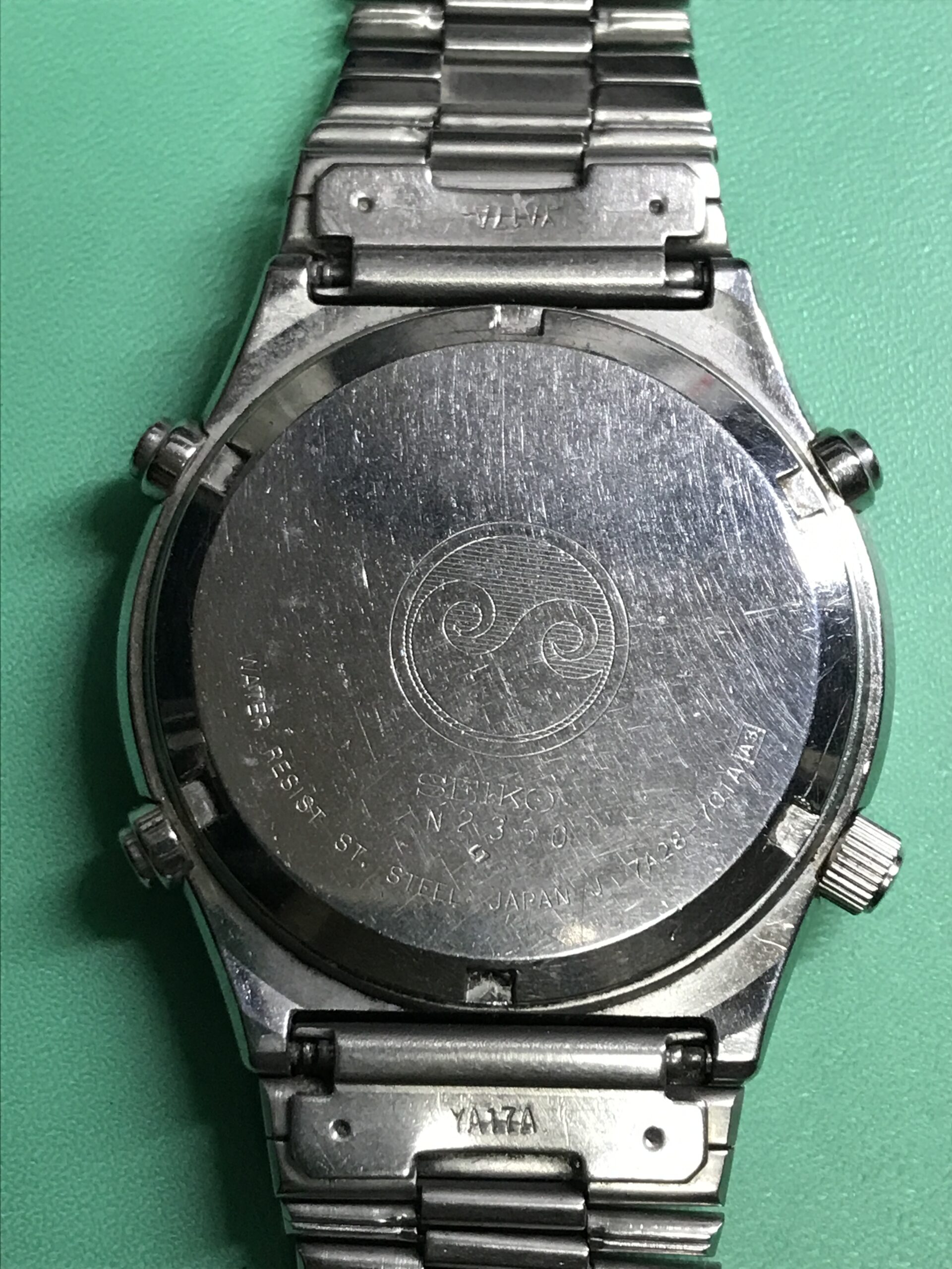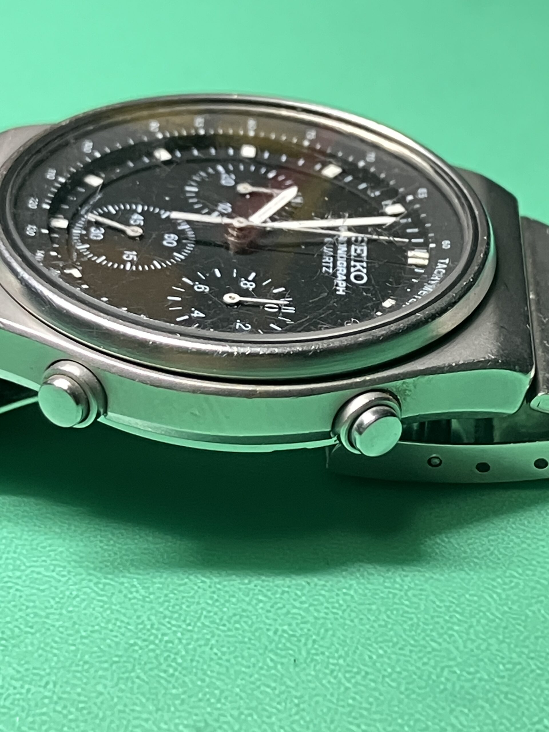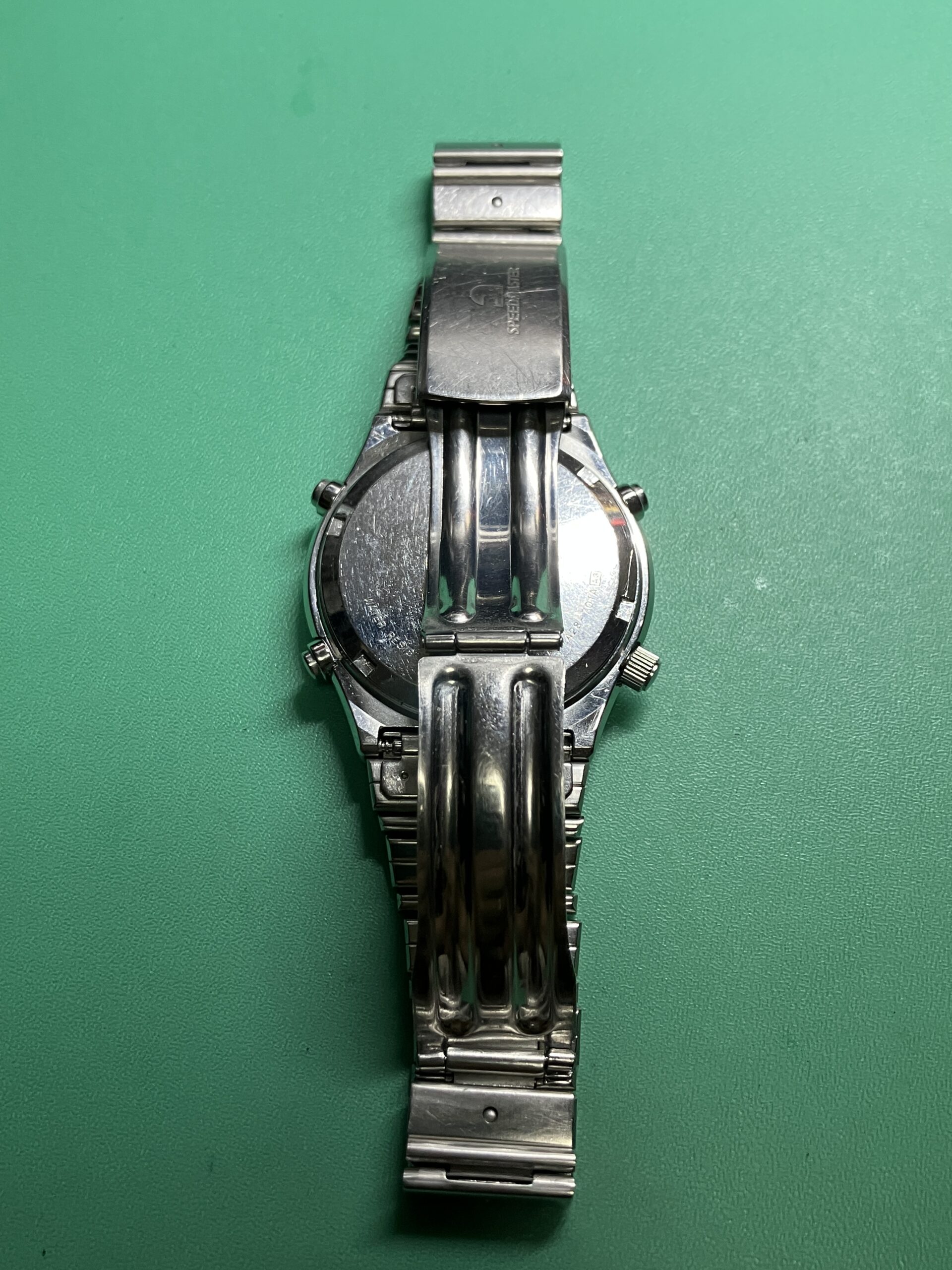 お預かりした時計はセイコー スピードマスター、モデルナンバー7A28-701A、世界初のアナログクオーツクロノグラフです。