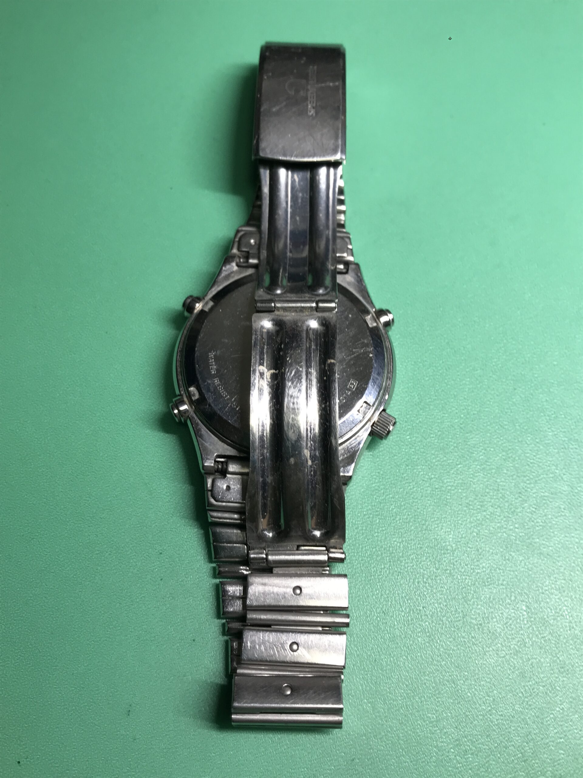 クロノグラフ機能は2時プッシュボタンでのスタート/ストップ、10時プッシュボタンでのラップ機能は稼働しますが、4時プッシュボタンのリセットが機能しない状態です。サビの除去と注油でボタンは動くようになりましたので復活かと思いましたが、内部の回路に問題があるようです。クロノグラフのリセット帰零についてはリューズの1段引きで戻りますので、これを利用してください。折角の機会だったので可能ならオーバーホールもされると良かったのですが、サビによるダメージ部の修復と主要部への注油もいたしましたので、またしばらくの使用は大丈夫かと思います。