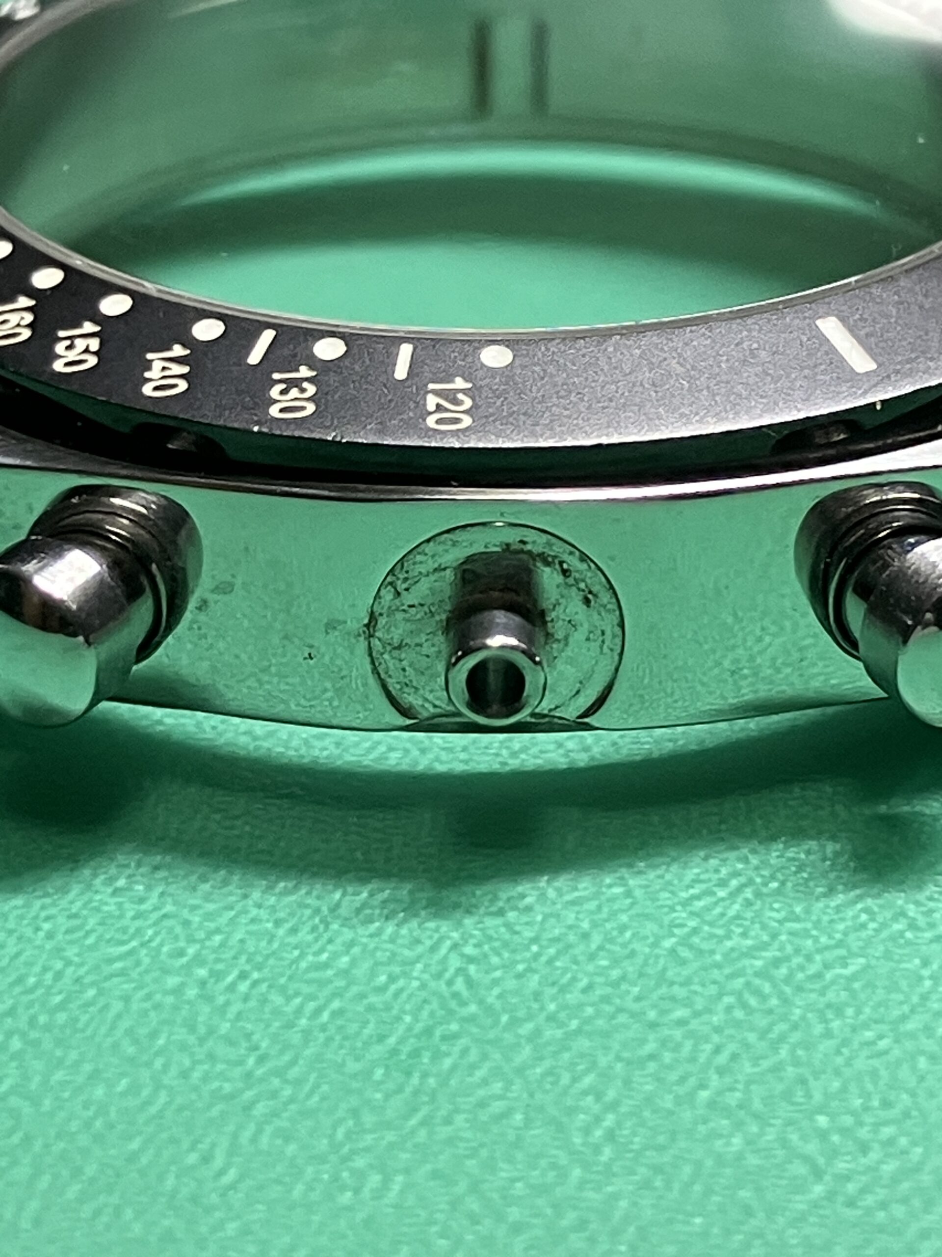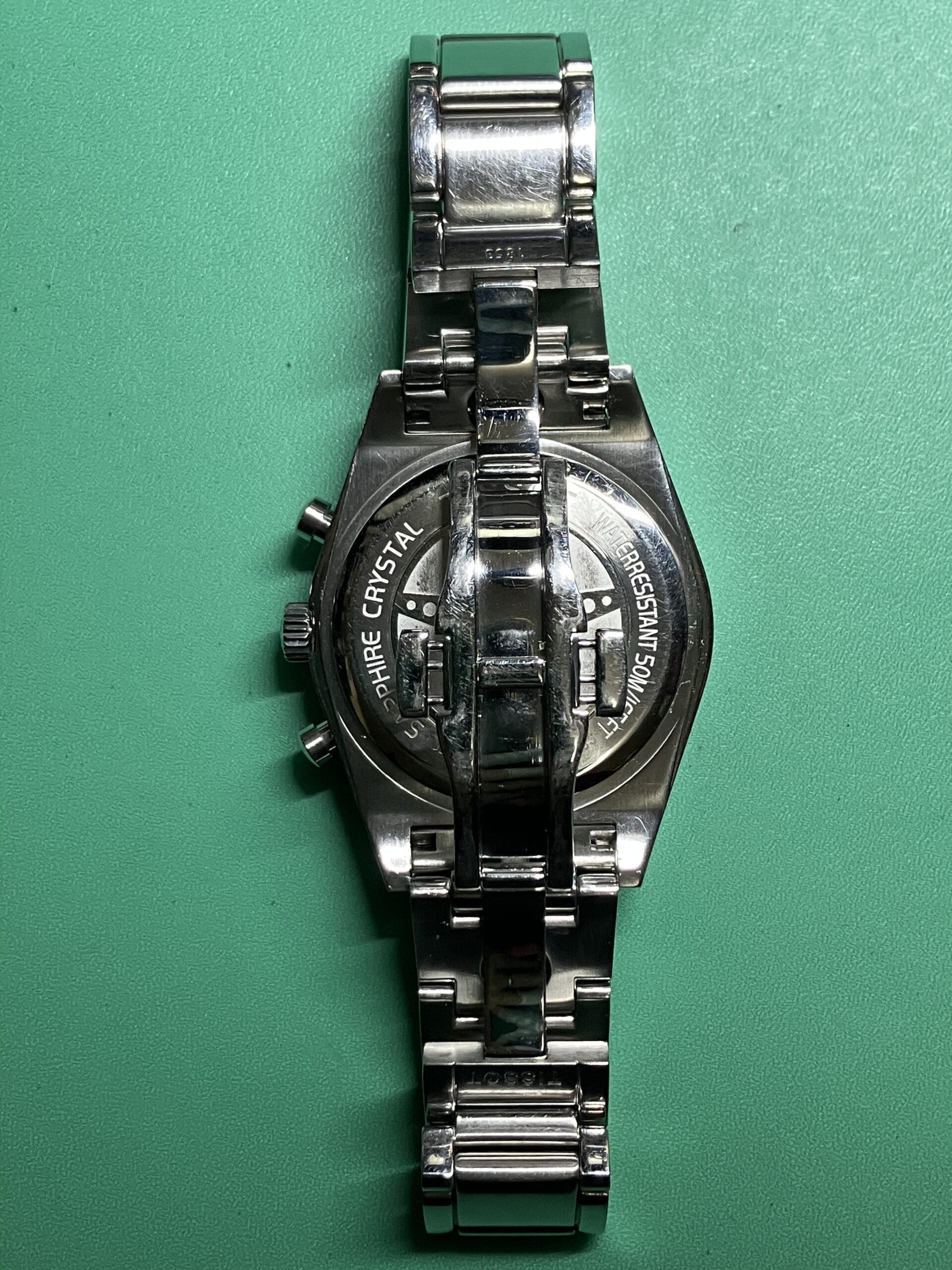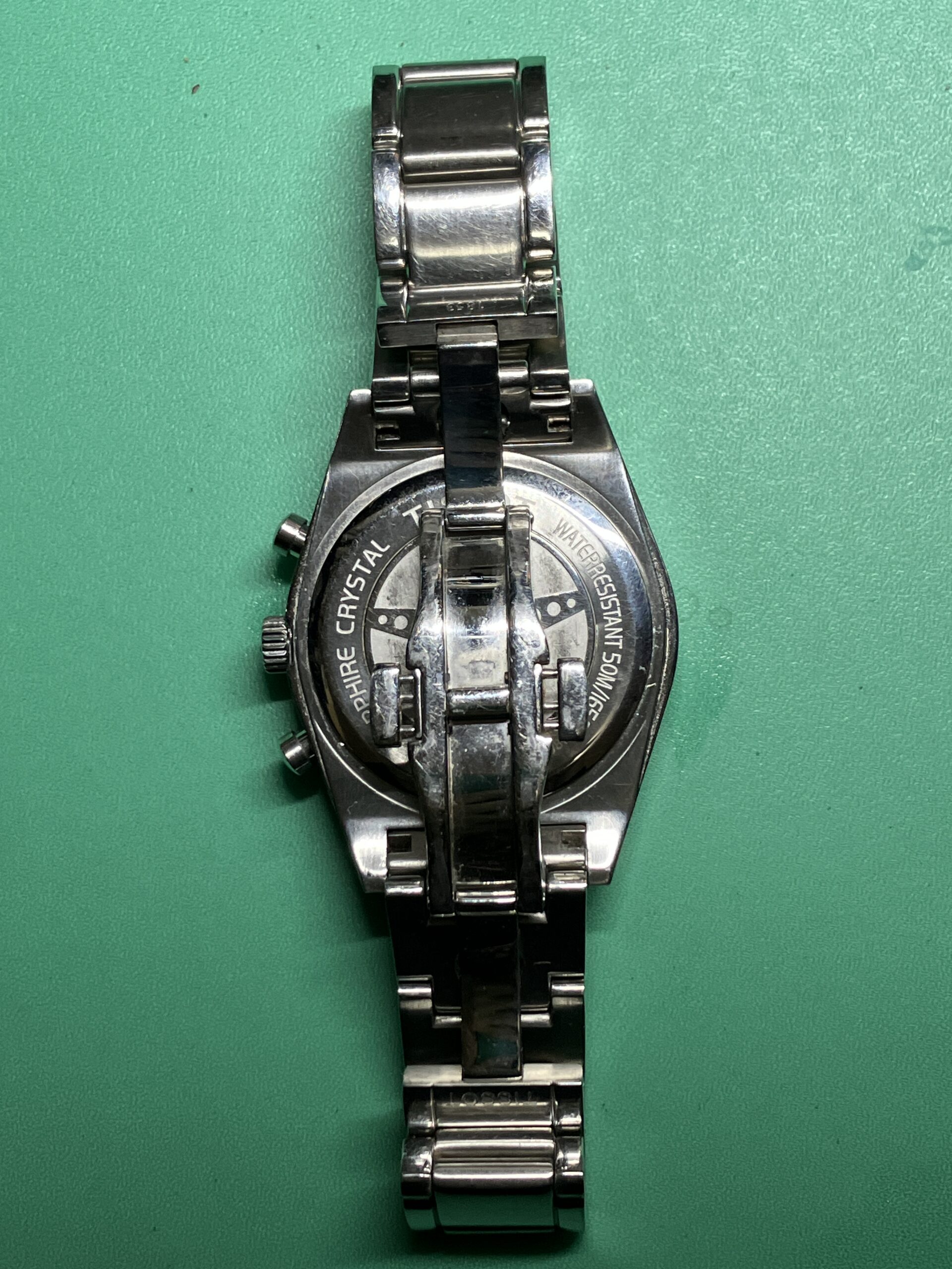 交換後はリューズ操作が正常に行えるようになり、時刻合わせ・クロノグラフ機能ともに問題なく復旧しております。クロノ秒針は9時位置から逆時計回りで、3時位置まで来ると9時に戻りますね。また5気圧防水機能も維持していることを確認しました。
