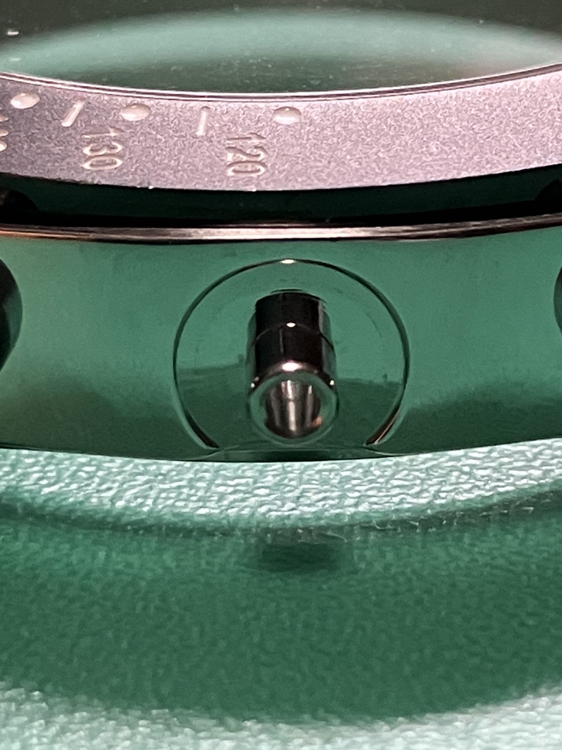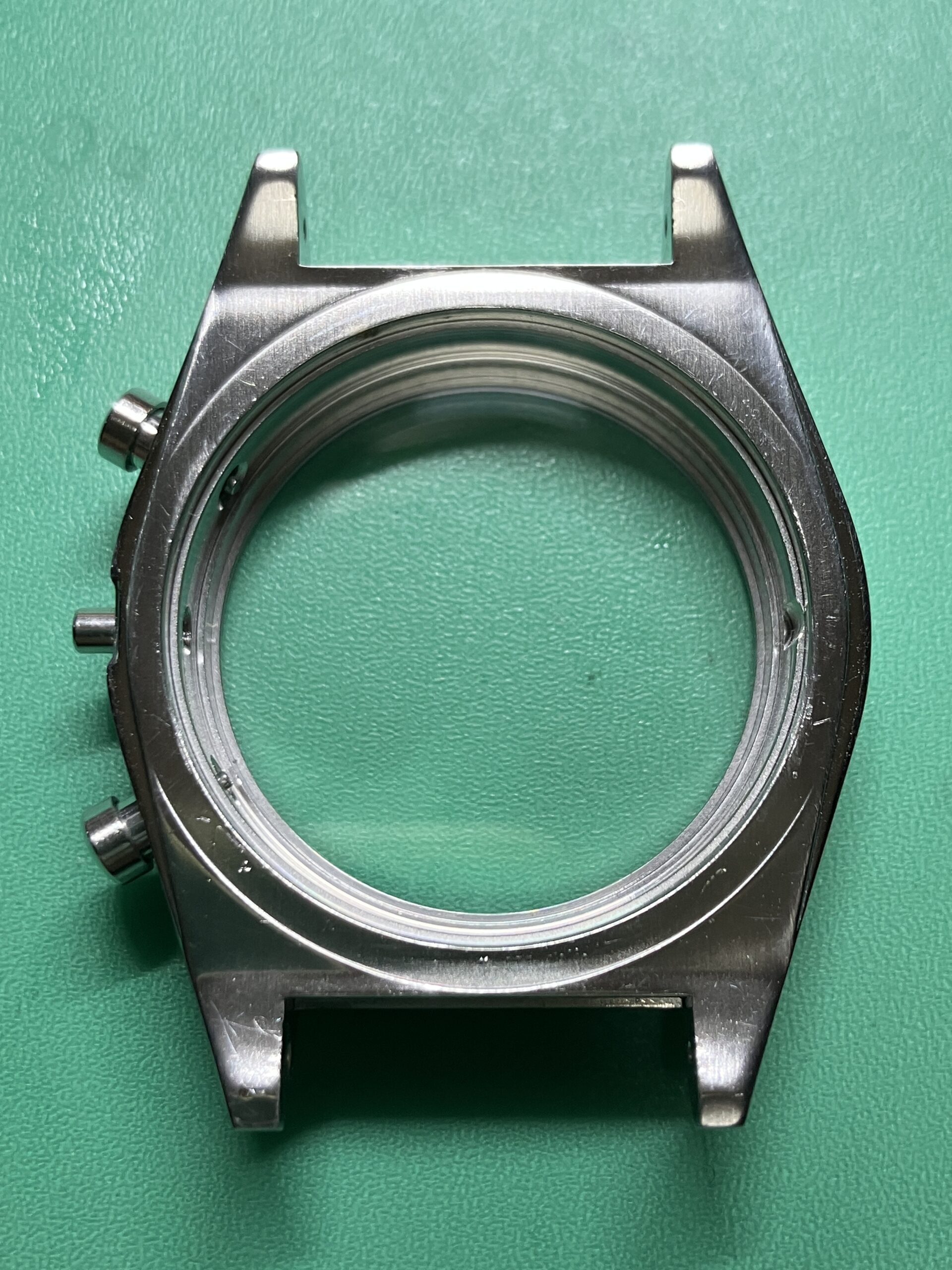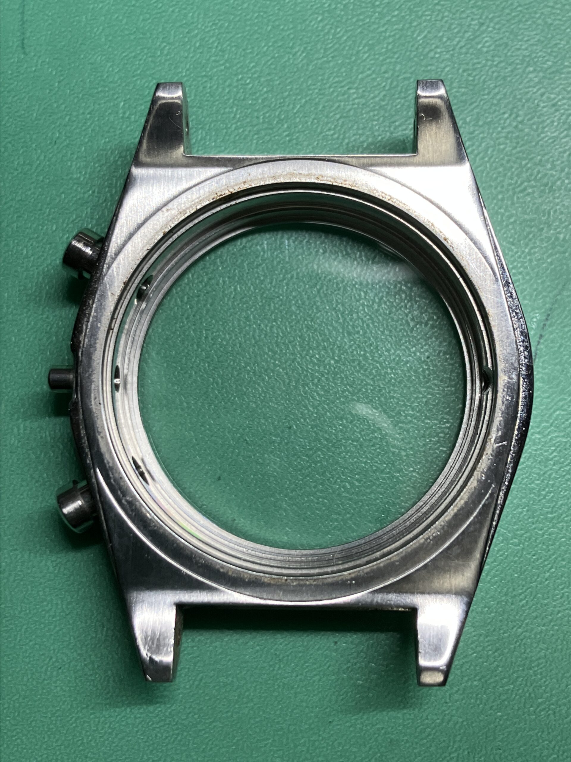 交換後はリューズ操作が正常に行えるようになり、時刻合わせ・クロノグラフ機能ともに問題なく復旧しております。クロノ秒針は9時位置から逆時計回りで、3時位置まで来ると9時に戻りますね。また5気圧防水機能も維持していることを確認しました。
