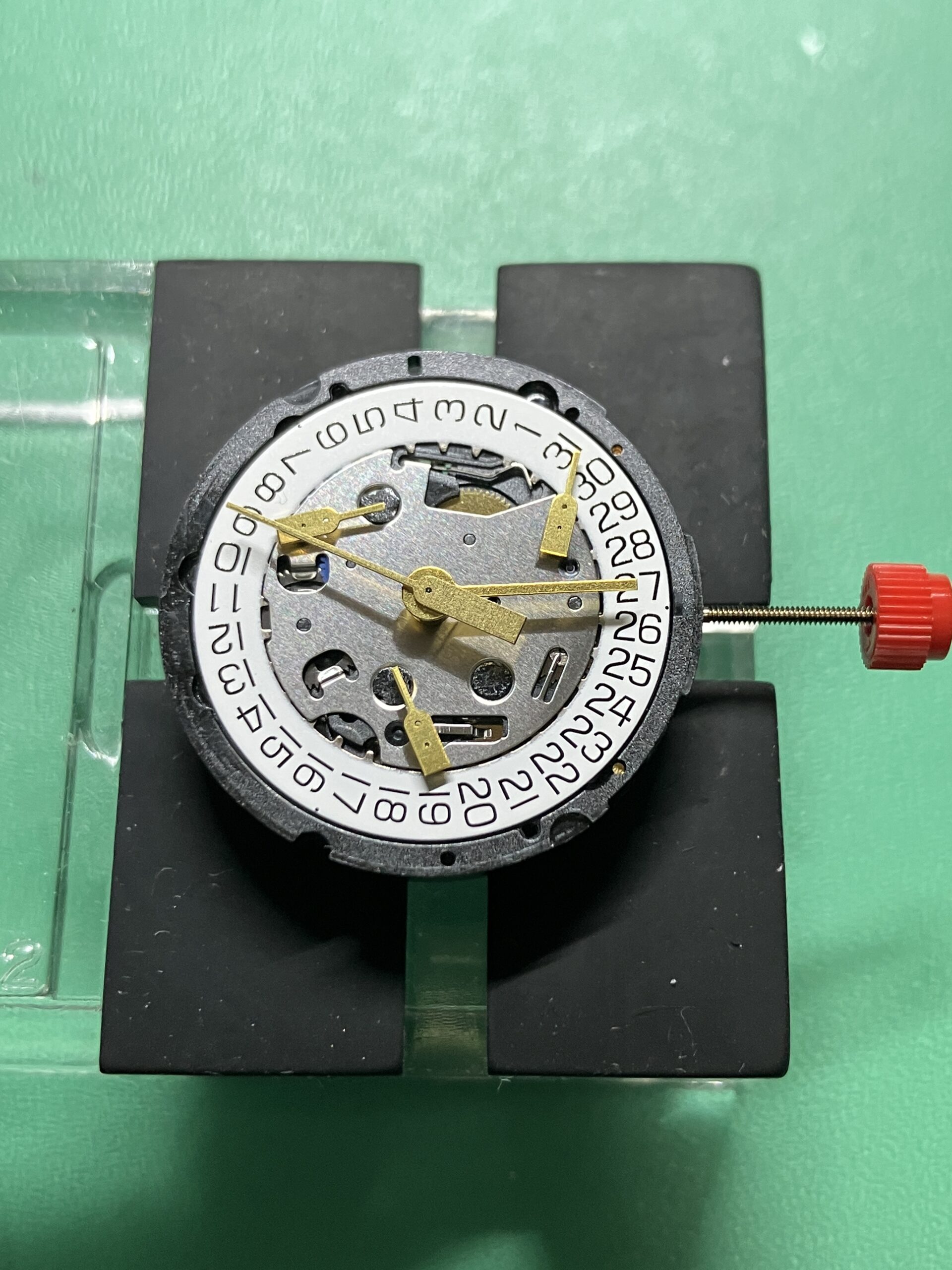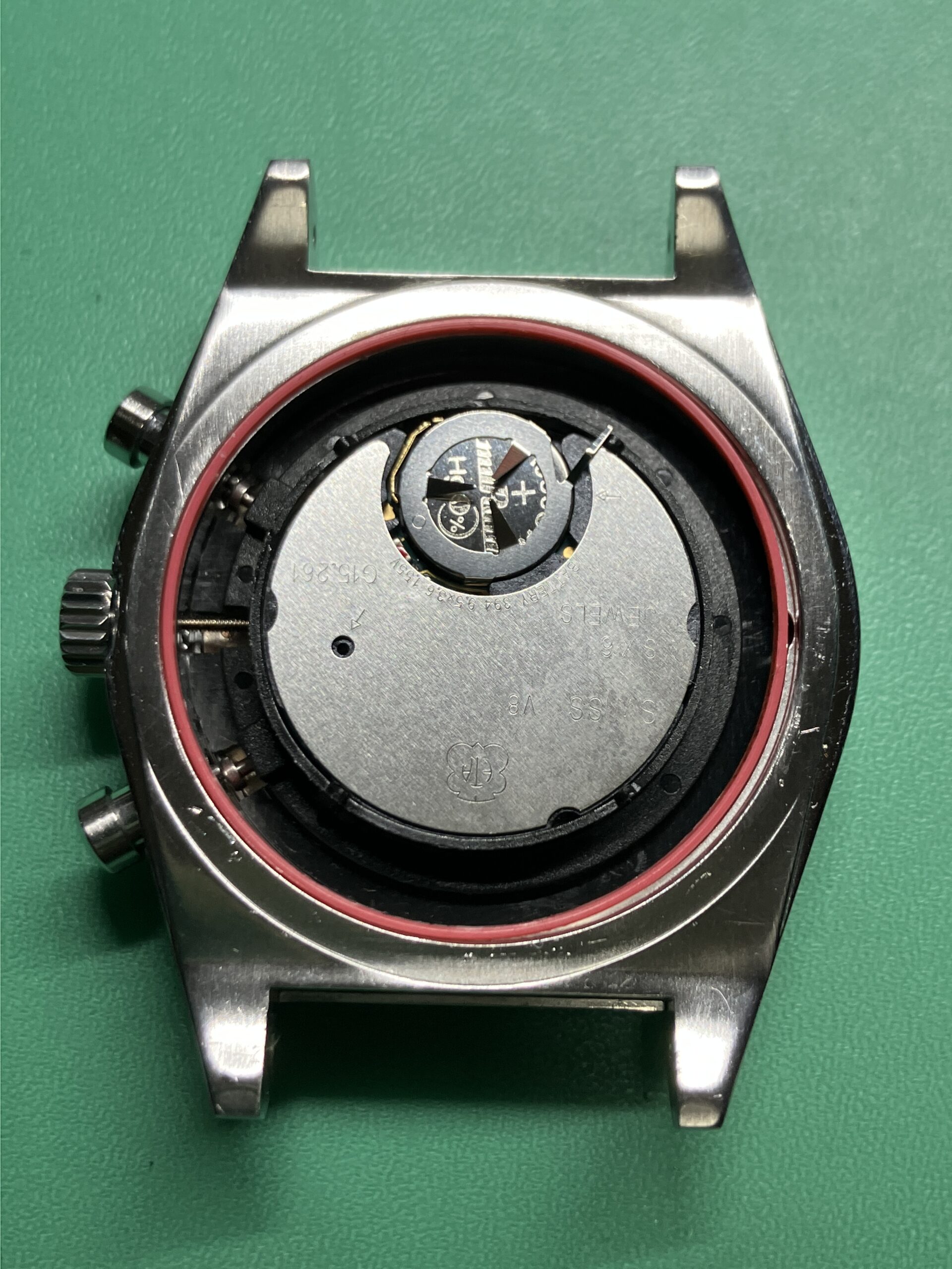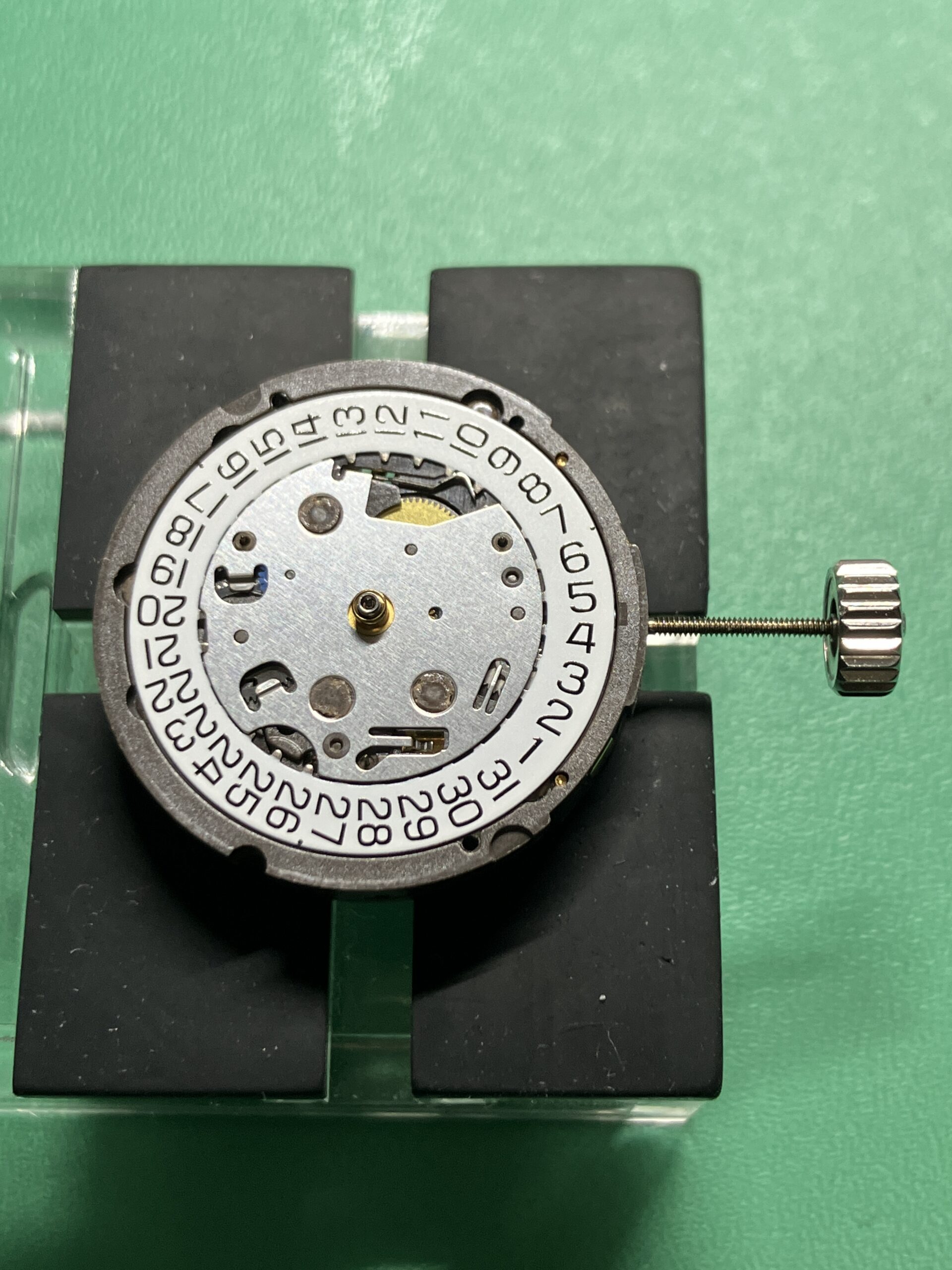 今回の不具合はムーブメント内部の切替機構の損傷・摩耗が原因と推測します。国内に同型ムーブメントの在庫がなく海外よりムーブメントを調達し、交換作業を行いました。