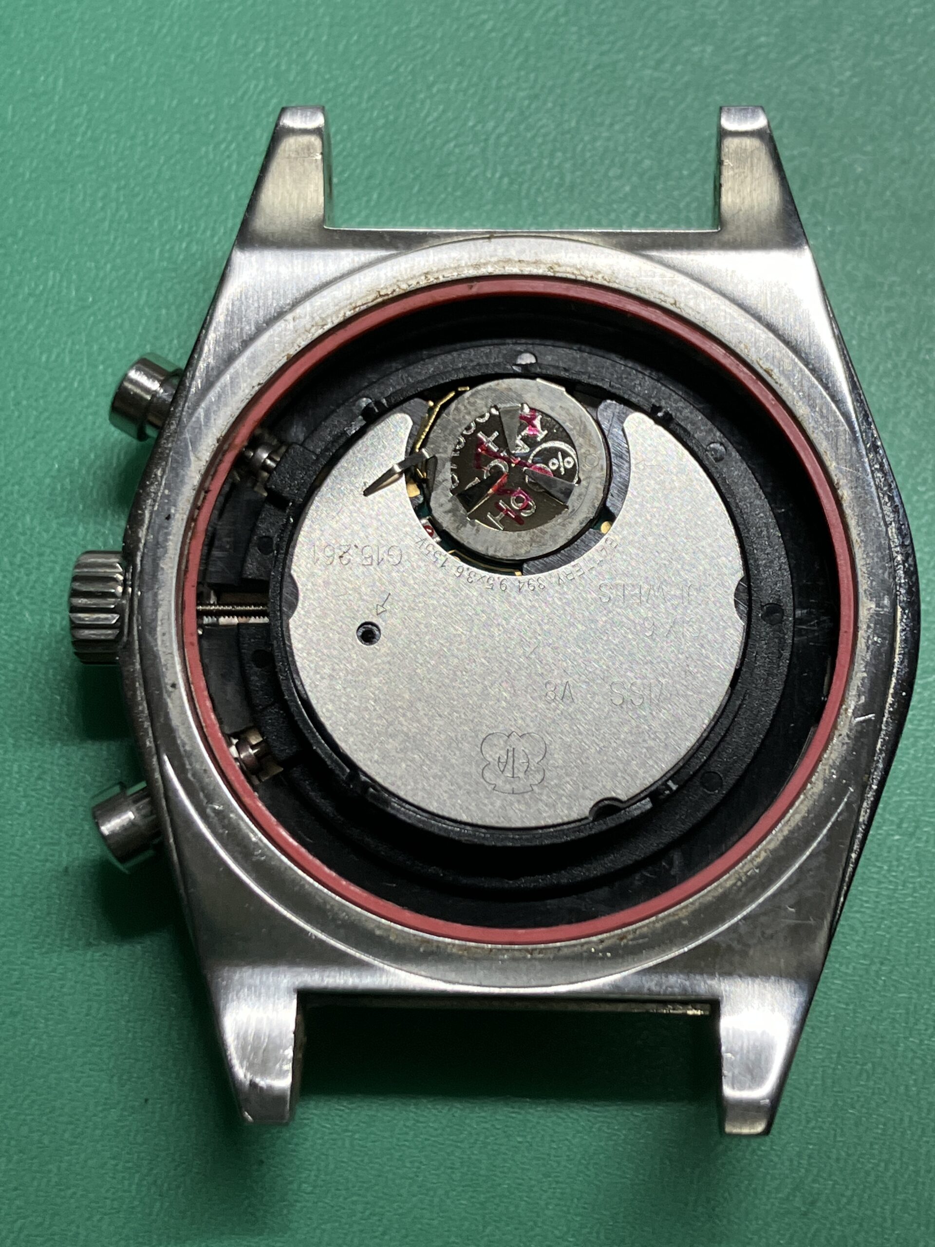 確認したところ、やはりリューズを引いても時刻修正位置に切り替わらず、巻真操作が正常に伝達されない状態となっておりました。本機にはETA社製クオーツクロノグラフムーブメントETA G15.261 が搭載されております。