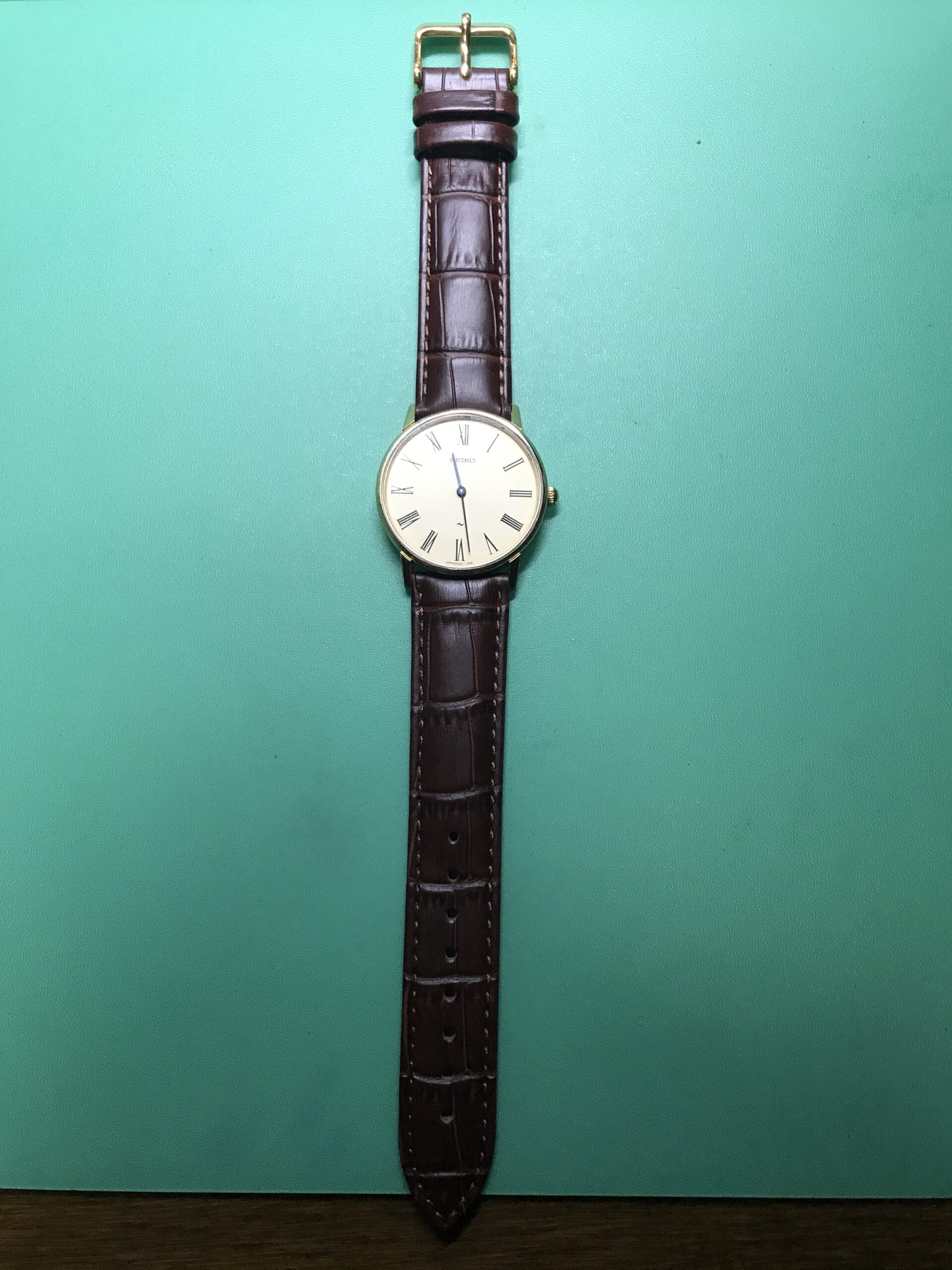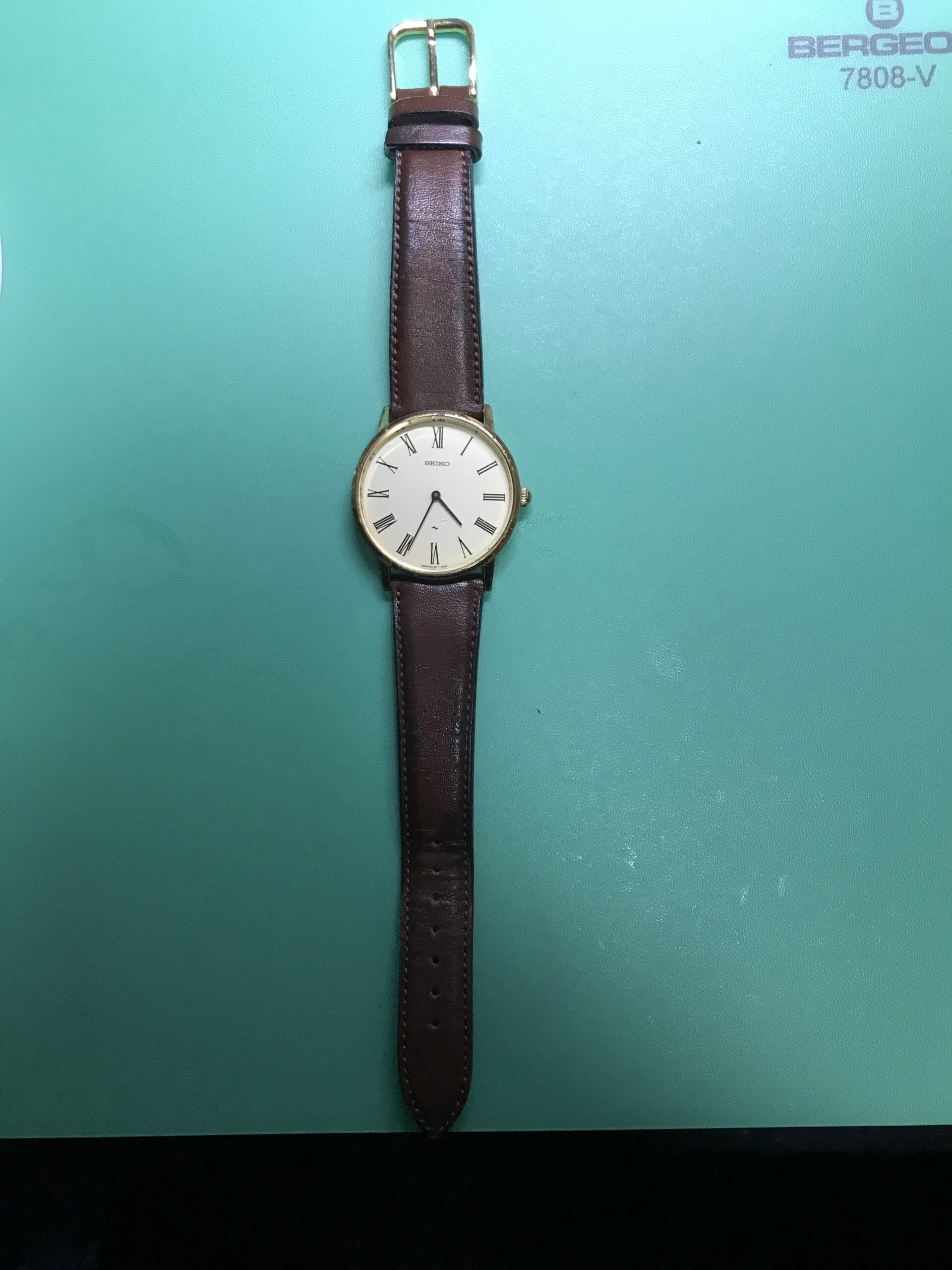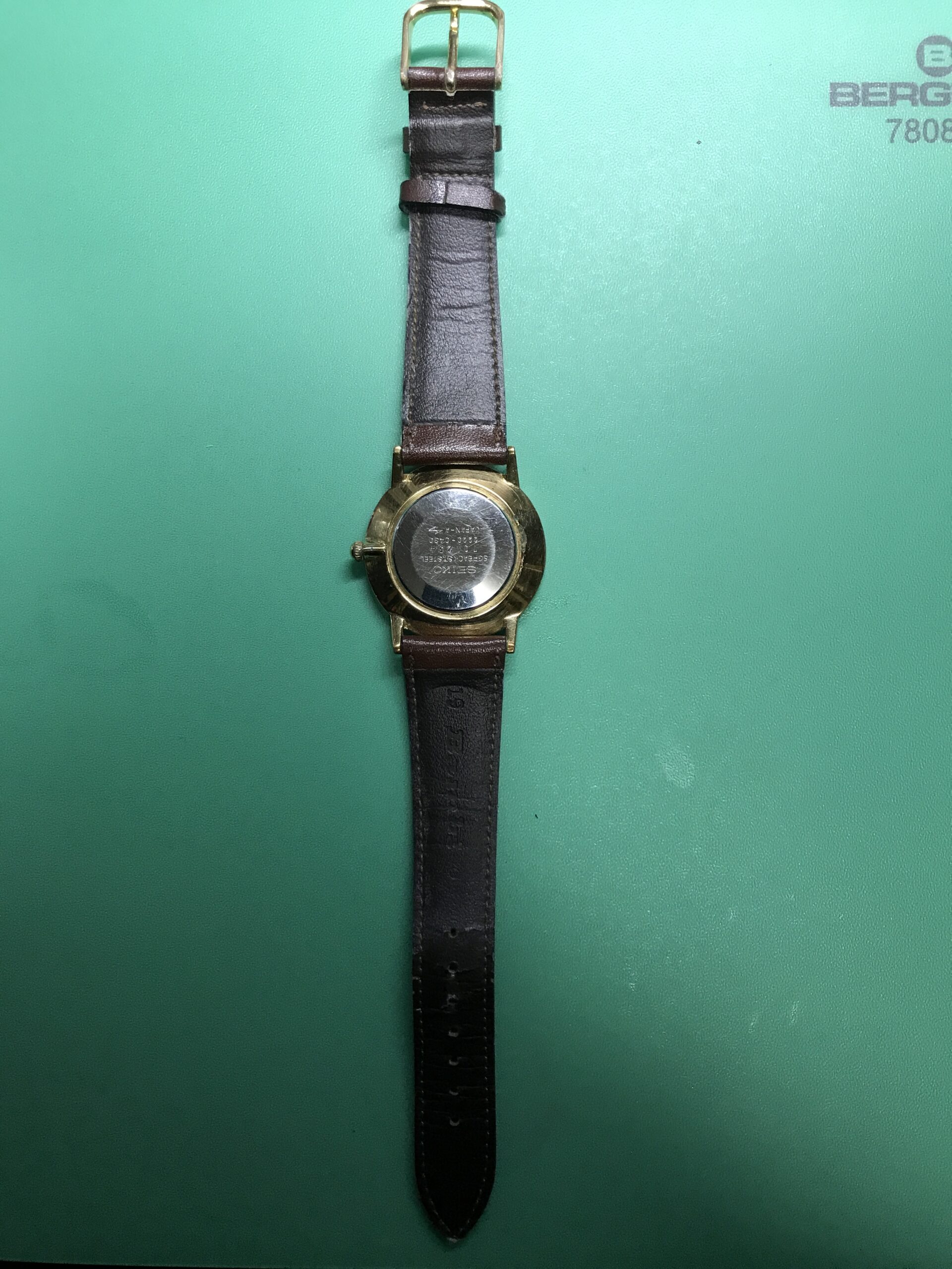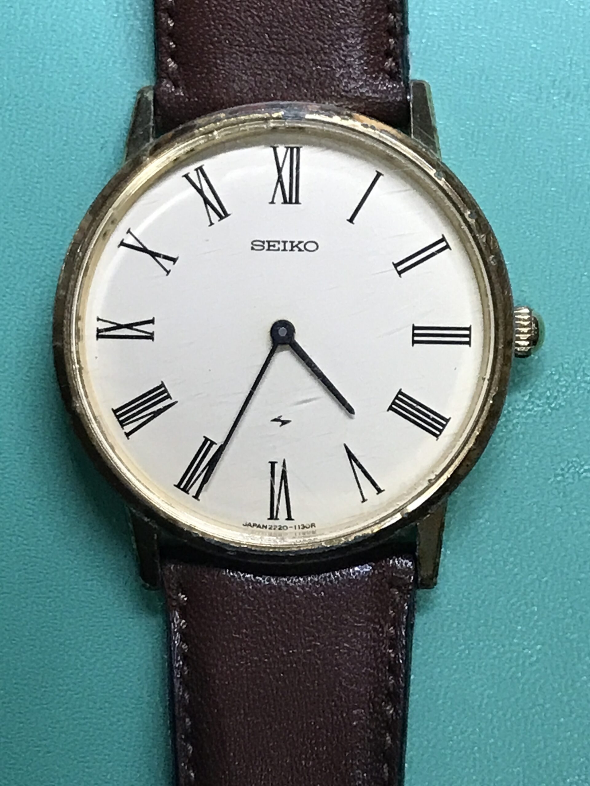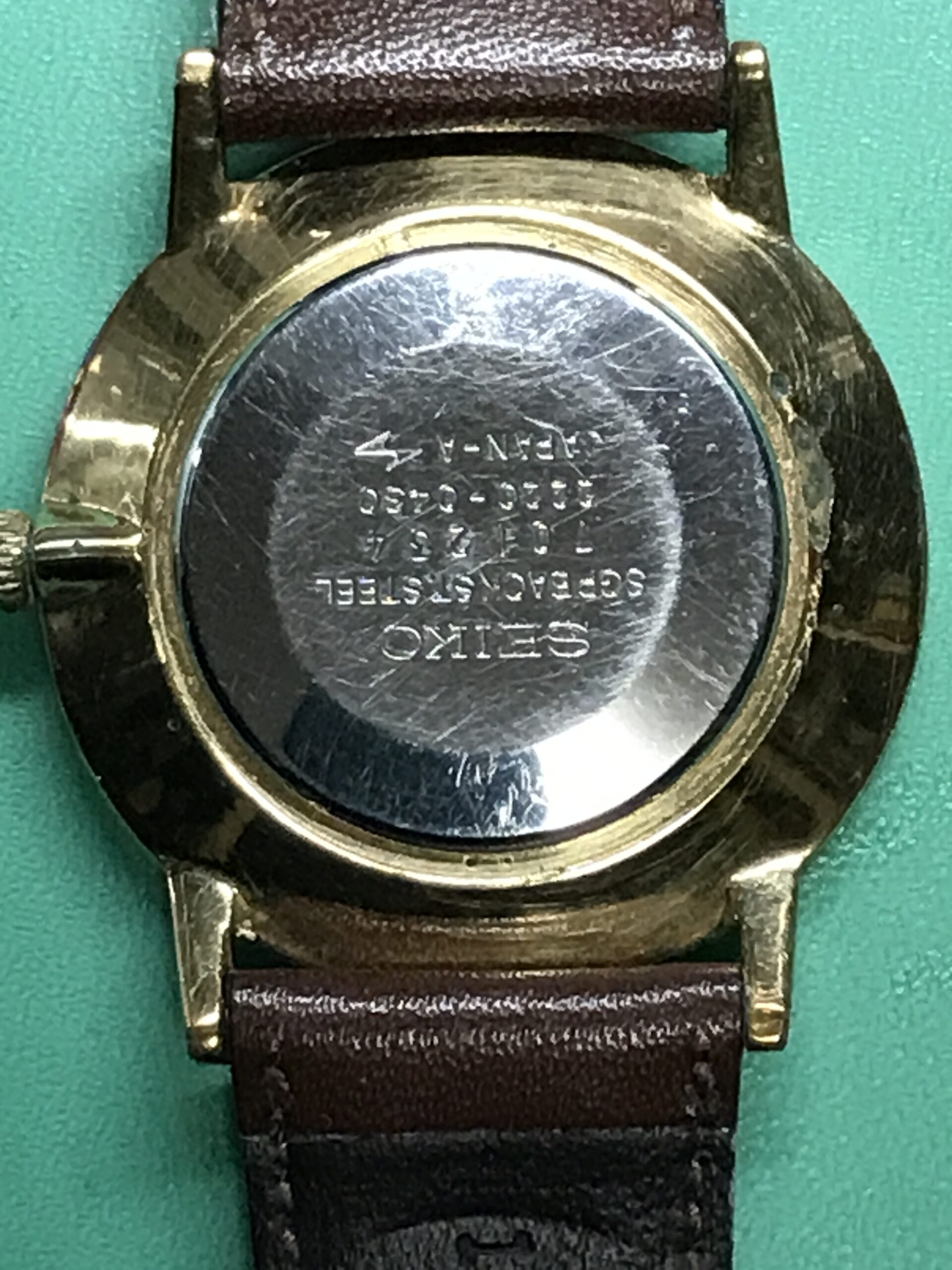 これはお預かり品ではなく、私の時計です。高校に入学した時に買ってもらったものです。1977年ですので、今から48年前になりますね。その頃は腕時計といえばすでにクオーツが主流でしたが、私はなんとなく機械式の時計に憧れを持っていたのですね。